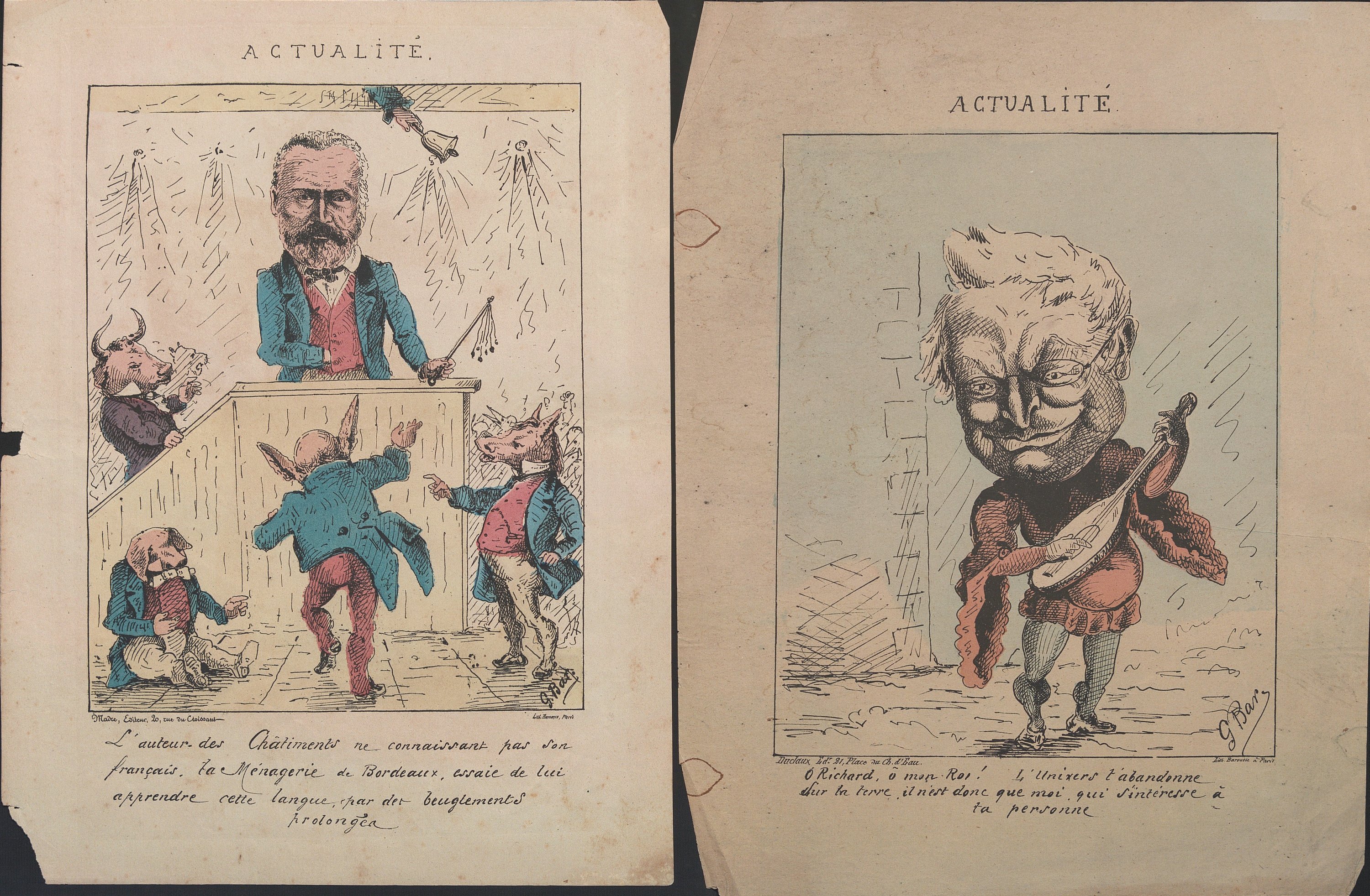 Charles Vernier (1813-1892), 6 feuilles volantes, 35 x 27 cm: n°13 Le contraste ; n°13 Napoléon et Frédéric ; n°14 Prenez mon ours ; n°15 Le futur gouverneur de Paris ; n°16 Avis aux électeurs La Bête à deux faces ; n°17 Mon p’tit neveu.