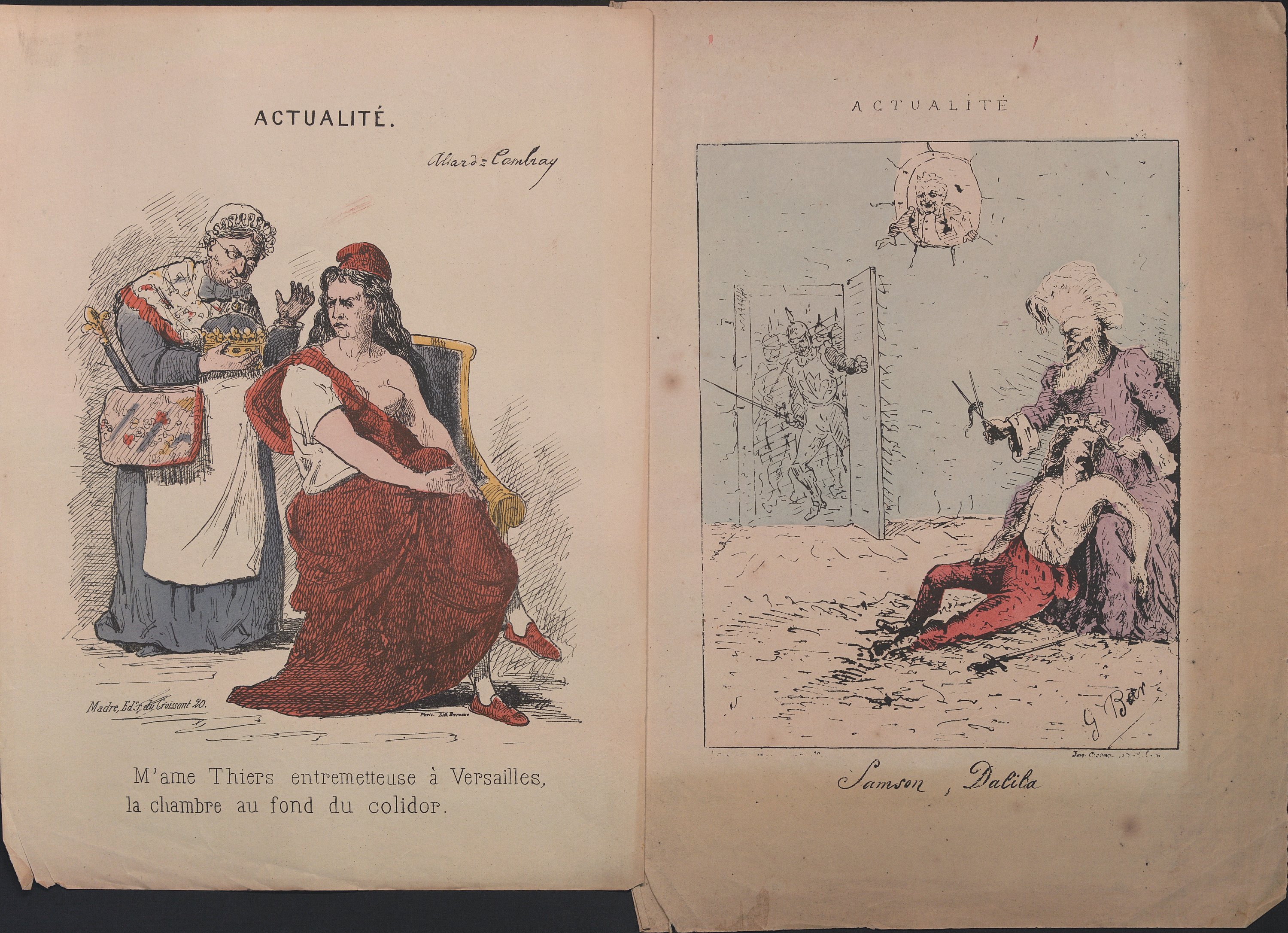 Célestin Allard-Cambray (1840-1881), 3 feuilles volantes: Actualité - Vois-tu fieu! sous la République si nous engraissons un cochon c’est nous qui le mangeons Un roi c’est un cochon que nous engraissons et qui nous dévore, 33 x 25 cm (non signée) ; Actualité - Ces choses-là n’arrivent qu’à moi?... encore un mois de famine et je me retirais des affaires, 33 x 25 cm ; Actualité - M’ame Thiers entremetteuse à Versailles, la chambre au fond du colidor, 36,5 x 27 cm ;