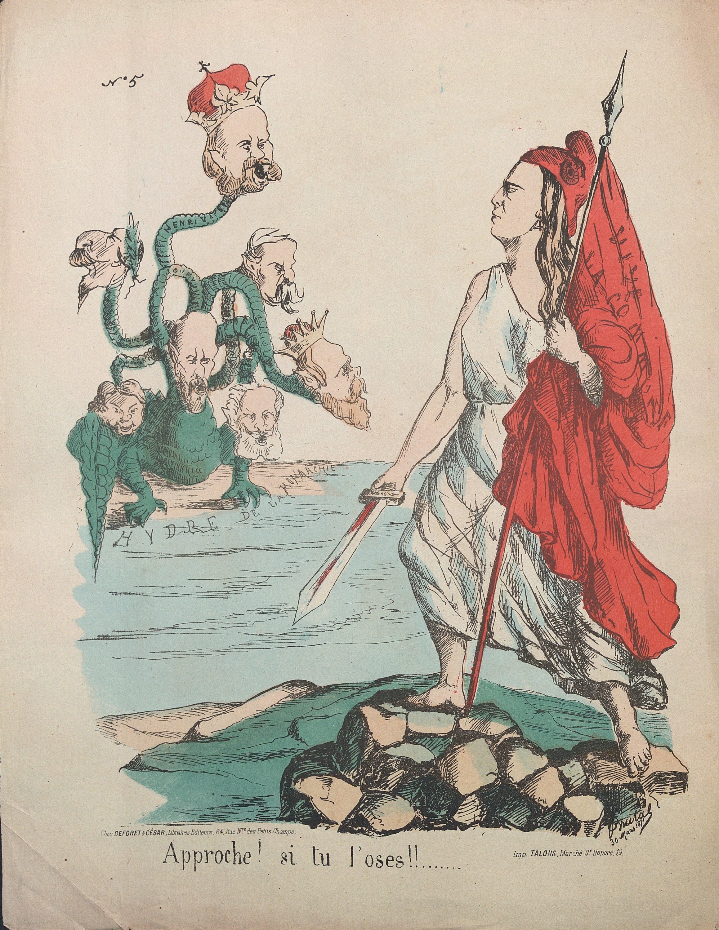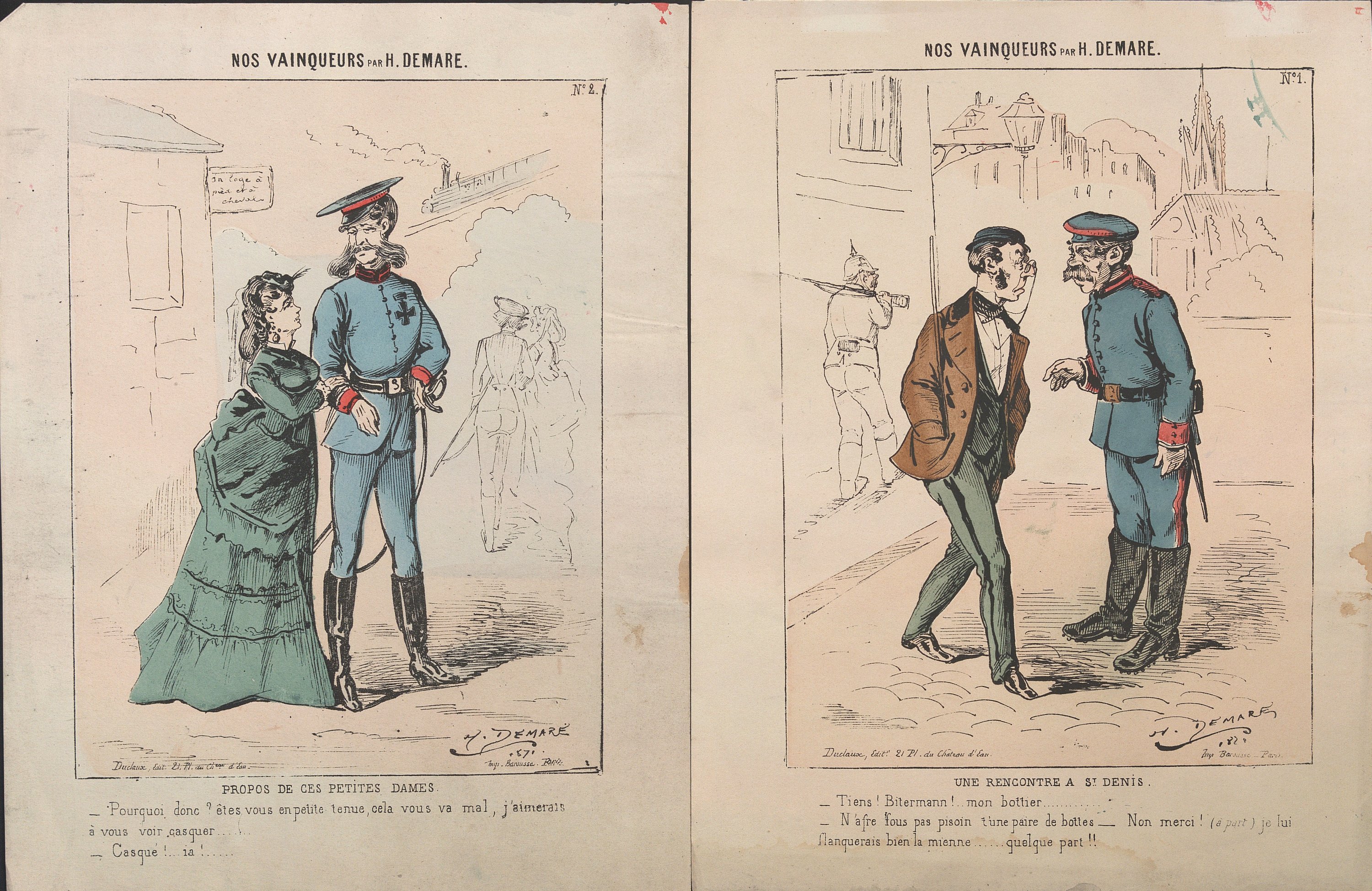 Henri Demare (1846-1888), 4 feuilles volantes: 3 ex. série Nos vainqueurs: n°1, 2 et 4 (sur 4), 32 x 24 cm ; A Saint-Denis, les Drolesses, 36 x 27 cm (non signée, attr. à).