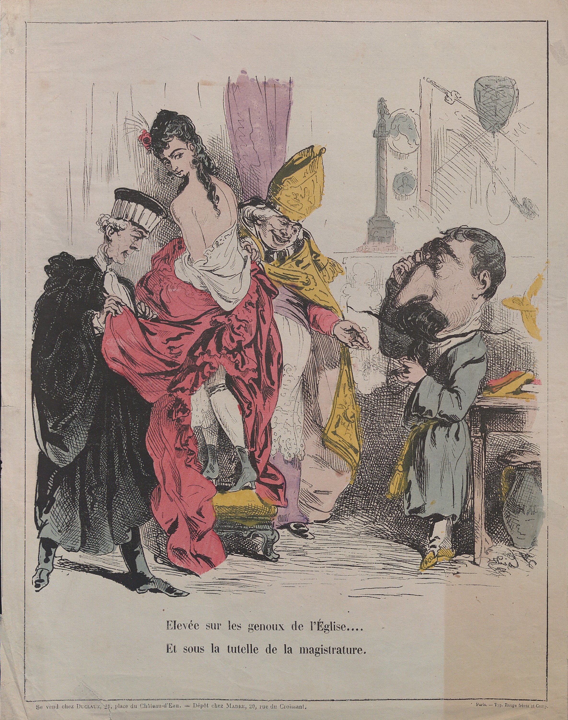 Victor Coindre (1816-1893), 2 feuilles volantes: Elevée sur les genoux de l’Eglise et sous la tutelle de la magistrature, 32 x 25 cm (attr. à) ; J’ai du cœur, 40 x 26,5 cm ;