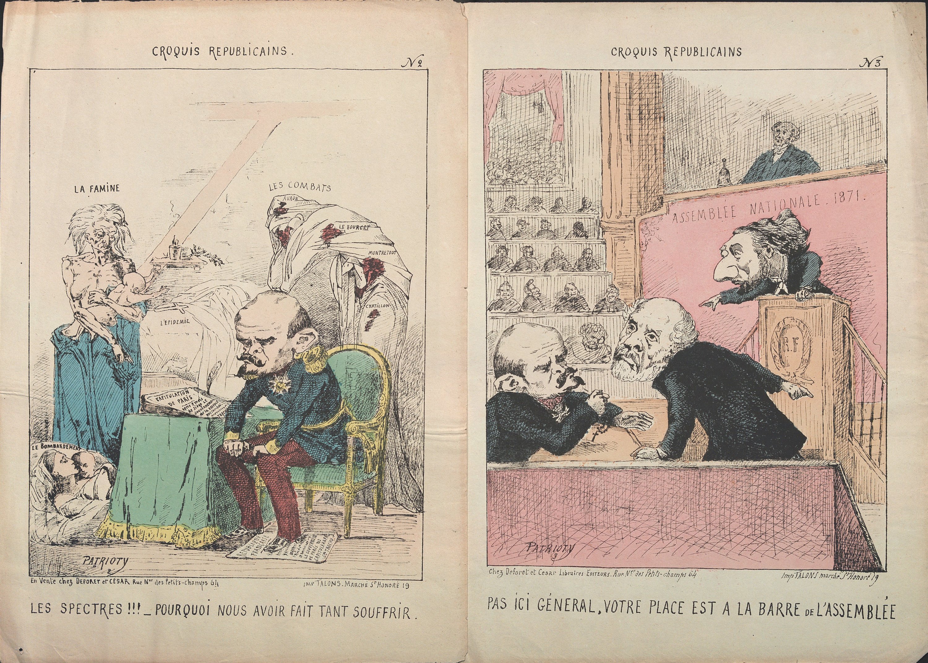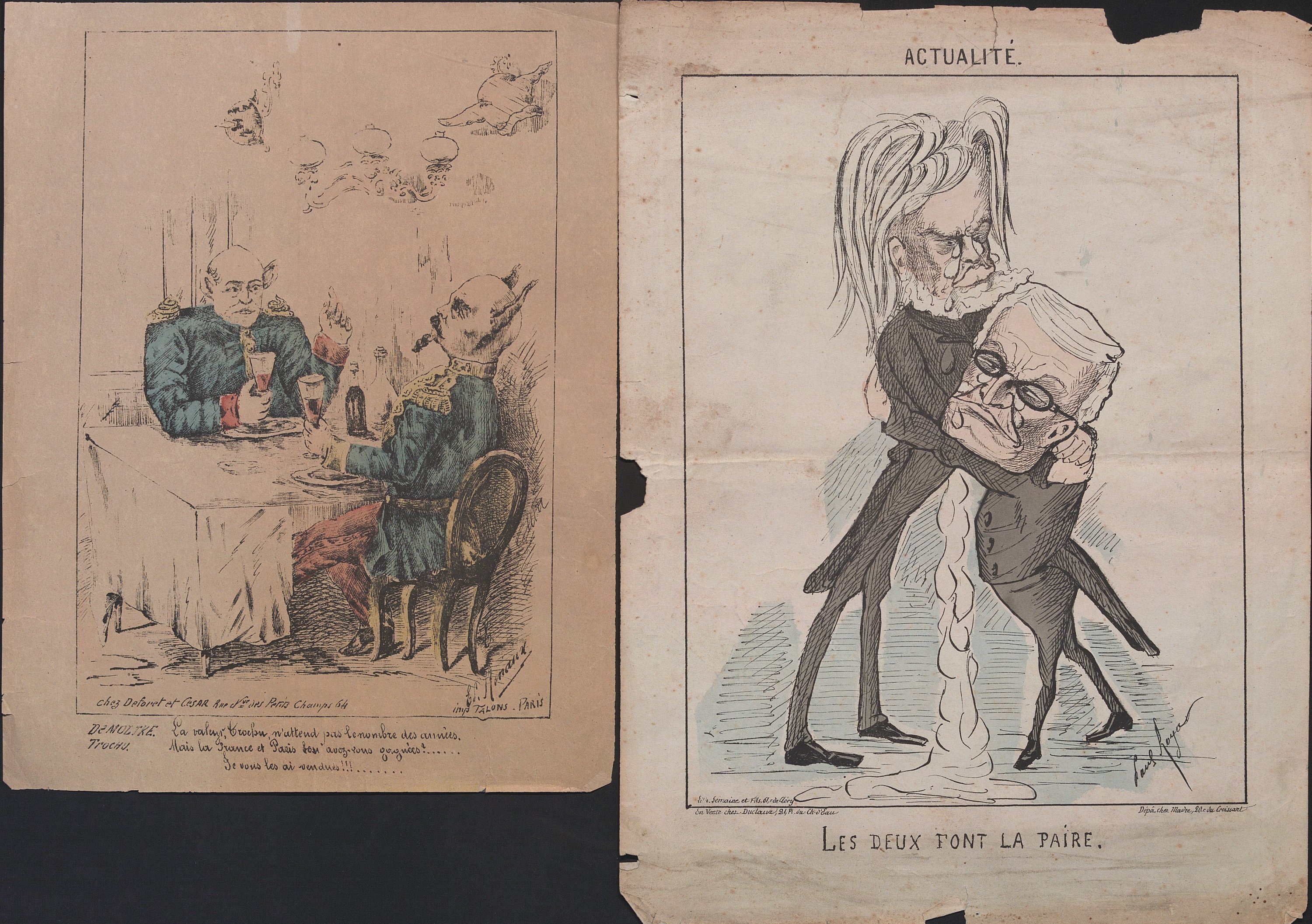 Henri Boutet (1851-1919) dit Paul Roga, 3 feuilles volantes, env. 32/35 x 27 cm: Les deux font la paire [portrait-charge de Jules Favre et Adolphe Thiers] (manques en marge, légères tâches) ; Maître Grévy [portrait-charge de Jules Grévy, président de l’Assemblée nationale] ; Jules Vallès, Le Cri du Peuple! [Député de la Commune de Paris et fondateur du journal Le Cri du Peuple] (manque en marge à droite) ;