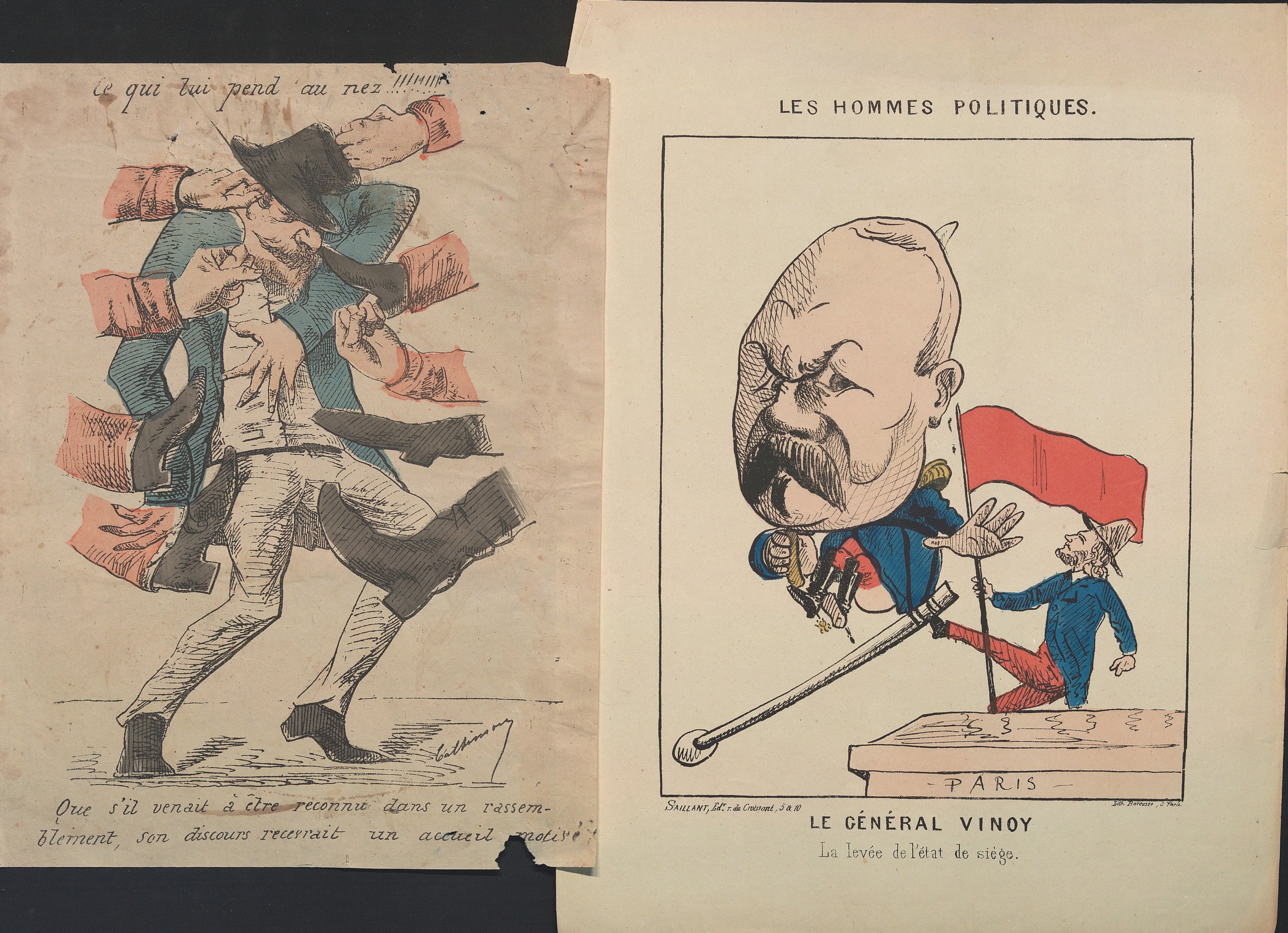 Paul-Eugène Mesplès (1849-1924), 2 feuilles volantes: Les hommes politiques Le général Vinoy, la levée de l’état de siège, 36 x 27,5 cm (attr. à) (petites déchirures en marge) ; Garnier Pagès, 32,5 x 24,5 cm.