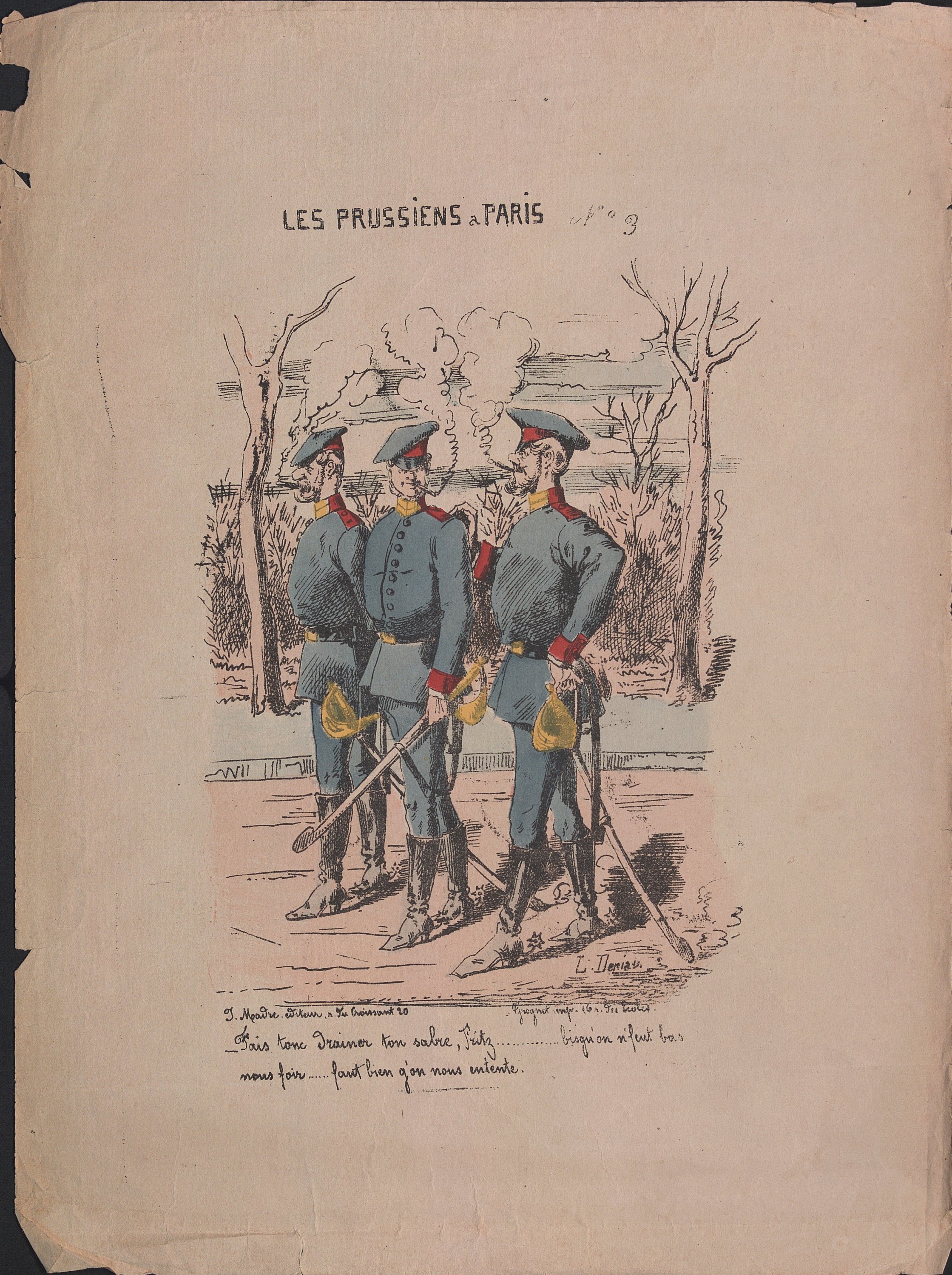 L. Deniau, n°3 Les Prussiens à Paris (sur 6), 39 x 28 cm (petites déchirures et qqs manques en marge) ;