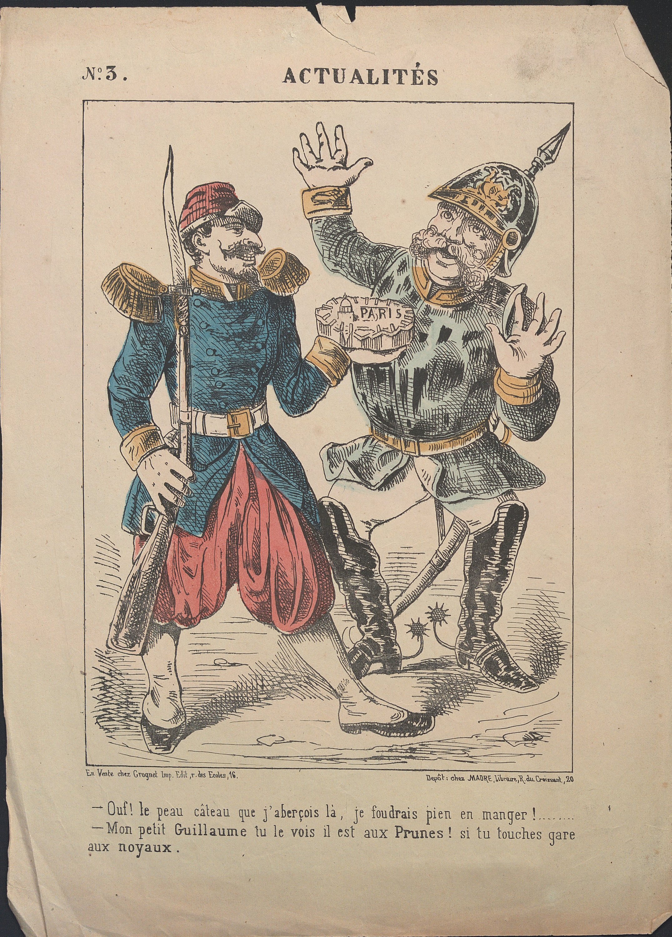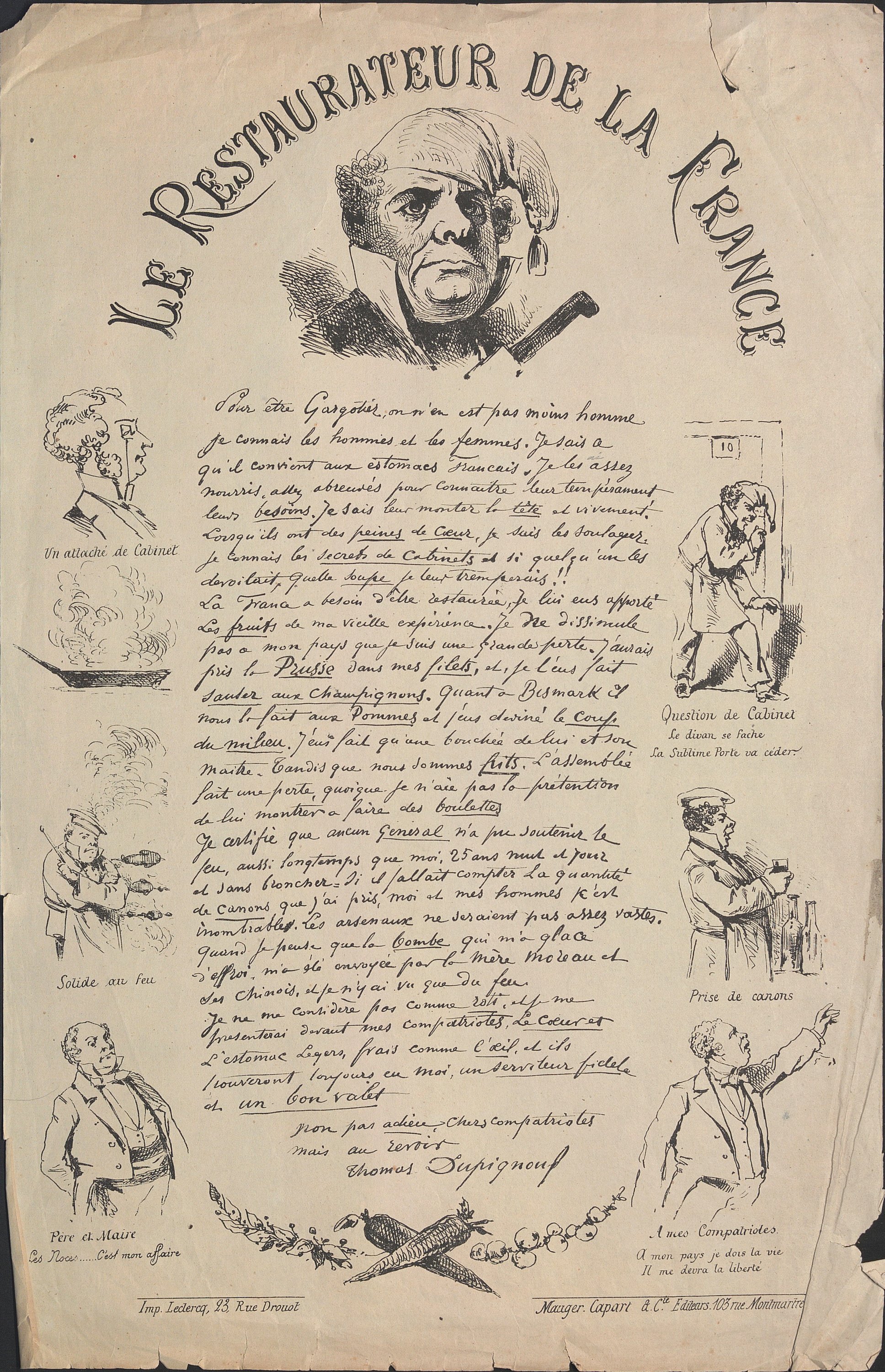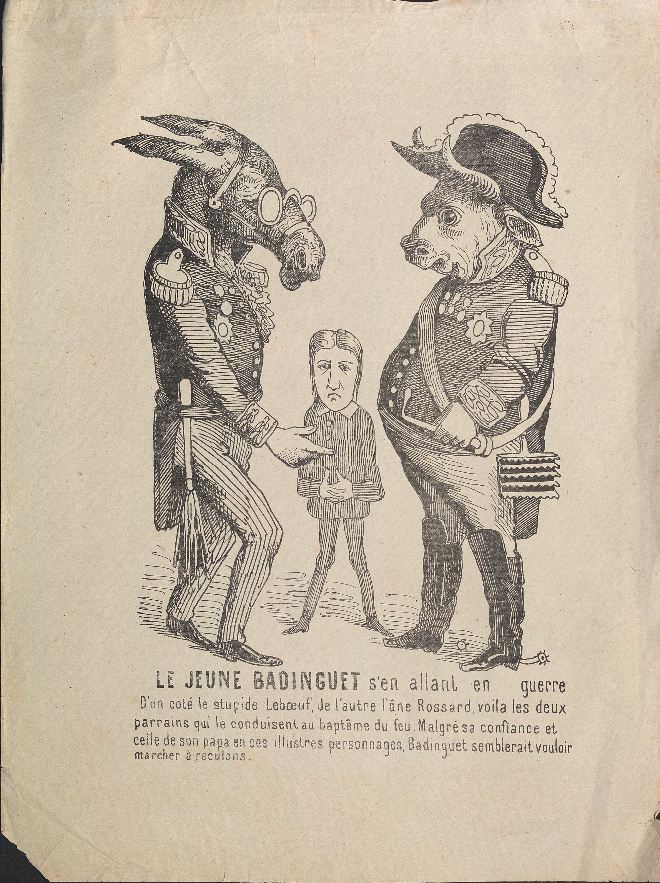 Anonymes, 6 feuilles volantes, rarissime: n°3 Actualités Le gâteau aux prunes et le kaiser Guillaume, 38,5 x 28 cm (petites déchirures en marge) ; Les figurants illustrés, 31,5 x 24,5 cm ; Le restaurateur de la France, 43 x 27,5 (petites déchirures et plis en marge) ; Dumollard, Badinguet, Tropmann, 40 x 29 cm (déchirures et mques en marge) ; Badinguet utilisant ses loisirs au sevrage des bébés, 40 x 30 cm (plis) ; Le jeune Badinguet s’en allant en guerre, 40 x 30 cm (plis).