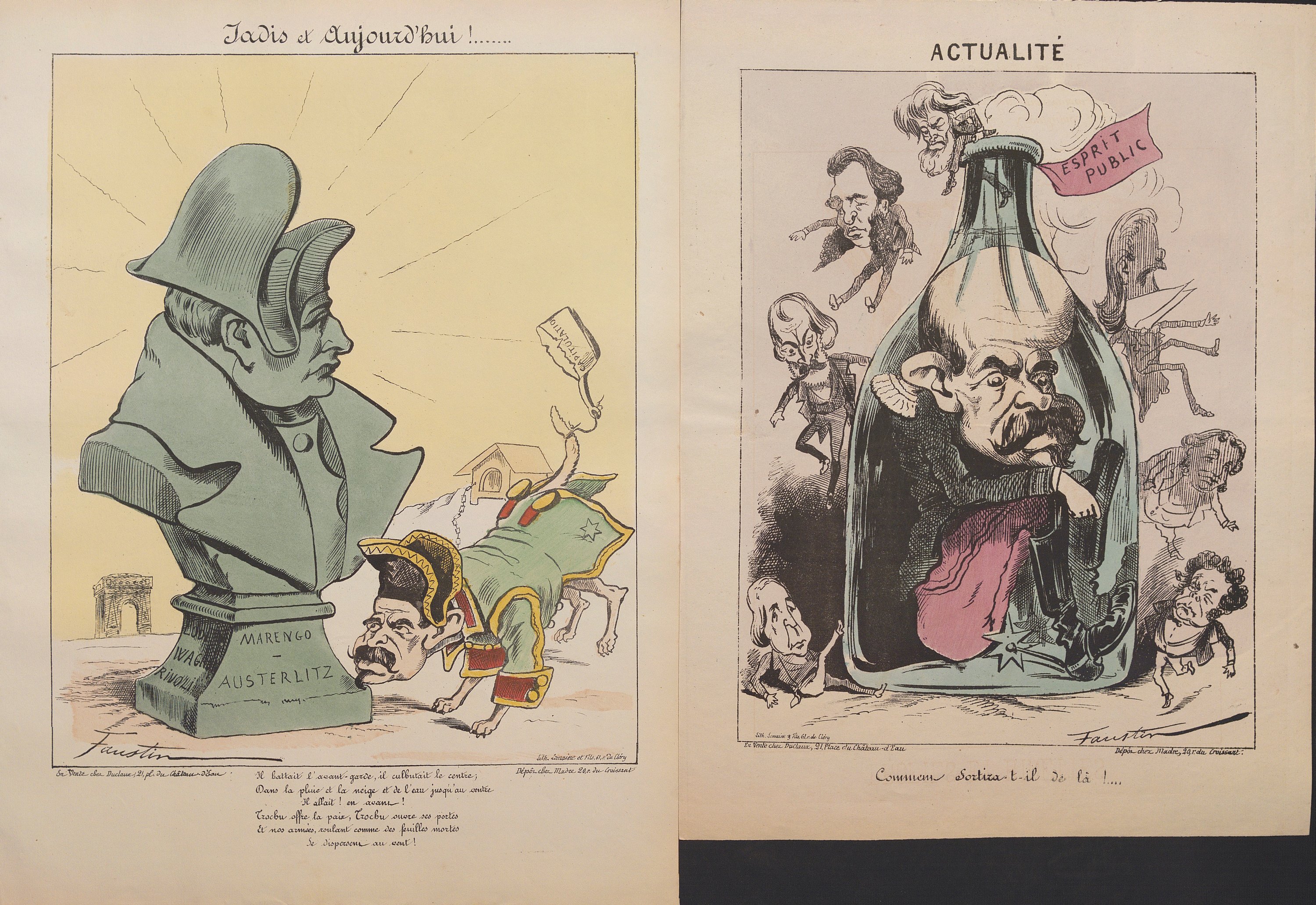 St Pierre et St Badingue (2 ex. dont 1 à marges courtes) ; Le Sire de Fisch-Ton-Kan ; La charité s’il vous plait ; De Profundis ; Un animal à l’engrais ; Eugénie ou la nouvelle Susanne au bain ; L’Aquarium ; Le lièvre ; Grandeur et décadence ; Un sombre polichinel! ; Actualités, se demandant encore s’il va faire une dernière trouée ; Actualité, comment sortira-t-il de là!; Jadis et aujourd’hui (2 ex.) ; Grandeur et servitude militaire (2 ex. dont 1 à marges courtes) ; La clef de la situation ; Un cabinet ; Les melons (2 ex.) ; Entre diplomates ; La mère Thiers ; Les lapins d’Orléans ; Actualité, Peuple! Défie-toi de ce plâtre! ; Actualité, Thiers et la République ; Actualité, le frère à Arthur! ; A Augusta impératrice de toutes les Prusses ; Etrennes utiles ; Victor Hugo ; Les élections en 1871 ; Badingue chez le bon dieu ; Figures contemporaines, Le Généralllll Changarnier! ; Figures contemporaines, Thiers ; 5 ex. de la série Nos grands généraux: Ducrot, Garibaldi, Chanzy, Vinoy ; 2 ex. de la série Le Musée comique ; série Paris bloqué, n°1 au n°10 ; série Tableau de Paris , n°1 à 3 ;