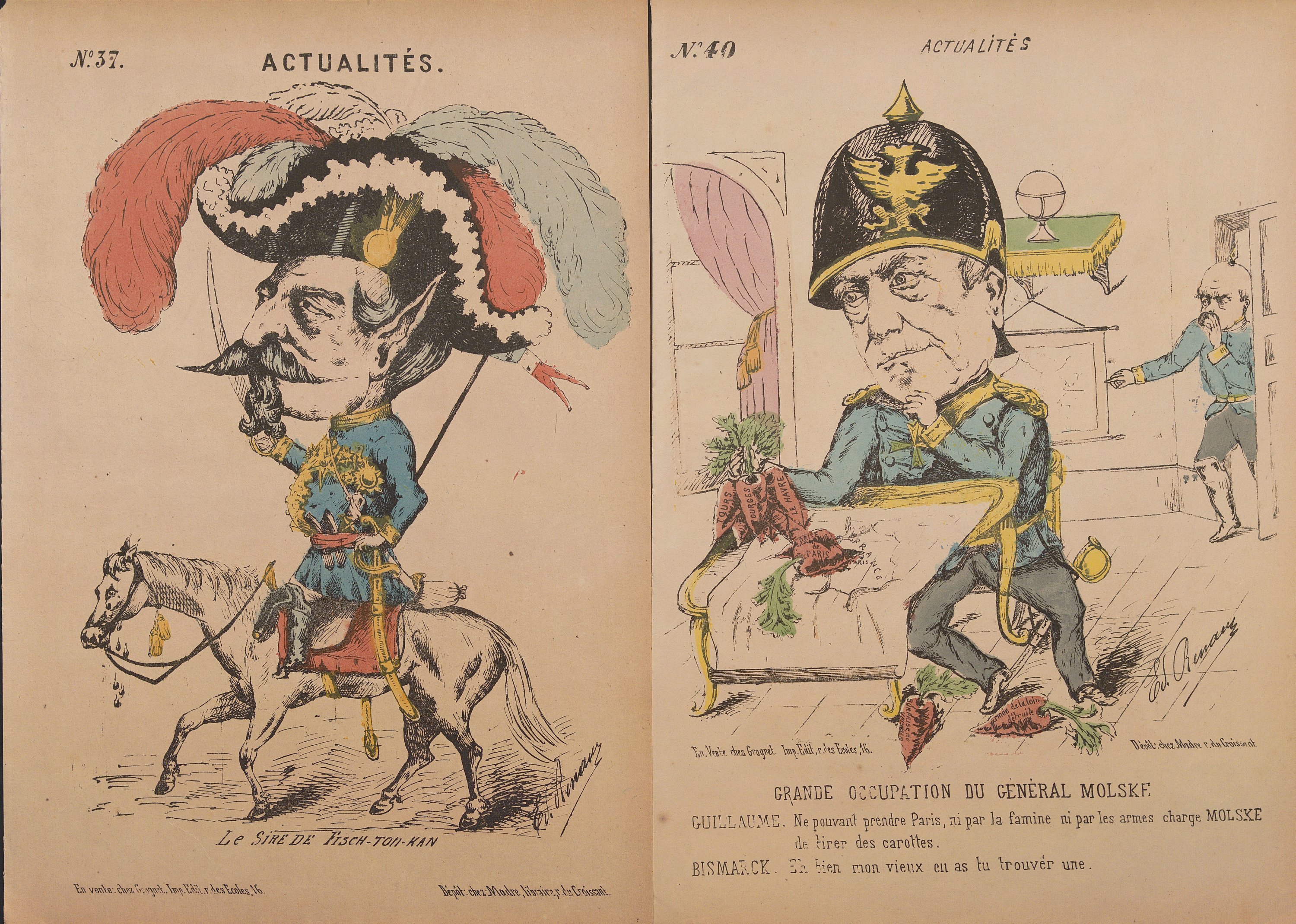 « Actualités », série quasi-complète n°1 au n°87 (mque 79, 80, 82, 83 et 87), formats divers ; feuilles volantes illustrées par différents dessinateurs/illustrateurs publiées et vendues dès le début de la guerre de 1870 jusqu’à la fin de la Commune de Paris ;