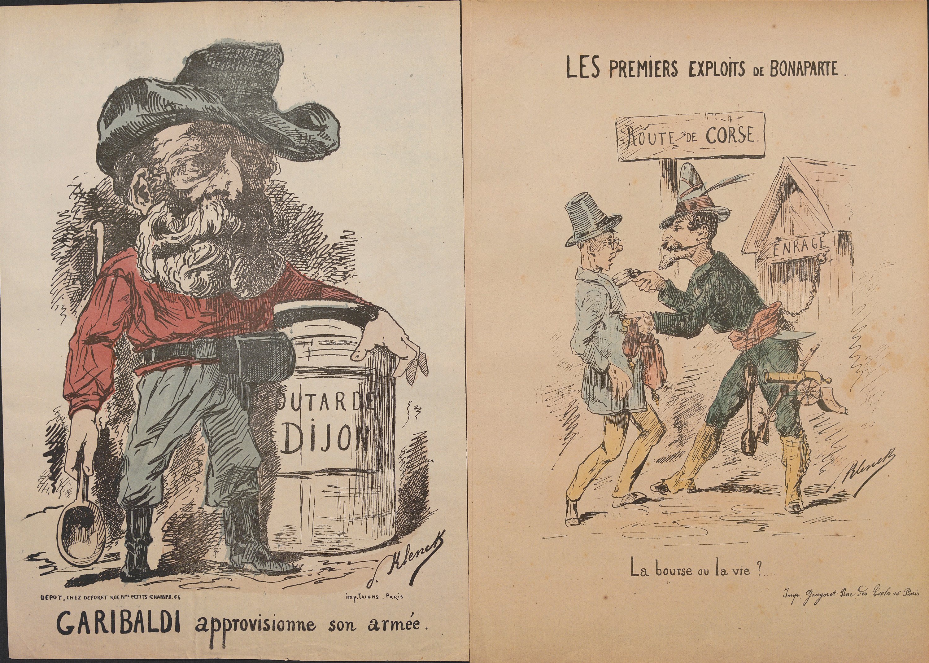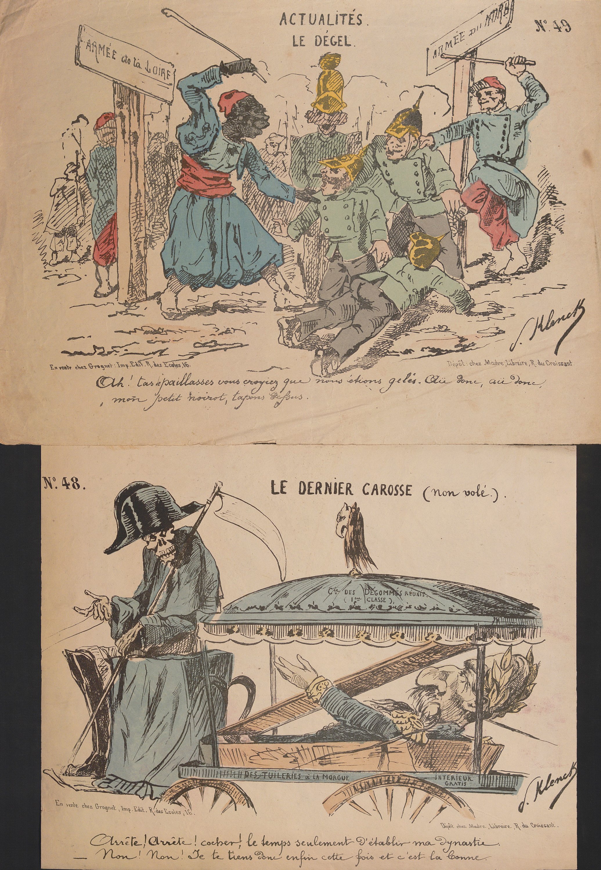Le plan Trochu (document historique) , Badinguet gendarme, 2 ex. (1 en N&B et 1 en couleurs), 34,5 x 26 et 32,5 x 26 cm ; Restauration pontificale, plan de Charrette (en N&B) ; La Résurrection ; Versailles ; Le père Thiers (petites déchirures) ; Le paladin paladines ; Le Nouveau Mangin (petit mque en marge) ; Une séance à la Chambre ; La famille Badingue ou les derniers beaux jours (en N&B) (petites déchirures en marge) ; Le faussaire (petite déchirure) ; Un mauvais rêve du Père Guillaume ; La St Guillaume ; La Boue ; Le Maudit, 43,5 x 30 cm (petits déf.) ; Monseigneur Darboy archevêque de Paris assassiné ; La France trahie: Vous pouvez entrer il dort ; 29e proclamation désespérée du Fou Guillaume , 44,5 x 29 cm (petits déf.) ; Garibaldi approvisionne son armée ; Les premiers exploits de Bonaparte ; Souscription républicaine ; La force lutte avec le droit ; Qui aime bien châtie bien (en N&B) ; Nos sauveurs!... (en N&B) ; Les Prussiens après l’attaque, venez donc goûter ; Les Prussiens après l’attaque, Bataille du ; Augusta monte à sa tour, Guillaume ne revient pas ; Le mat de cocagne politique 1871 ; Pauv’ Badingue, Dégommé! (en N&B) ; Actualités n°1, Dernier degré de l’échelle impériale ; L’homme à la perche ; Nouvelles de Versailles ; Actualité, Le retour du vainqueur ; Actualités, l’armée de la Loire met les Prussiens en déroute (en N&B et en couleurs) ; Actualités, Père et fils ; Actualité, la Débâcle ; Le départ de la Commune et de ses communiants ; Actualités, c’est y pour l’enfant ; Actualités,; Les trois Larrons ; L’archi-monseigneur ; Les valets de l’Empire n°1 ; Hure III ; Un pétroleur ; Une pétroleuse ; Musée burlesque n°1, Faust et Marguerite ; Musée burlesque n°2, Les absents ont tort ; Musée Burlesque n°3, Condamné à ; Panorama anti-bonapartiste n°1 ;