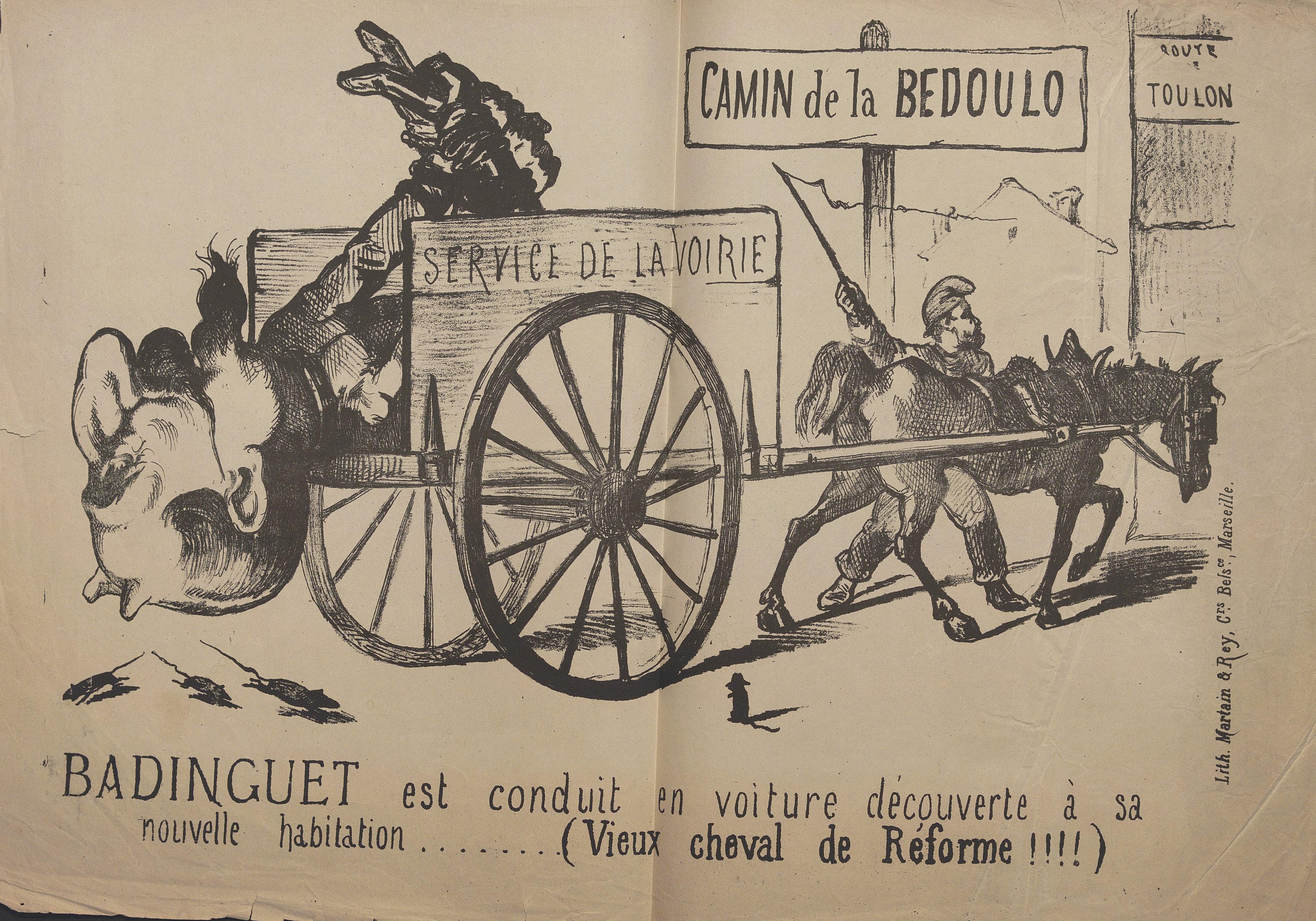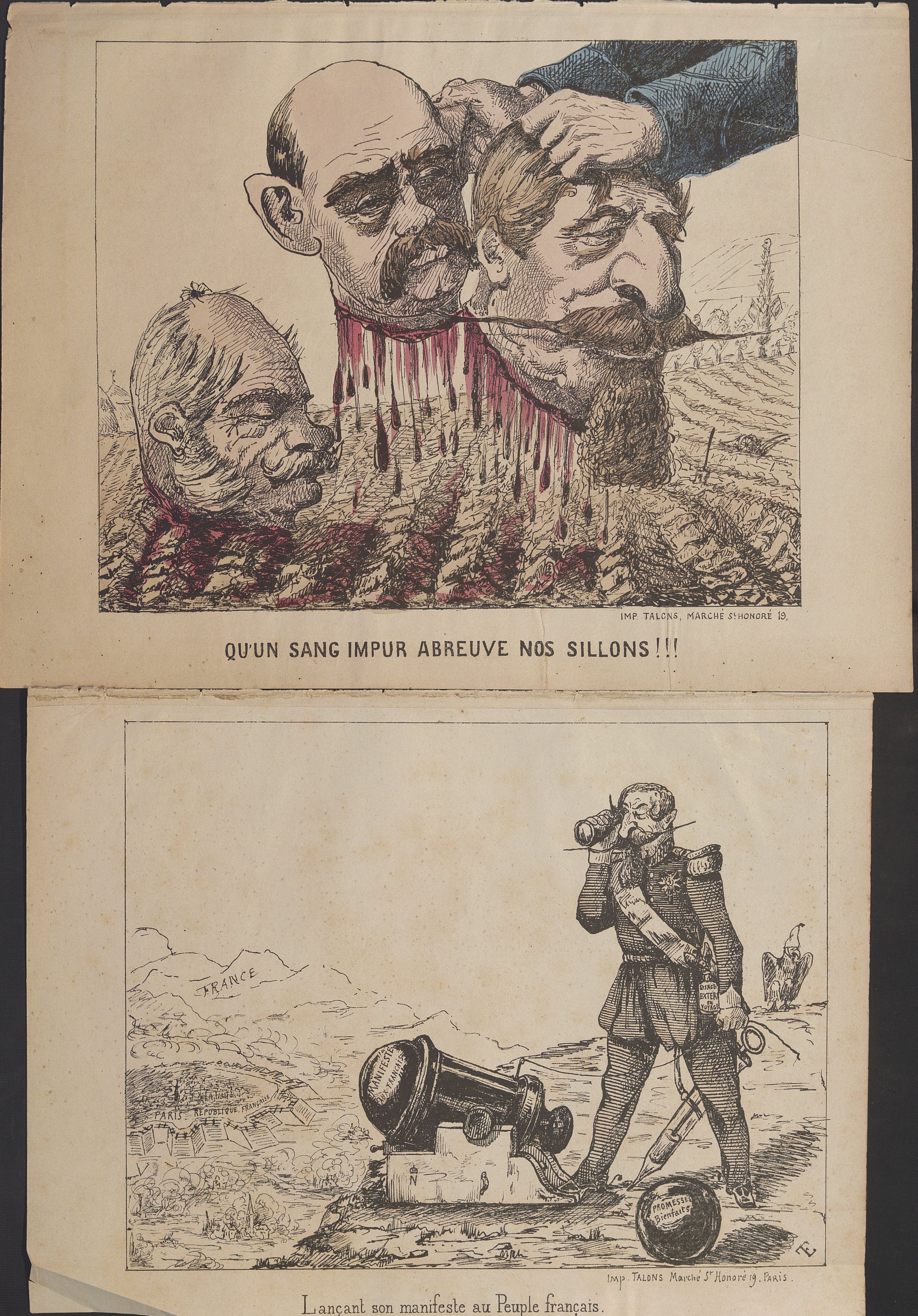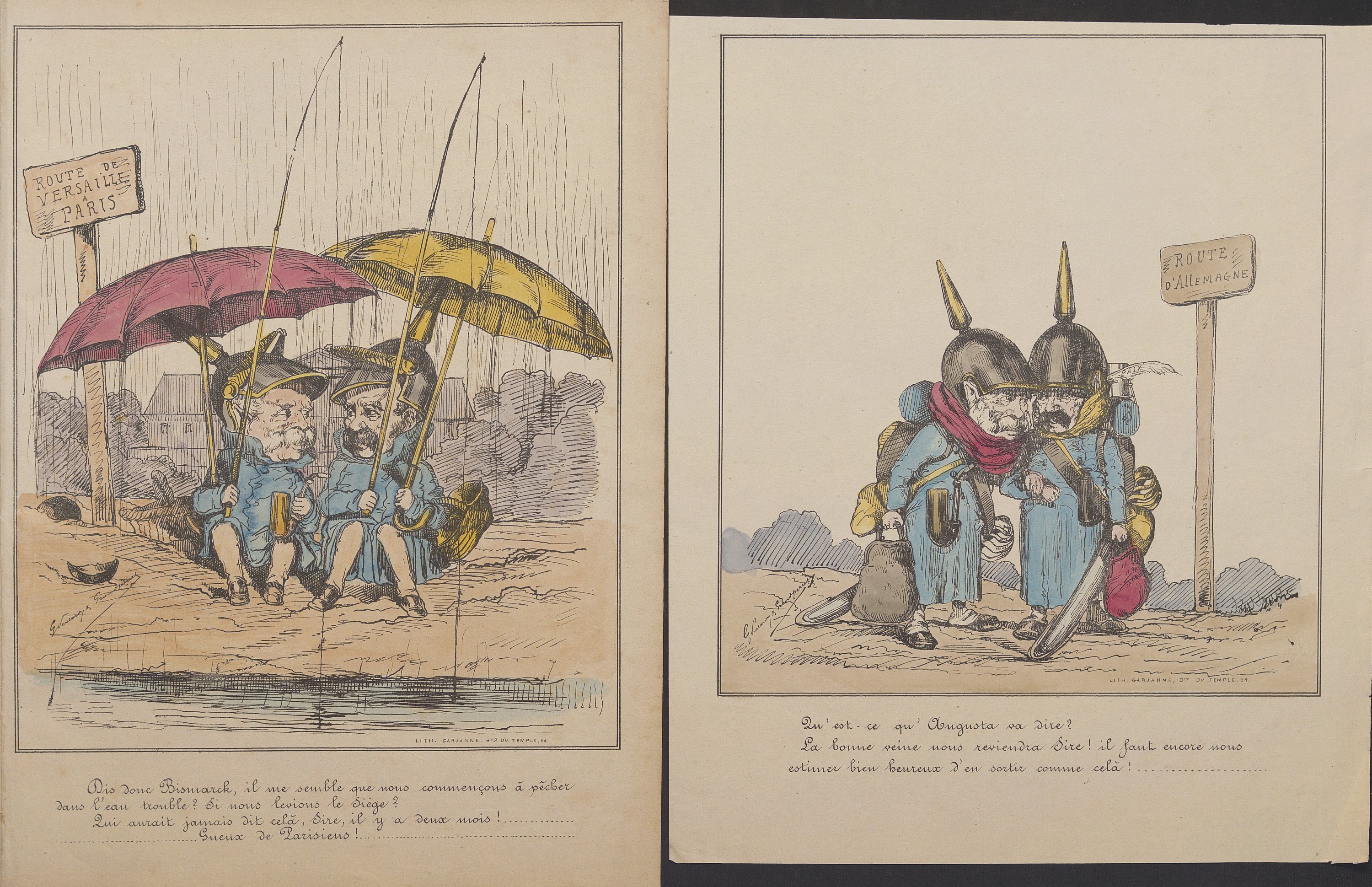 Bar (G.), 10 lithog. en couleurs: Actualités, Six d’un coup!!!..., 34,5 x 28 cm (petite déchirure en marge) ; Actualité, Samson et Dalila, 37,5 x 26,5 cm ; Actualité, L’auteur des châtiments ne connaissant pas son français , 34 x 24,5 cm ; Actualité, Mode de transport adopté par l’Exécutif , 30,5 x 28,5 cm, contrecollé ; Actualité, O Richard, O mon Roi!..., 31 x 22,5 cm ; Souvenir du siège , 29,5 x 22,5 cm, contrecollé sur feuillet épais ; Actualité, Picard avocat , 34 x 26 cm ; Actualité n°70, Excellence notre destinée , 31,5 x 23 cm ; Actualité n°71 Marche triomphale , 33,5 x 26,5 cm ; Actualité n°73, Donnez-moi le commandement de l’armée , 32 x 27,5 cm (petite déchirure en marge) ;