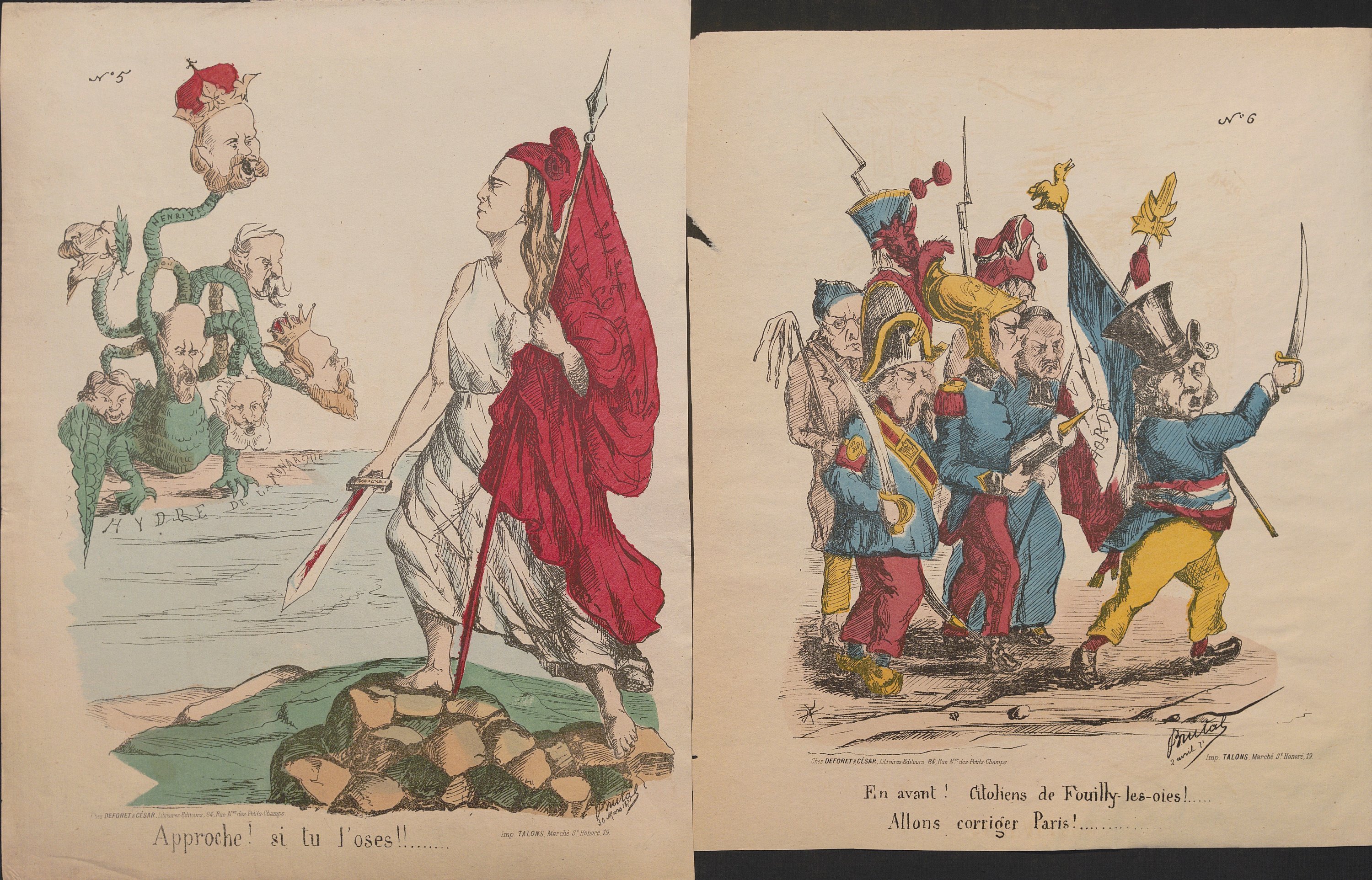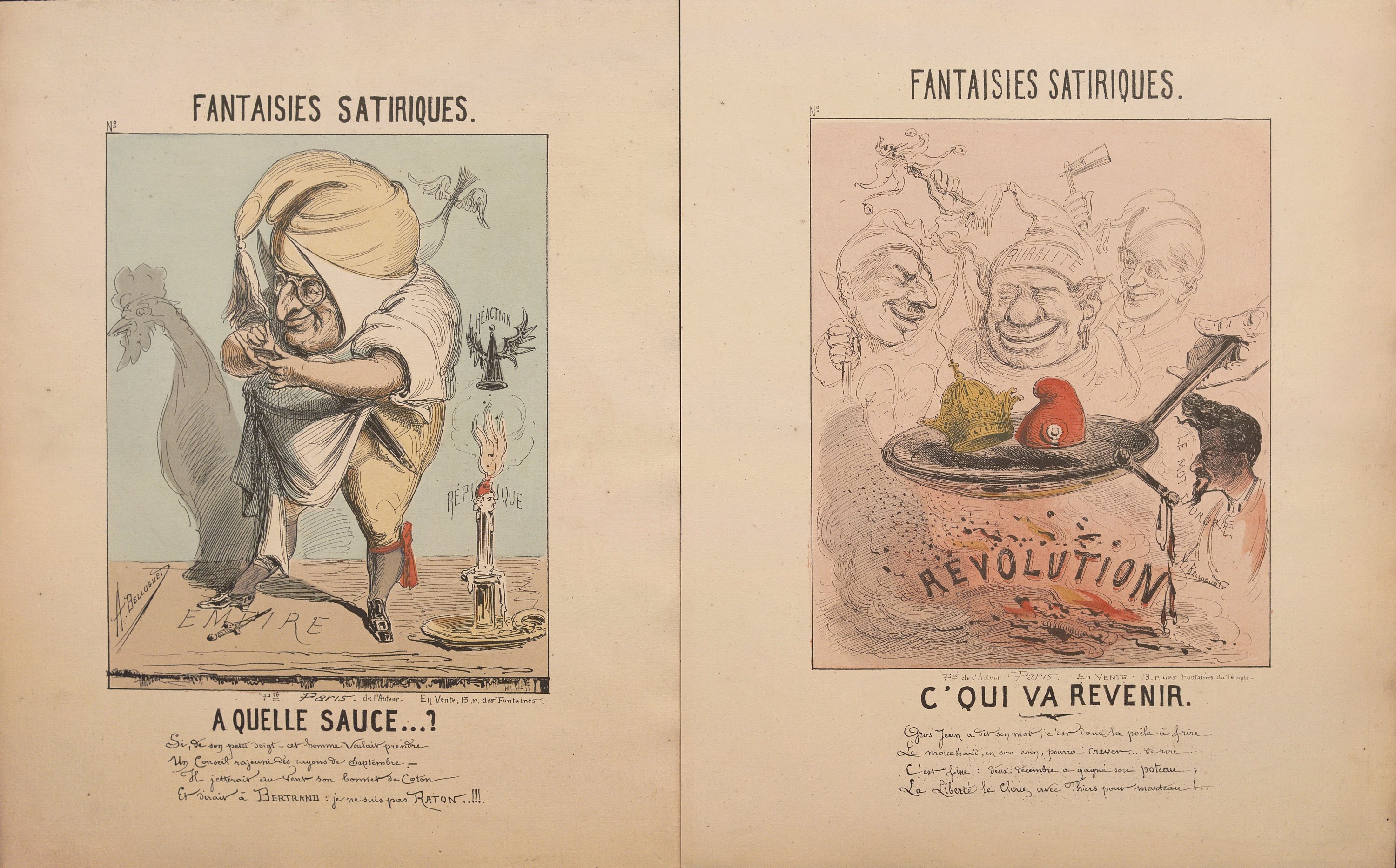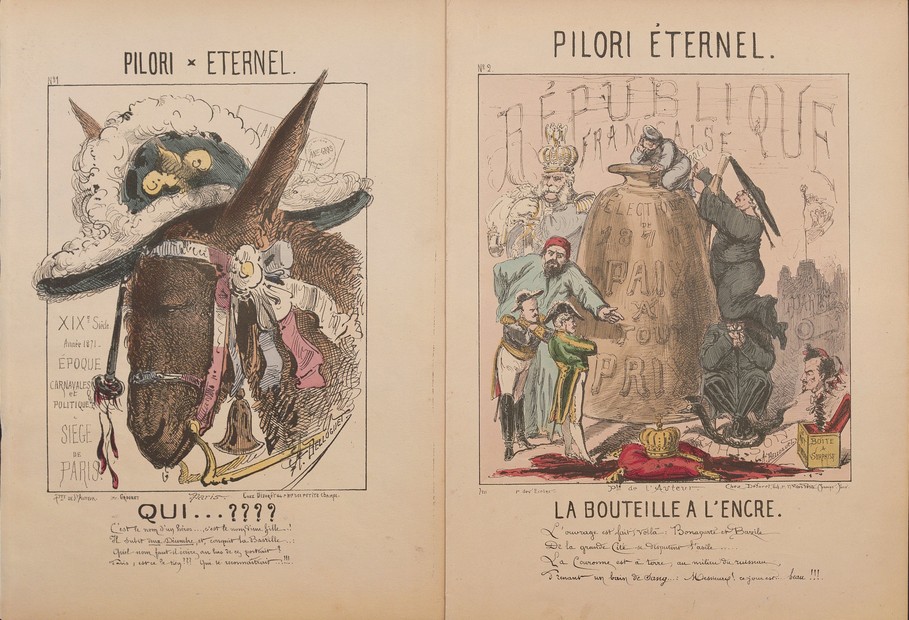 Achille Belloguet: Pilori-Eternel, 3 lith. en couleurs, série complète, env. 32 x 23 cm ; Phrénologie-Topographie de la France 1871, 2 lith. en couleurs, série complète, 36,5 x 27,5 cm (petite déchirure en marge, froissures) ; Fantaisies satiriques, 4 lith. en couleurs, série complète, env. 33 x 27 cm (petit mque en coin) ;