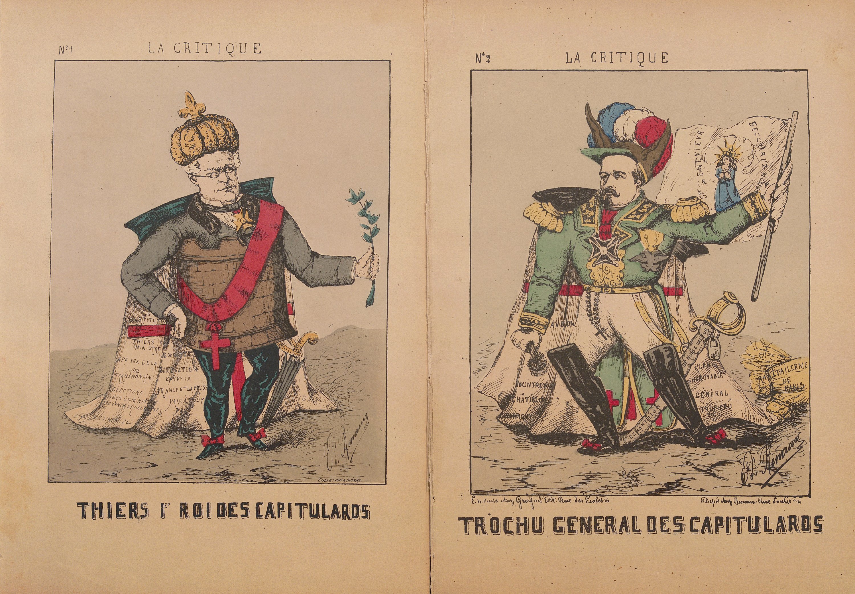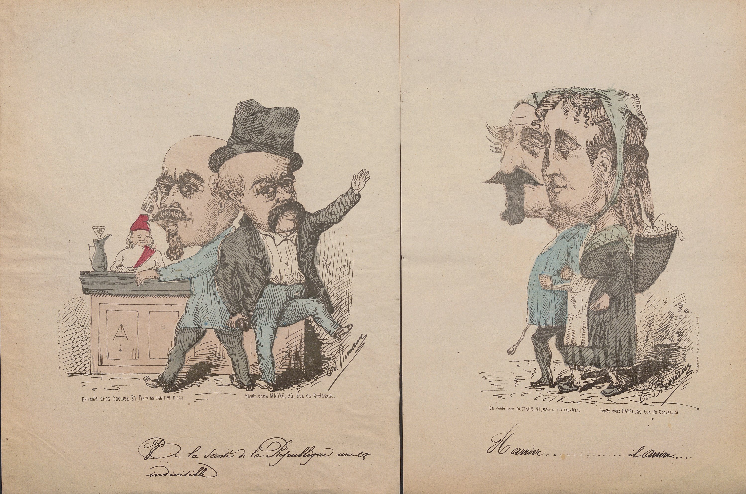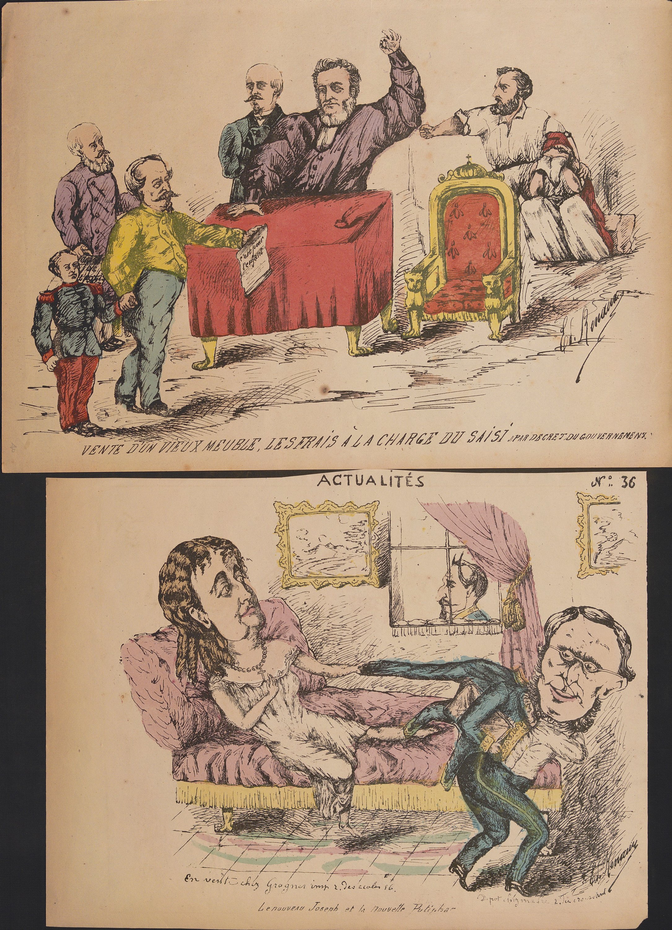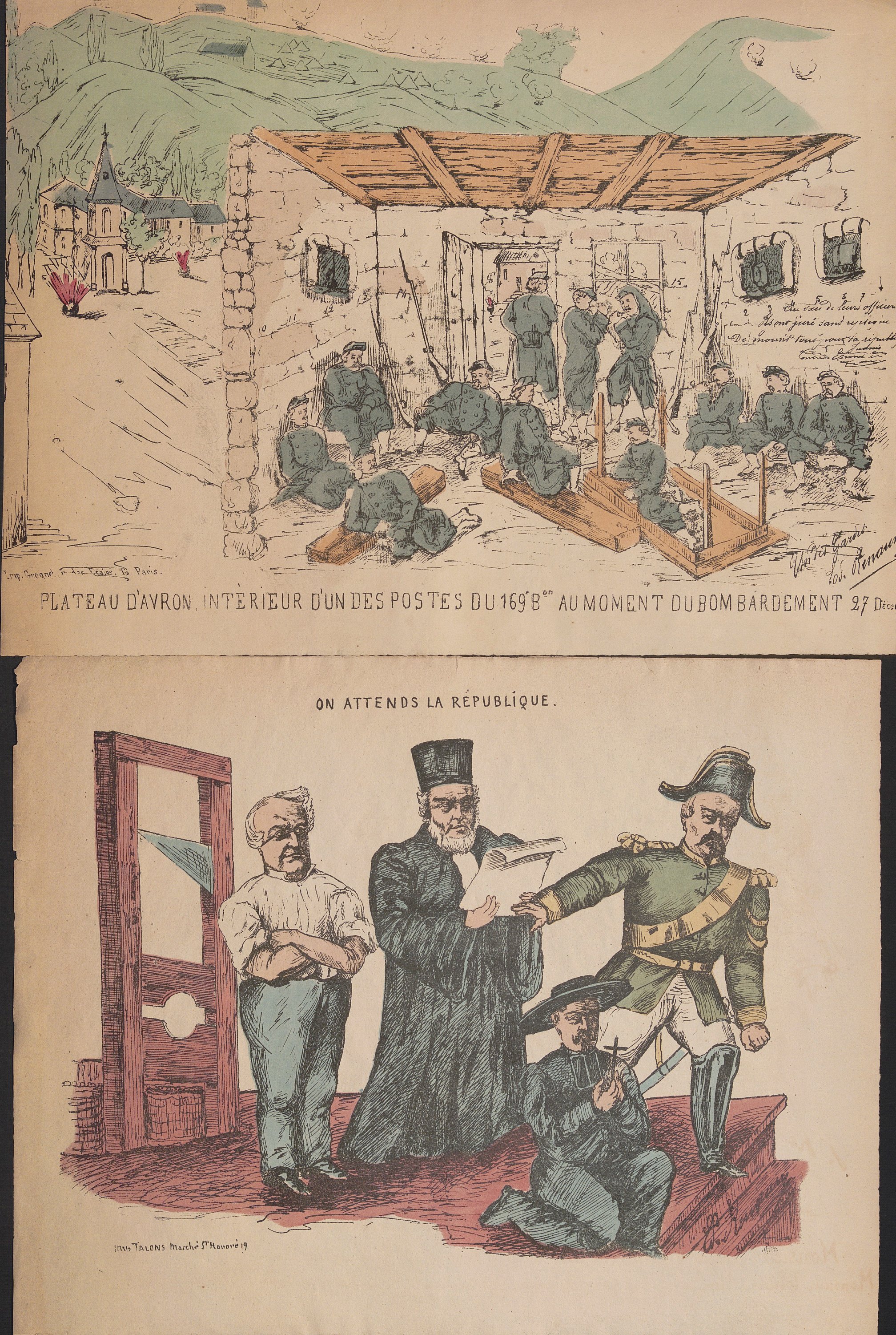 Il arrive il arrive, 31,5 x 22 cm ; A la santé de la République une et indivisible, 32 x 25,5 cm ; Les ruraux, 34 x 26,5 cm ; On attends (sic) la République, 26,5 x 33,5 cm ; Plateau d’Avron, intérieur d’un des postes du 169e bon au moment du bombardement 27 décem, 25,5 x 34,5 cm ; C’est moi qui du siège ai su profiter , 31 x 22 cm ; Non, c’est impossible, je ne puis m’en revêtir , 28 x 22 cm ; Vente d’un vieux meuble, les frais à la charge du saisi , 26 x 37 cm ; Peuple français, arrête ta vengeance , 30,5 x 22,5 cm ; De Moltke et Trochu , 28 x 21,5 cm ; La question des loyers, 35,5 x 26,5 cm ;