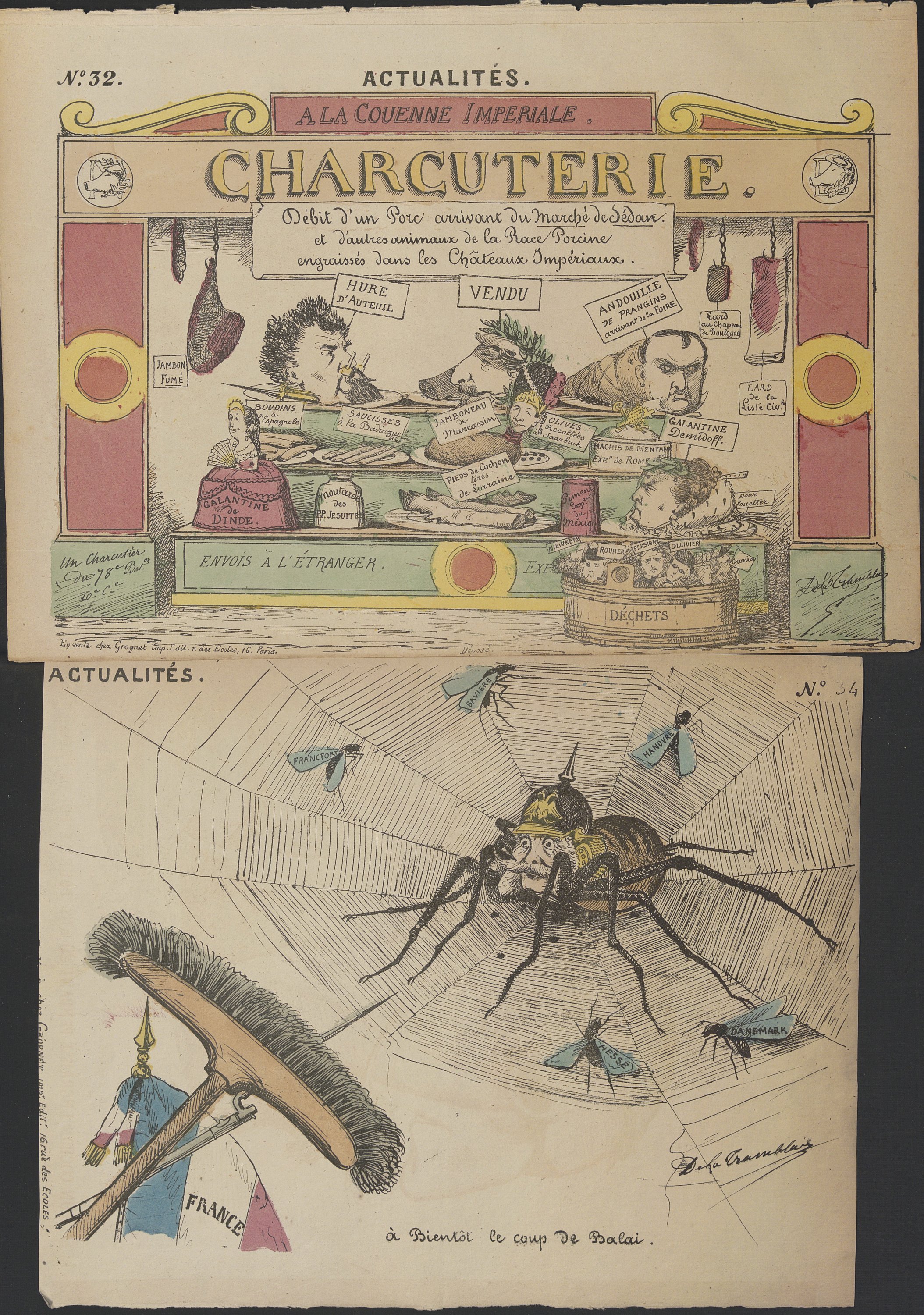 Taltimon: 10 lith. en couleurs et 2 en noir, env. 26 x 34 cm: Les Batards de Badinguet ; Boucherie badingophagique ; Un dernier coup d’œil à la France ; Ce qui lui pend au nez!!!... ; Les derniers moments de Napoléon le Petit ; Opération chirurgicale subie par Guillaume ; Problème algébrique n°1 et 2 ; La réflexion d’un misérable ; Haute école ; Un parlementaire prussien et nos camarades ; Un plat favori!!!... ;