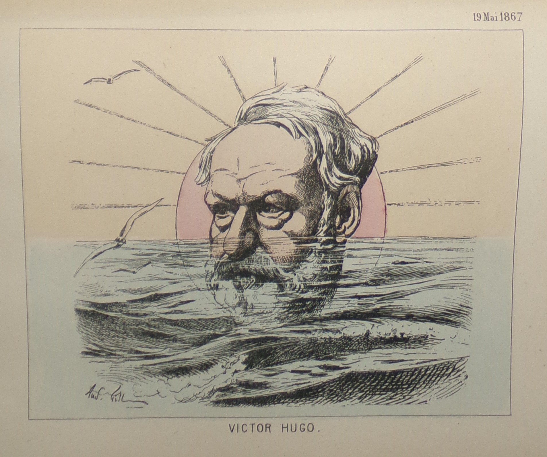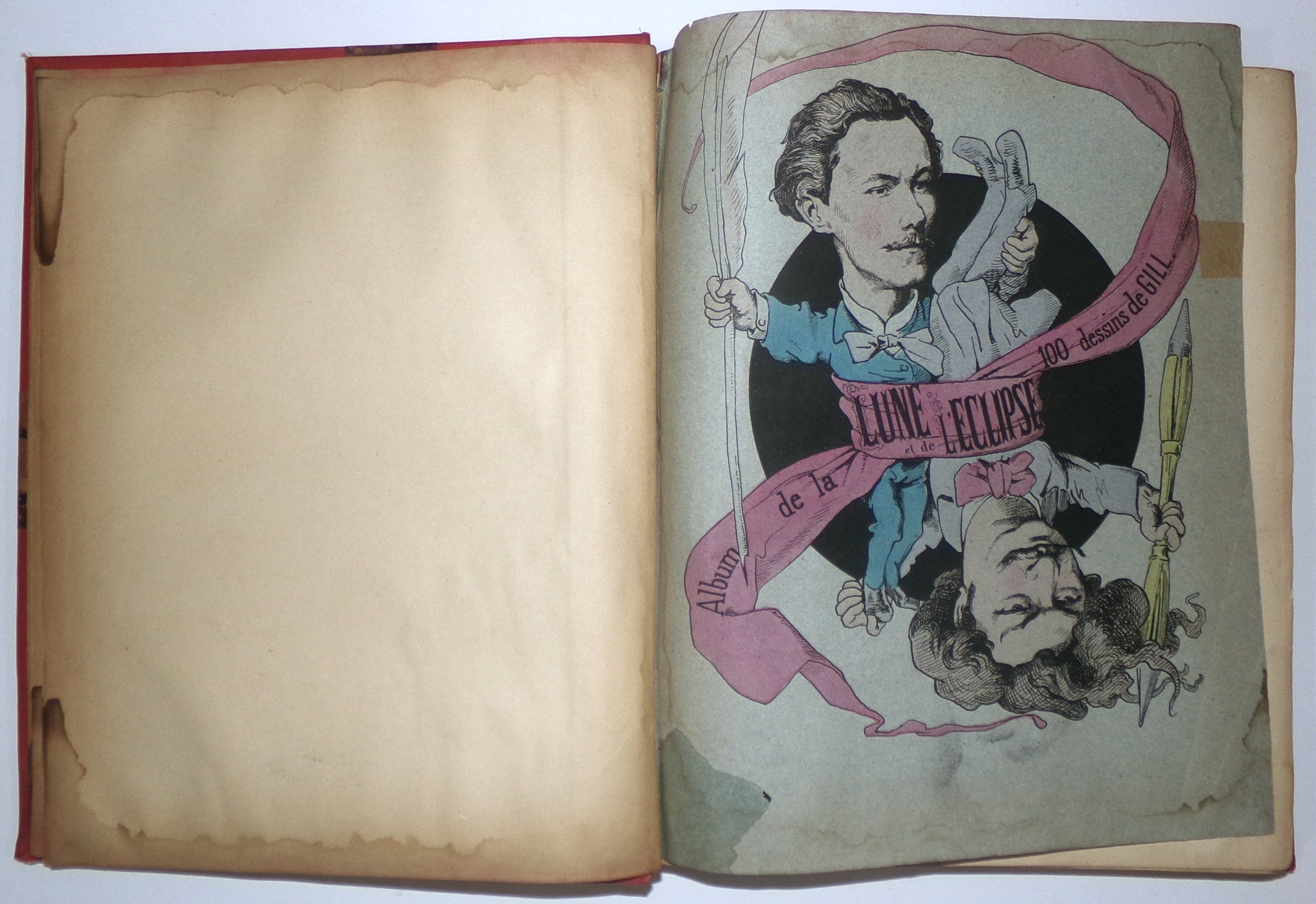 Album de La Lune et de l’Eclipse - 100 dessins de Gill. Paris, rue du Croissant, 16, [1872]. Rel. in-4 ½ toile (mouillures). Réunion de 100 dessins, coloriés et réduits ; Débute par le portrait de Timothée Trimm (23 septembre 1866) et se termine par « La Marseillaise » (28 août 1870) dont Gustave Courbet, Jules Ferry, Victor Hugo, André Gill (autoportrait), Rossini, Offenbach, Nadar, Bismarck, Jules Favre, Richard Wagner, Gustave Doré, etc. Double page de couv. bleutée (mouillures, rest.) et page de titre.