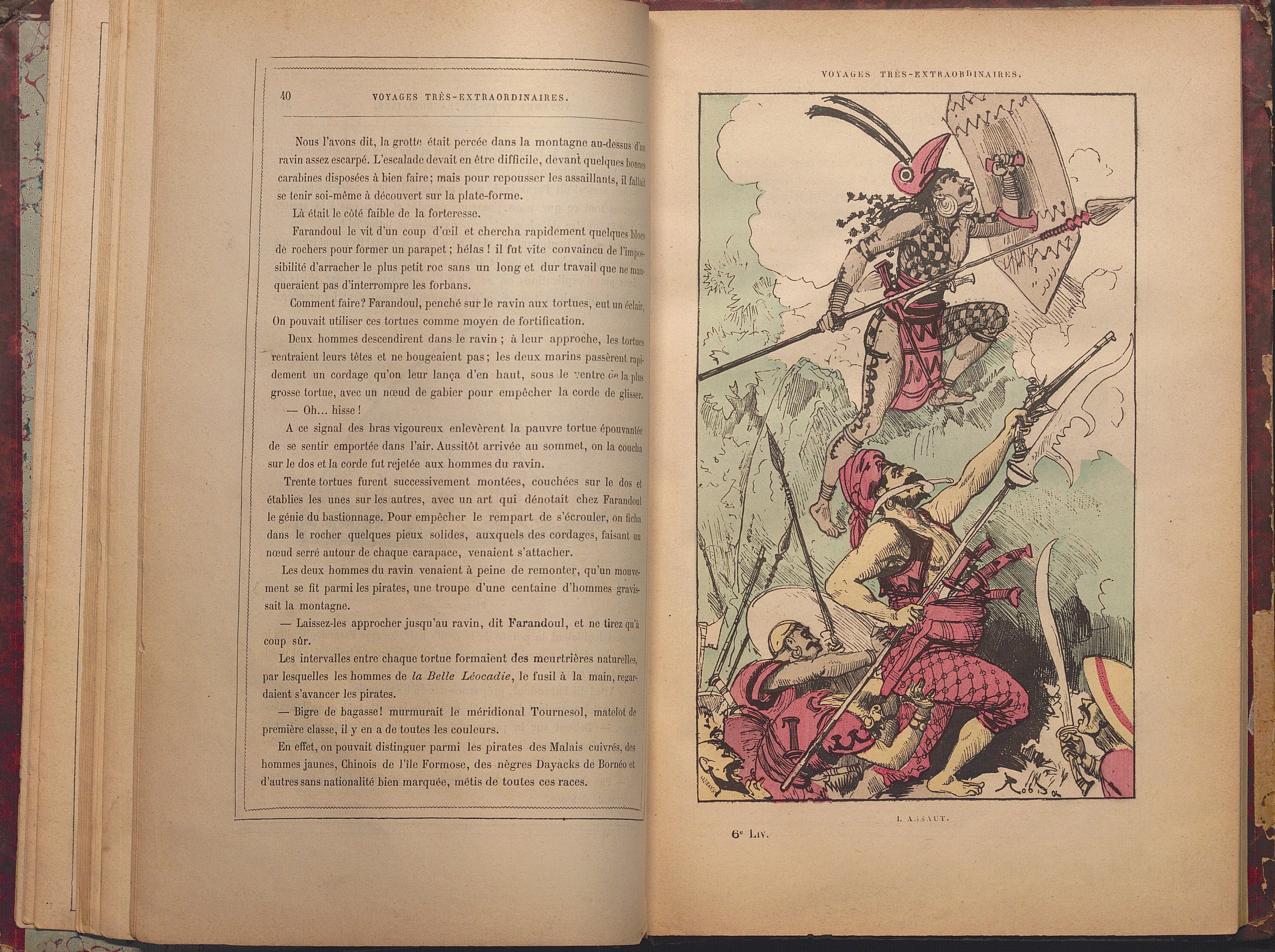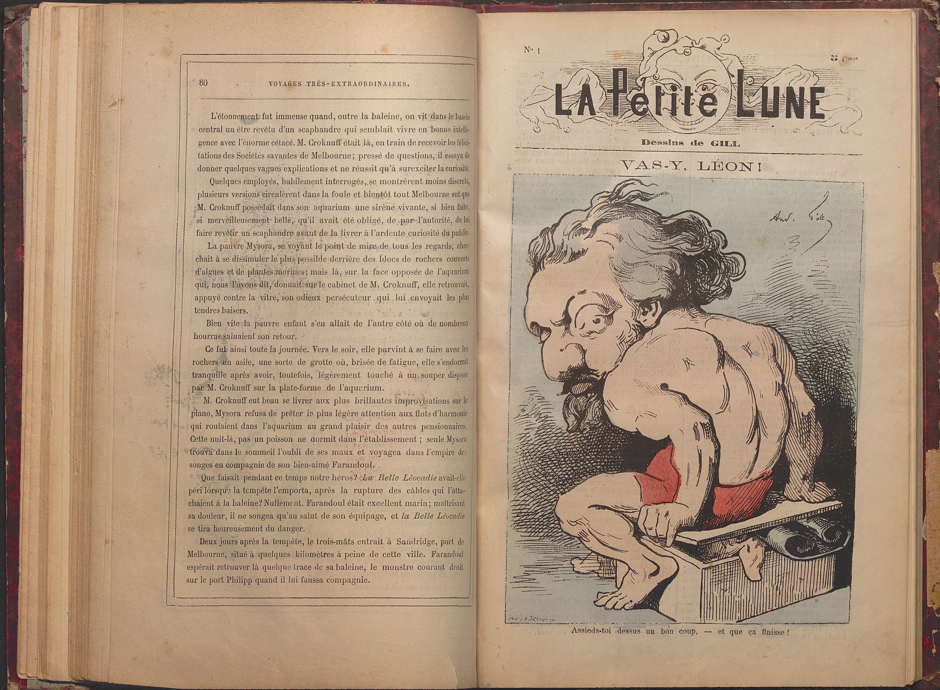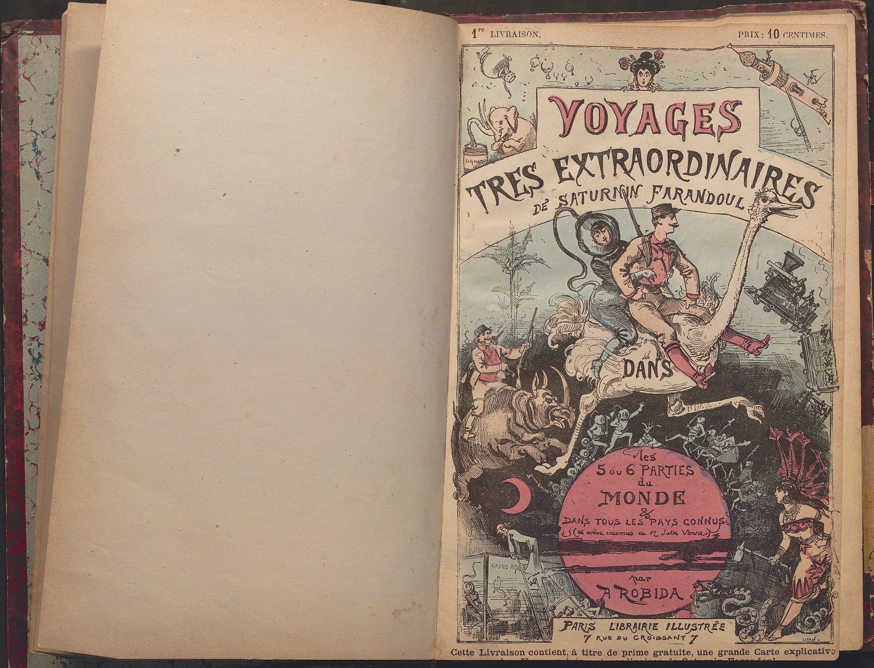 Recueil factice en 1 vol. ½ basane rouge contenant: Voyages extraordinaires de Saturnin Farandoul par A. Robida (10 premières livraisons), suivies de La Petite Lune, n°1 à 52 (1878-1879), complet.