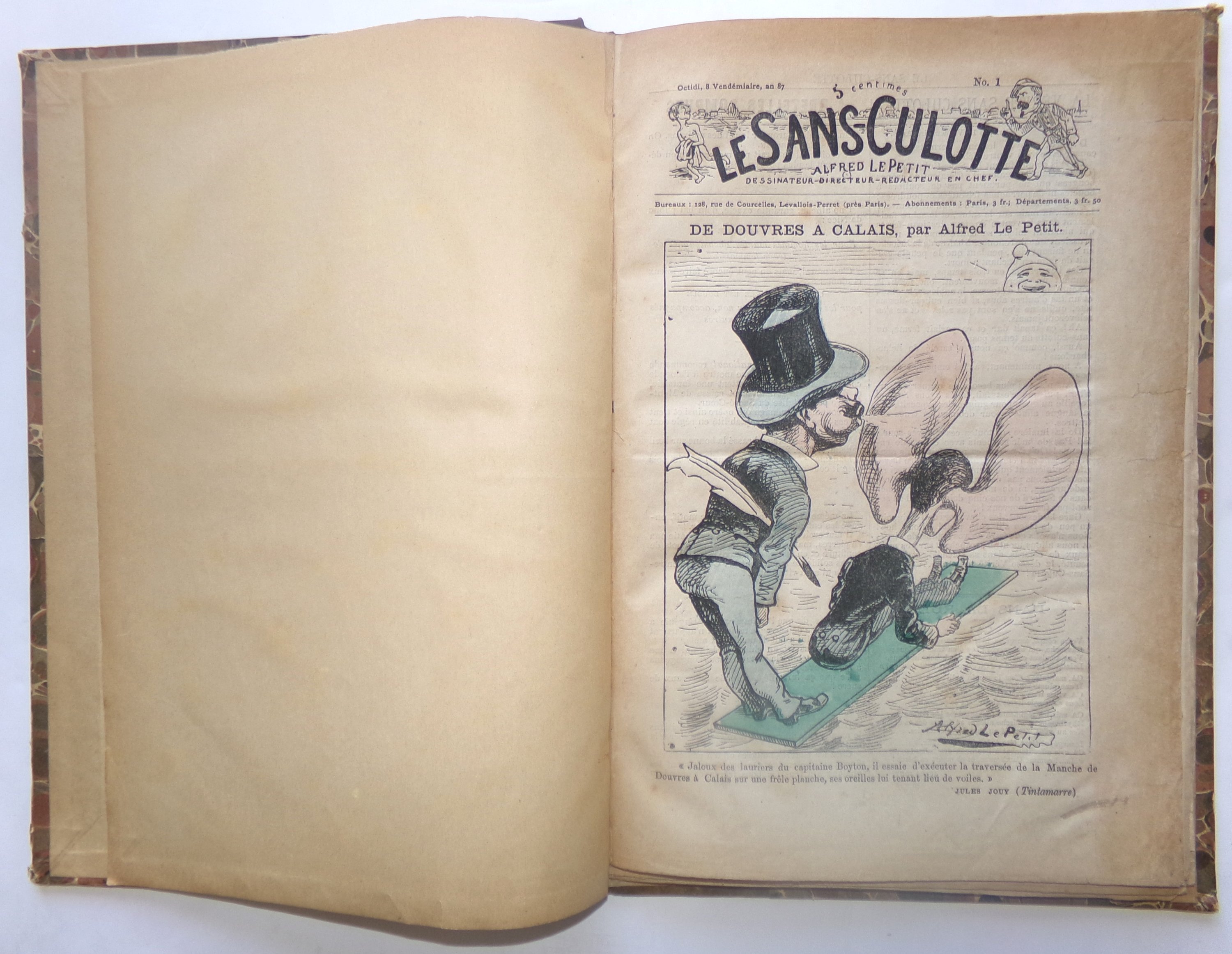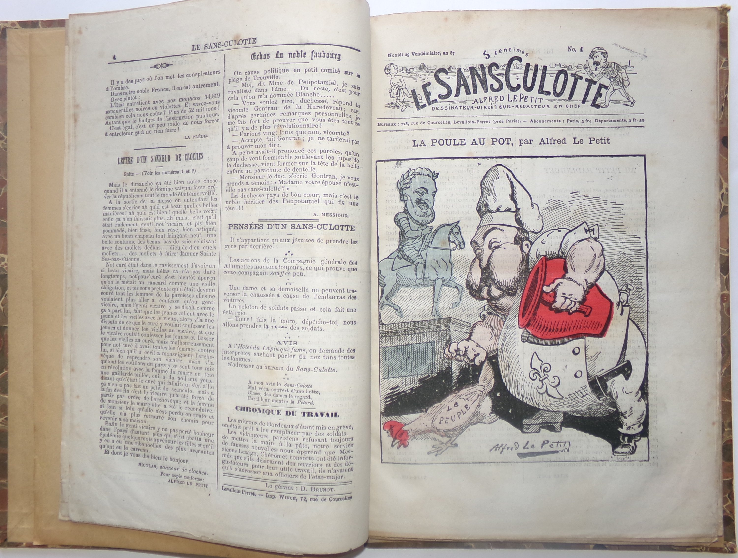 Le Sans-Culotte, n°1 à 29 (1878-1879), in-8 rel. ½ toile. Manque le dernier numéro (30). Dans la mouvance radical-socialiste, Alfred Le Petit vise, par le crayon et le texte, les monarchistes, les bonapartistes, le cléricalisme, militant pour l’amnistie totale des communards et s’intéressant au sort des « travailleurs ». Rare. T.B.E. (rousseurs) ;