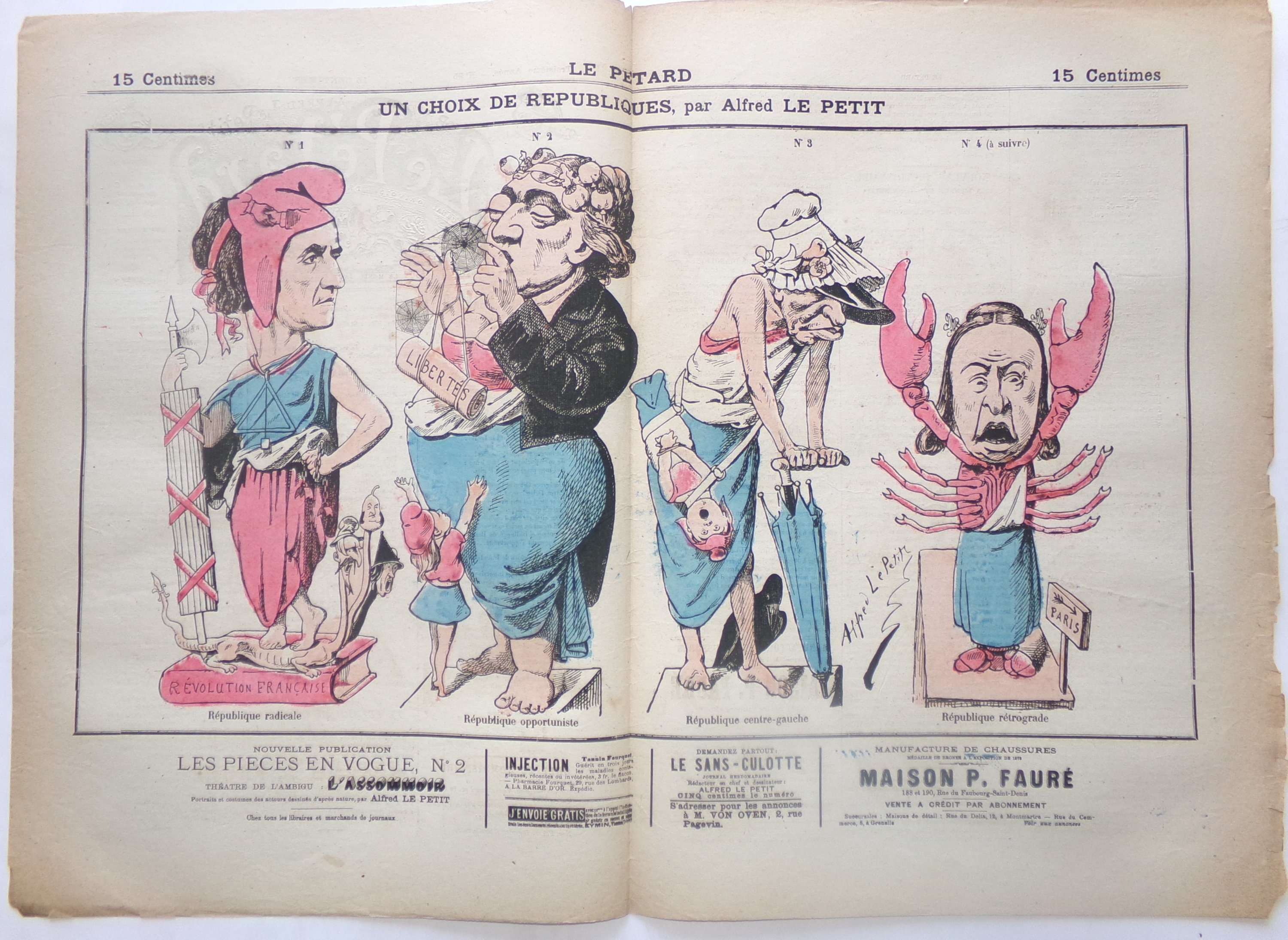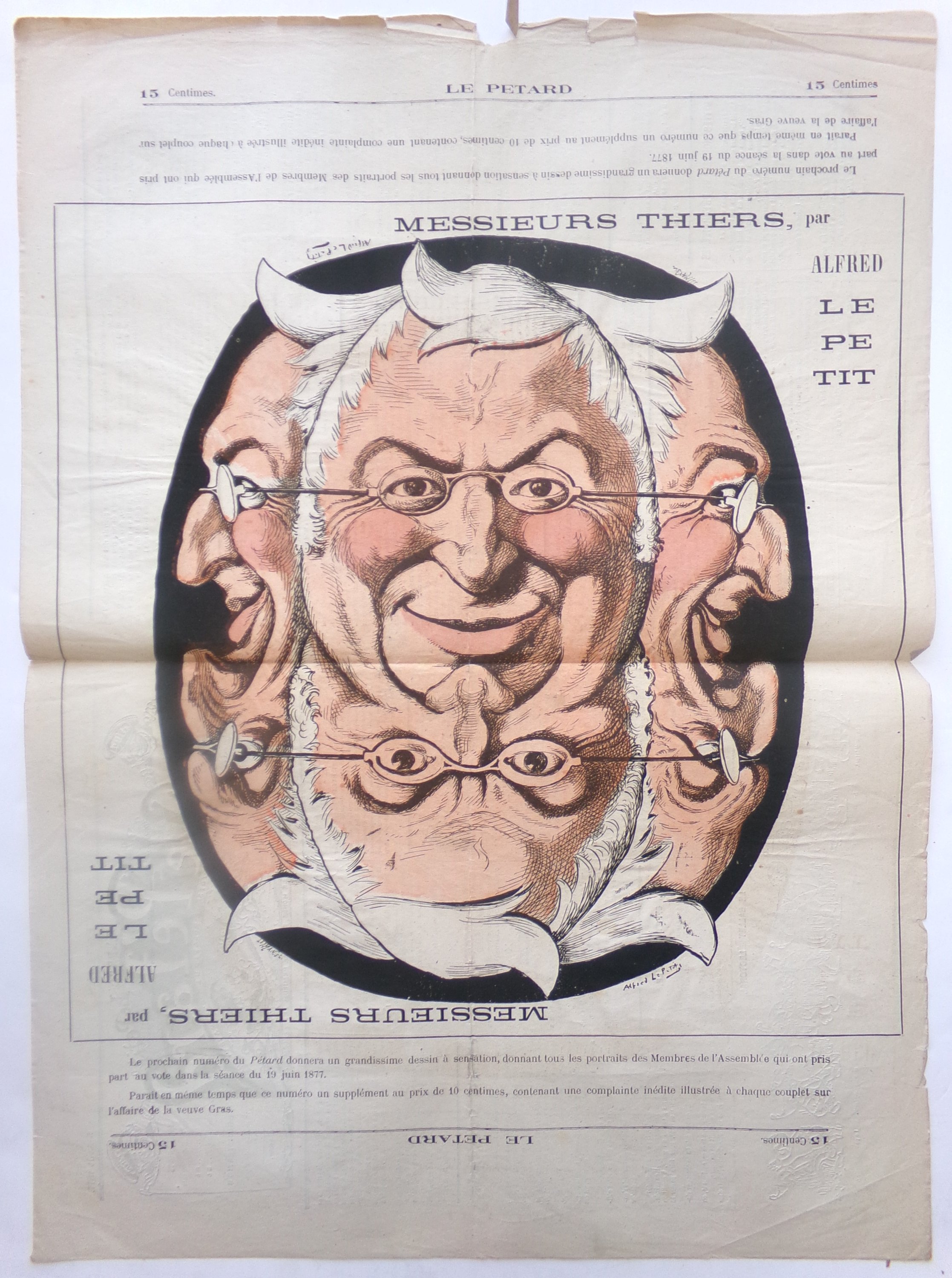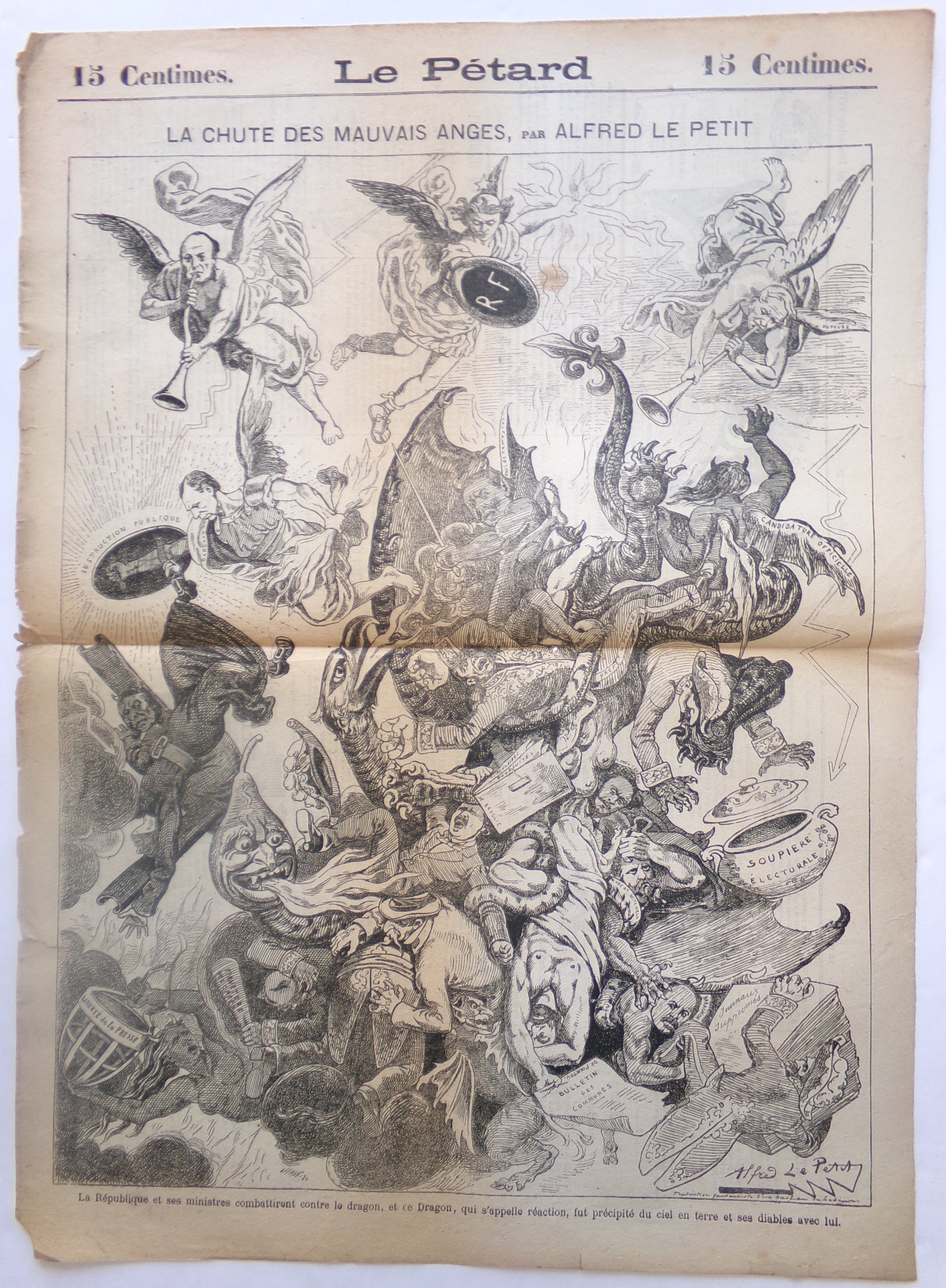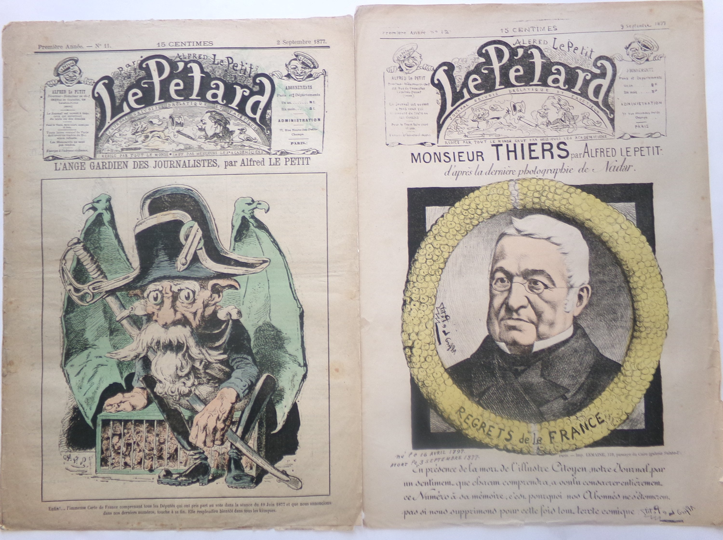 Le Pétard, 85 numéros (avec des doubles) entre le n°2 (1er juillet 1877) et n°99. Journal satirique fait entièrement par Alfred Le Petit qui est paru régulièrement jusqu’au n°97 (1879). Il lui a fallu ensuite attendre 9 ans pour publier les 15 derniers numéros qui se termine au n°112 d’août 1888. Peu courant. Etat moyen à T.B.E.