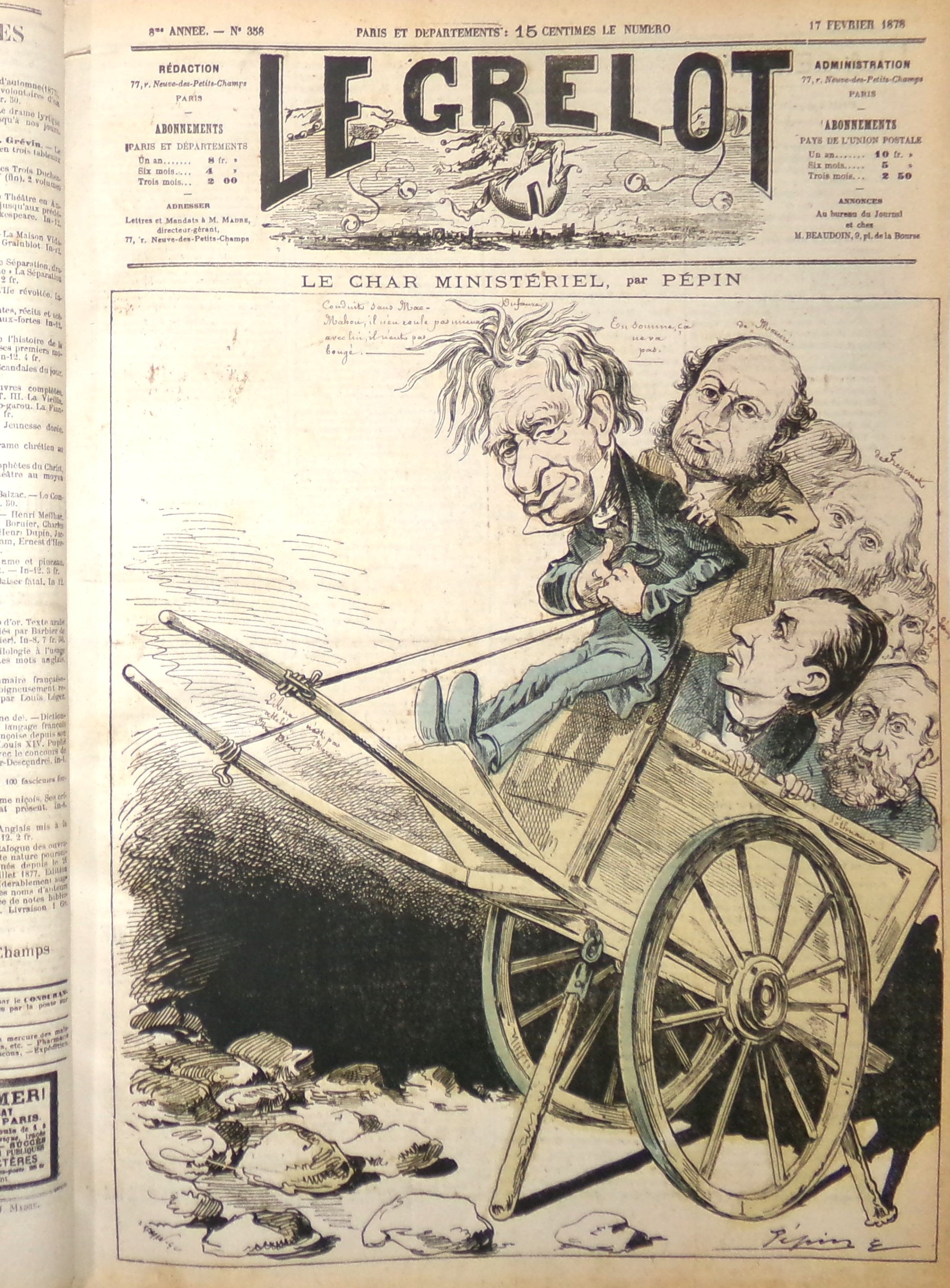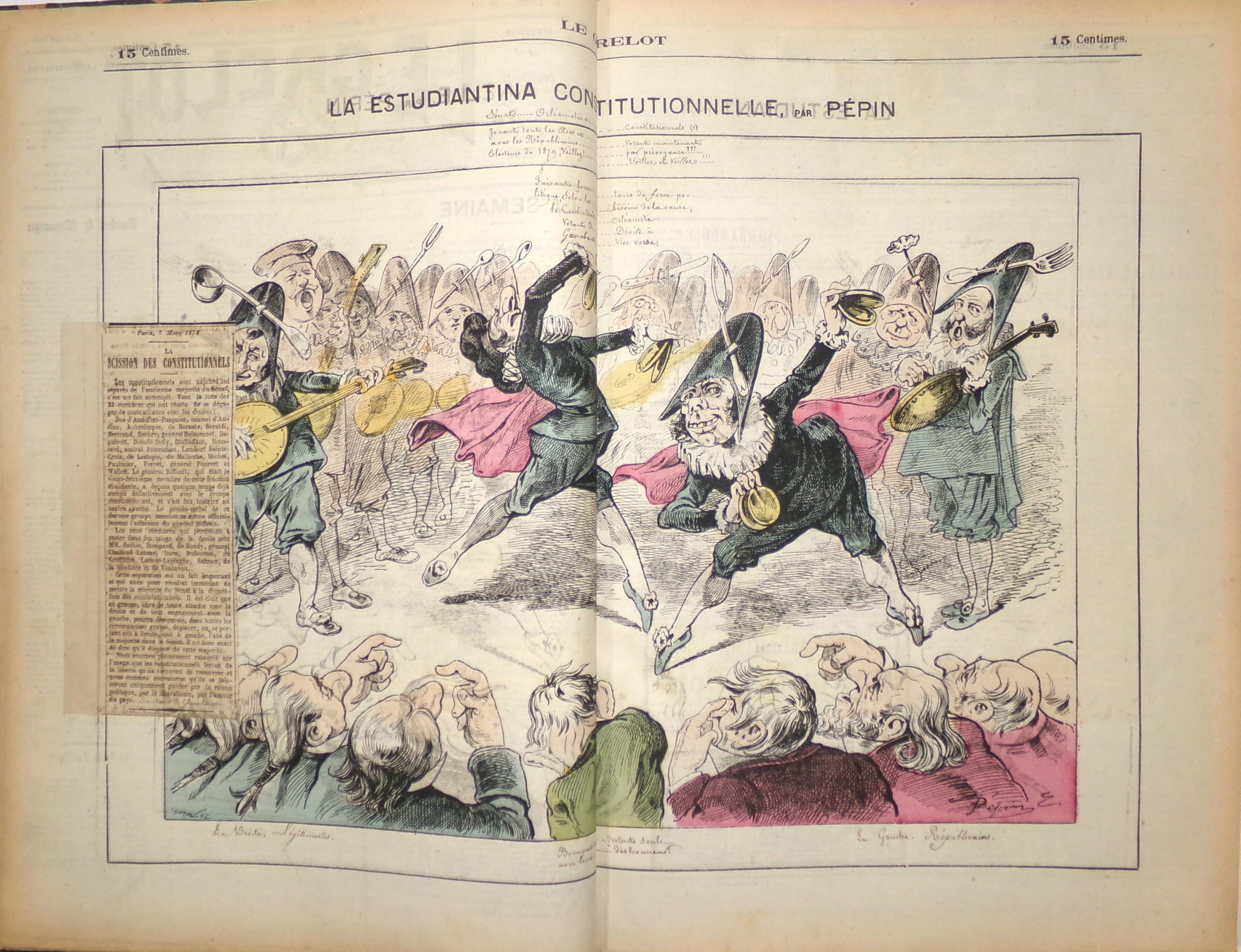+ de 100 numéros rel. en 1 vol. in-fol., n°352 (6 janv. 1878) au n°403 (29 déc. 1878) ; n°404 (5 janv. 1879) au n°455 (28 déc. 1879), complet + insertions d’autres journaux satiriques illustrés + ajouts de commentaires et légendes manuscrits sur chaque page de titre et caricatures, permettant de mieux comprendre et replacer l’image dans le contexte politique de l’époque.