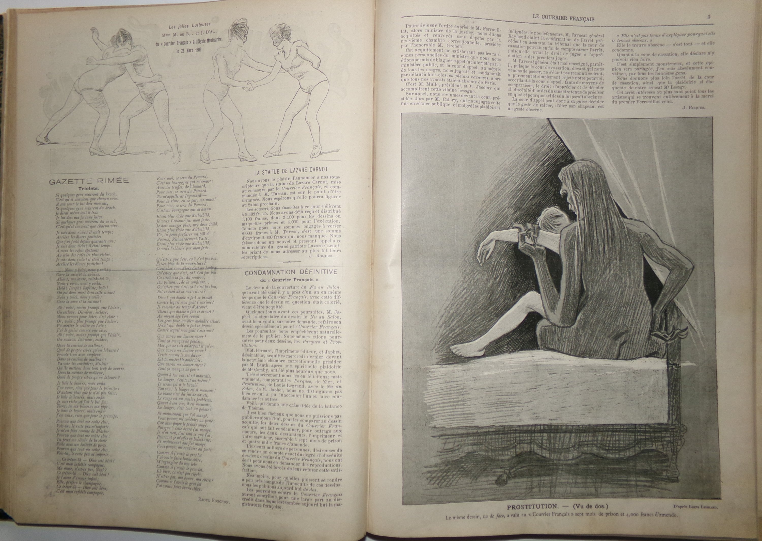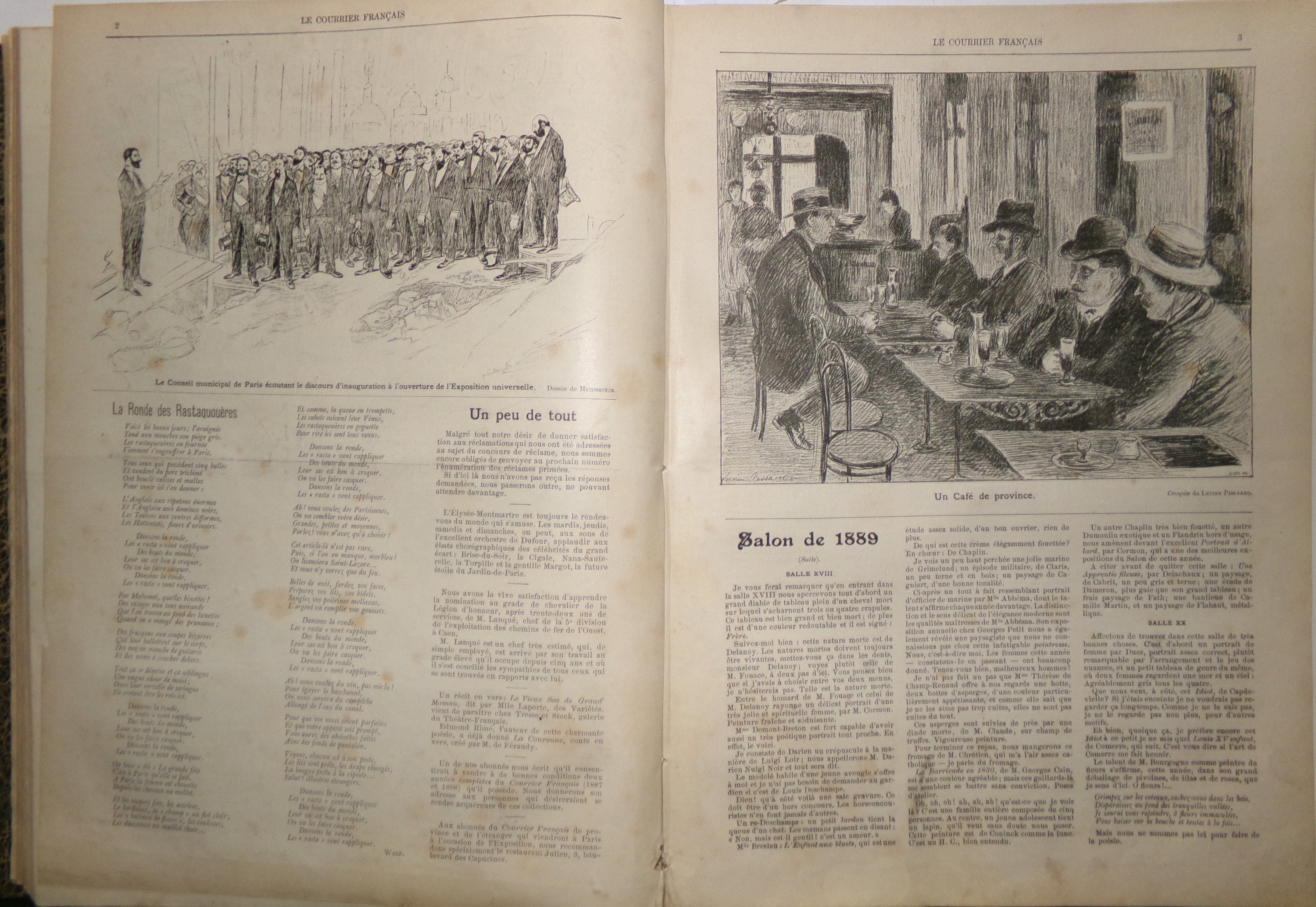 « Fondé par le publicitaire Jules Roques en novembre 1884, Le Courrier Français est un « hebdomadaire illustré humoristique, littéraire et artistique », issus de la sociabilité montmartroise des années 1880. Nous sommes donc au cœur de ce que l’on appelle improprement la « Bohème Montmartroise », même si les bureaux du journal sont au 14 rue Séguier. Sa dimension Montmartroise, outre la géographie de ses lieux d’élection et du séjour de ses auteurs, réside aussi dans les dessins qui évoquent régulièrement la population contrastée de la Butte (artistes, modèles, lingères, bourgeois, employés, ouvriers travaillant sur le chantier du Sacré Cœur), moulins, bals, cabarets artistiques et bouges infâmes, assommoirs, les salles du boulevard Rochechouart, Moulin Rouge et surtout l’Elysée Montmartre. » (Extrait « Le Courrier Français » par Laurent Bihl, 2007)