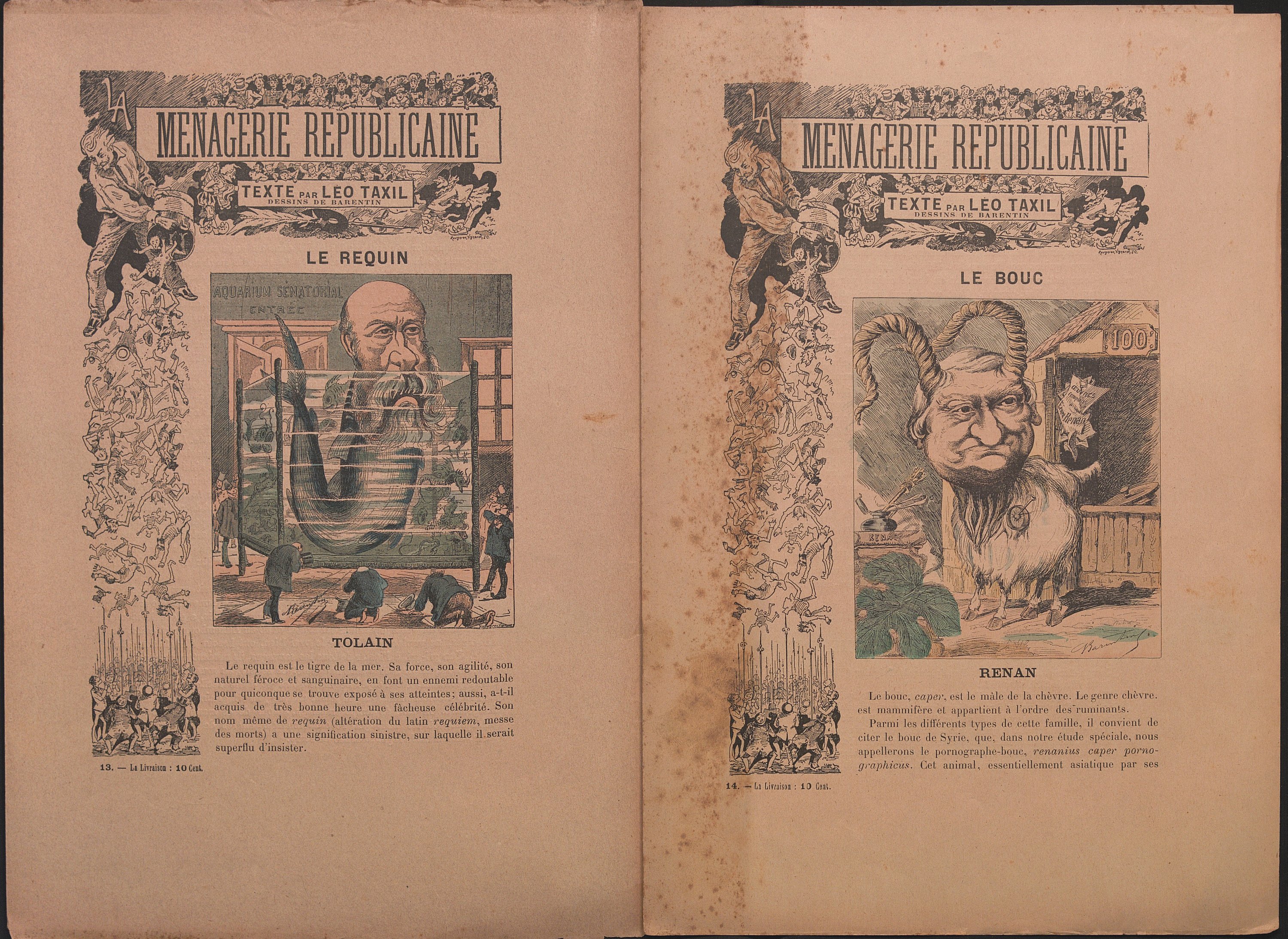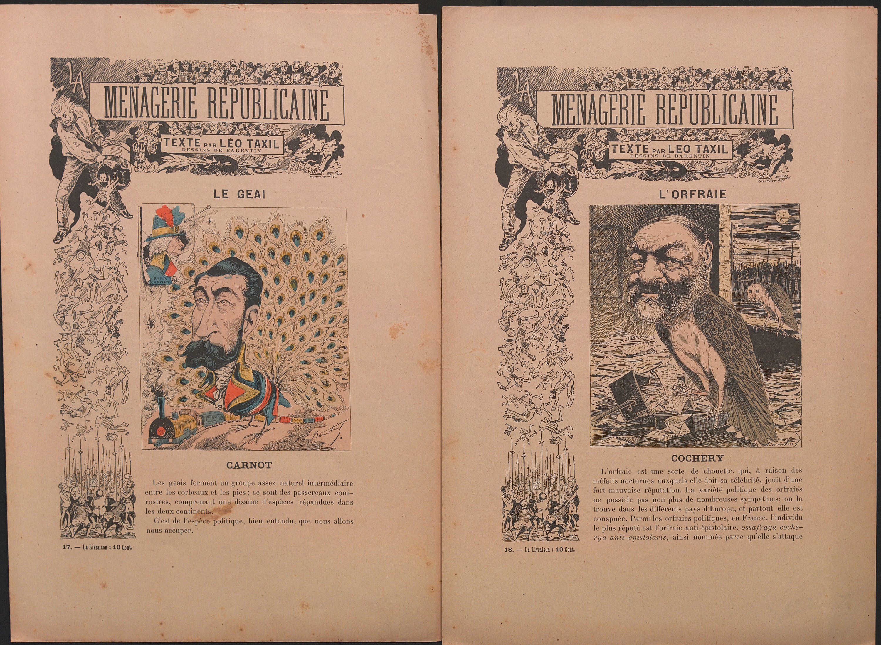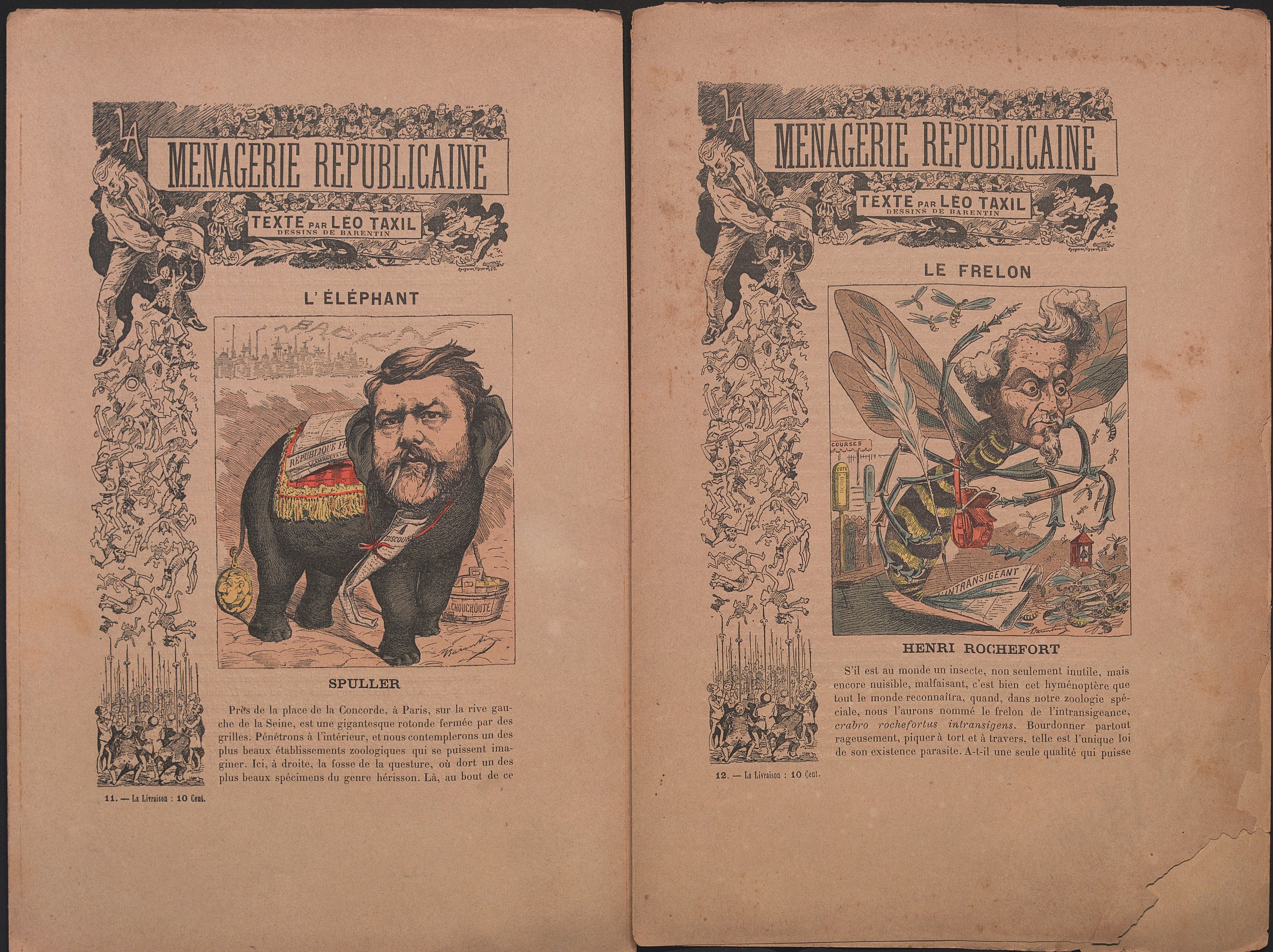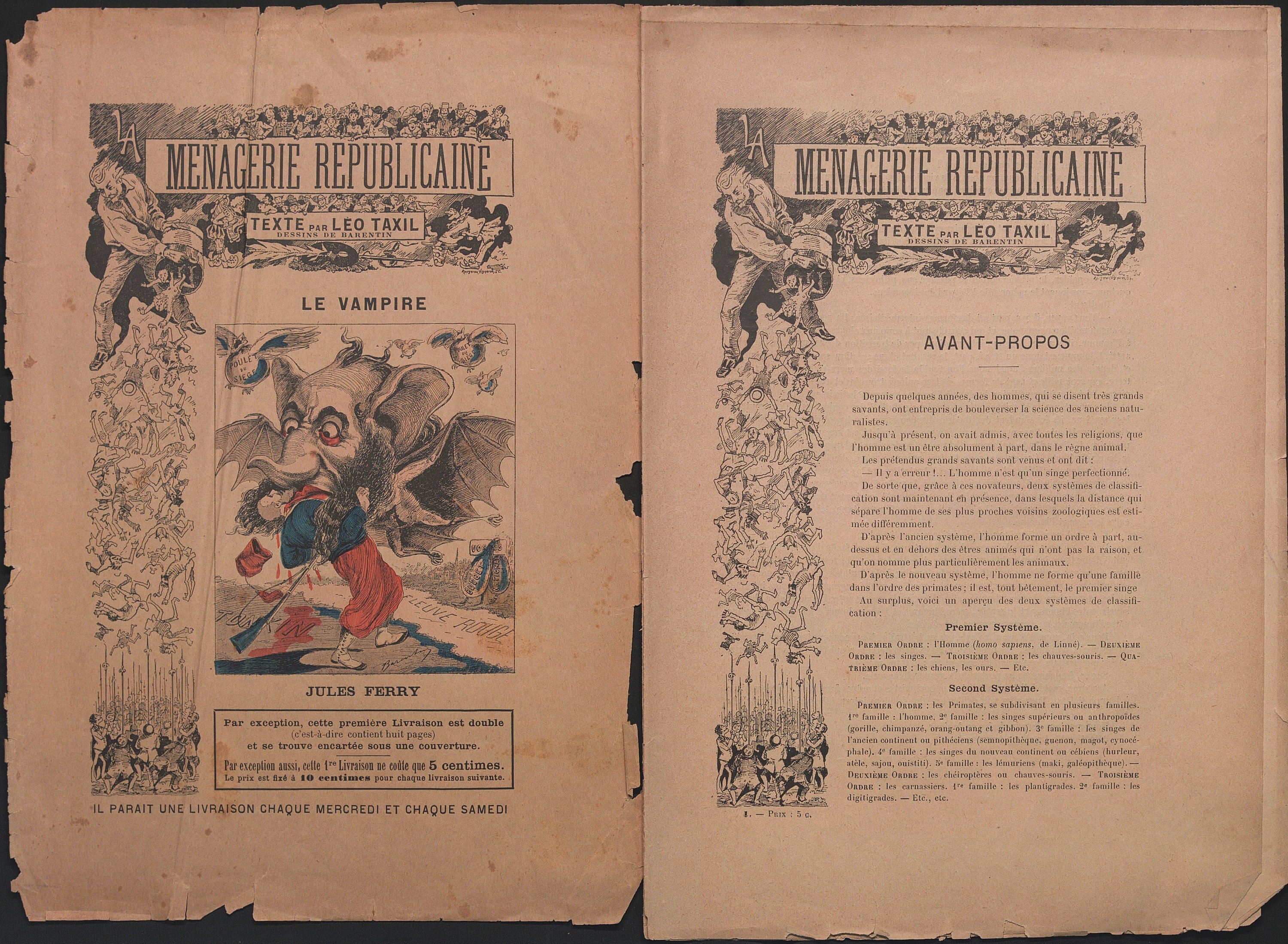 Véritable kaléidoscope à la manière de la Ménagerie Impériale de Paul Hadol publiée en 1870, l’auteur livre un portrait très ressemblant de l’homme politique visé, combinant la physionomie du personnage avec le corps de l’animal auquel la verve satirique de Léo Taxil l’assimilé: Jules ferry le vampire ; Jules Grévy le macaque ; Jules Simon le caméléon...