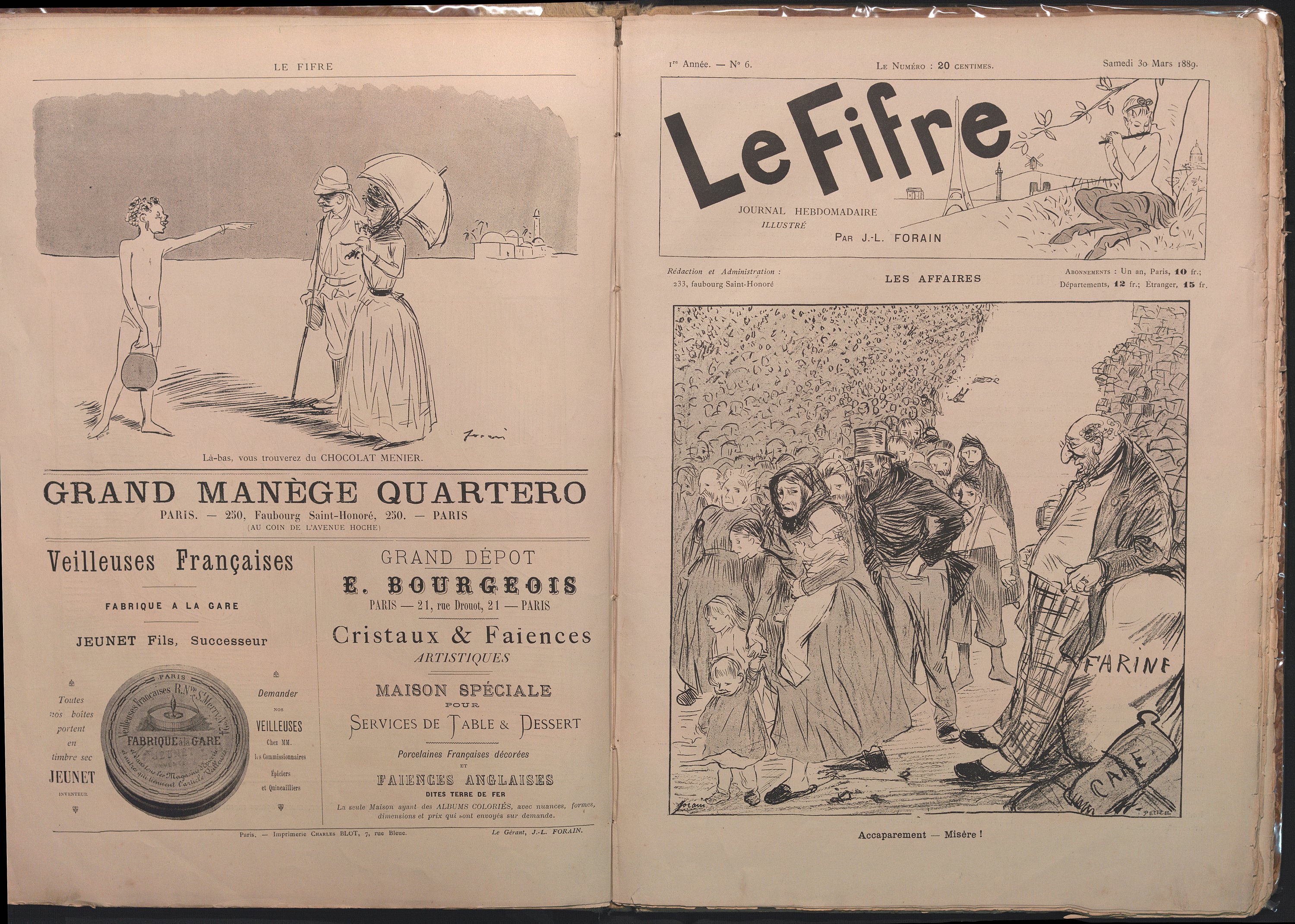Journal fondé par Jean-Louis Forain, qui se termina rapidement par une saisie, le dernier numéro publié est le n°15 du 1er juin 1889. Nombreuses illustrations de Forain et textes de Emile André, Champigneulles, Paul Hervieu, Jacques Le Lorrain, Paul Masson, Jean Richepin, Aurélien Scholl, Armand Silvestre.