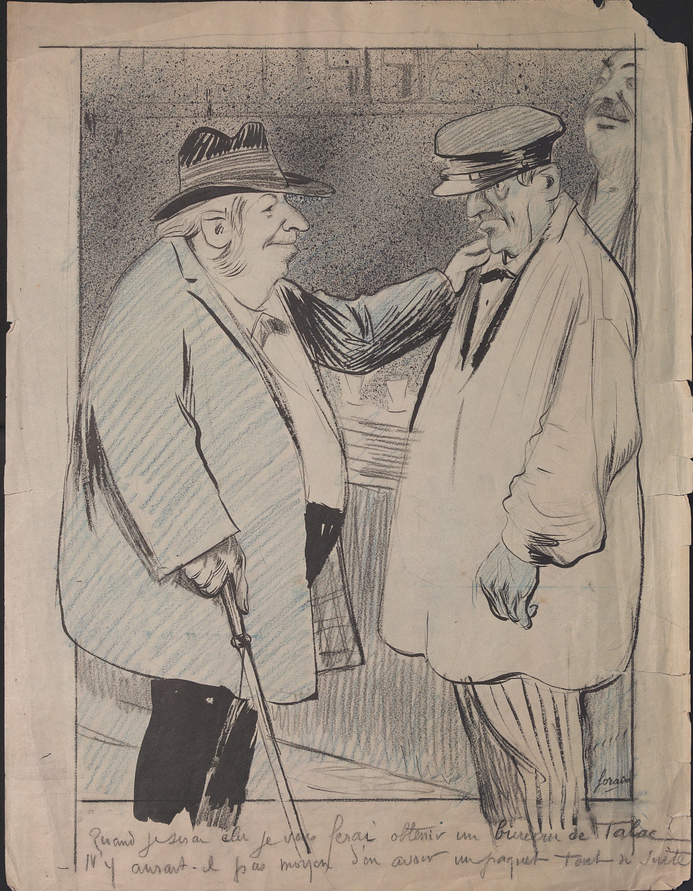 Sans titre, encre, fusain et crayon bleu, sur papier, signé en bas à droite « Forain », légendé « Quand je serai élu je vous ferai obtenir un bureau de tabac. N’y aurait-il pas moyen d’en avoir un paquet tout de suite », 45 x 34,5 cm (déchirures et plis).