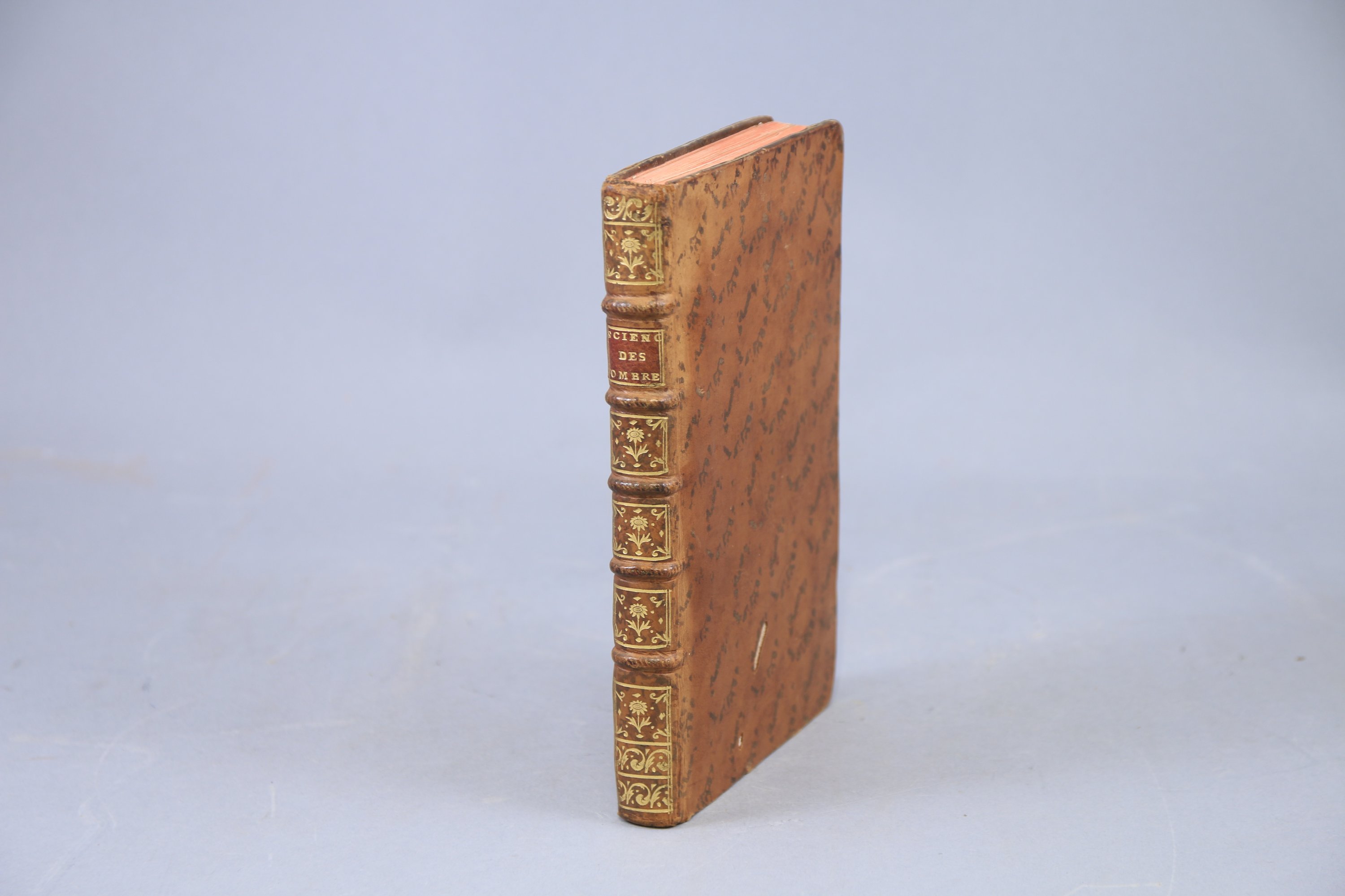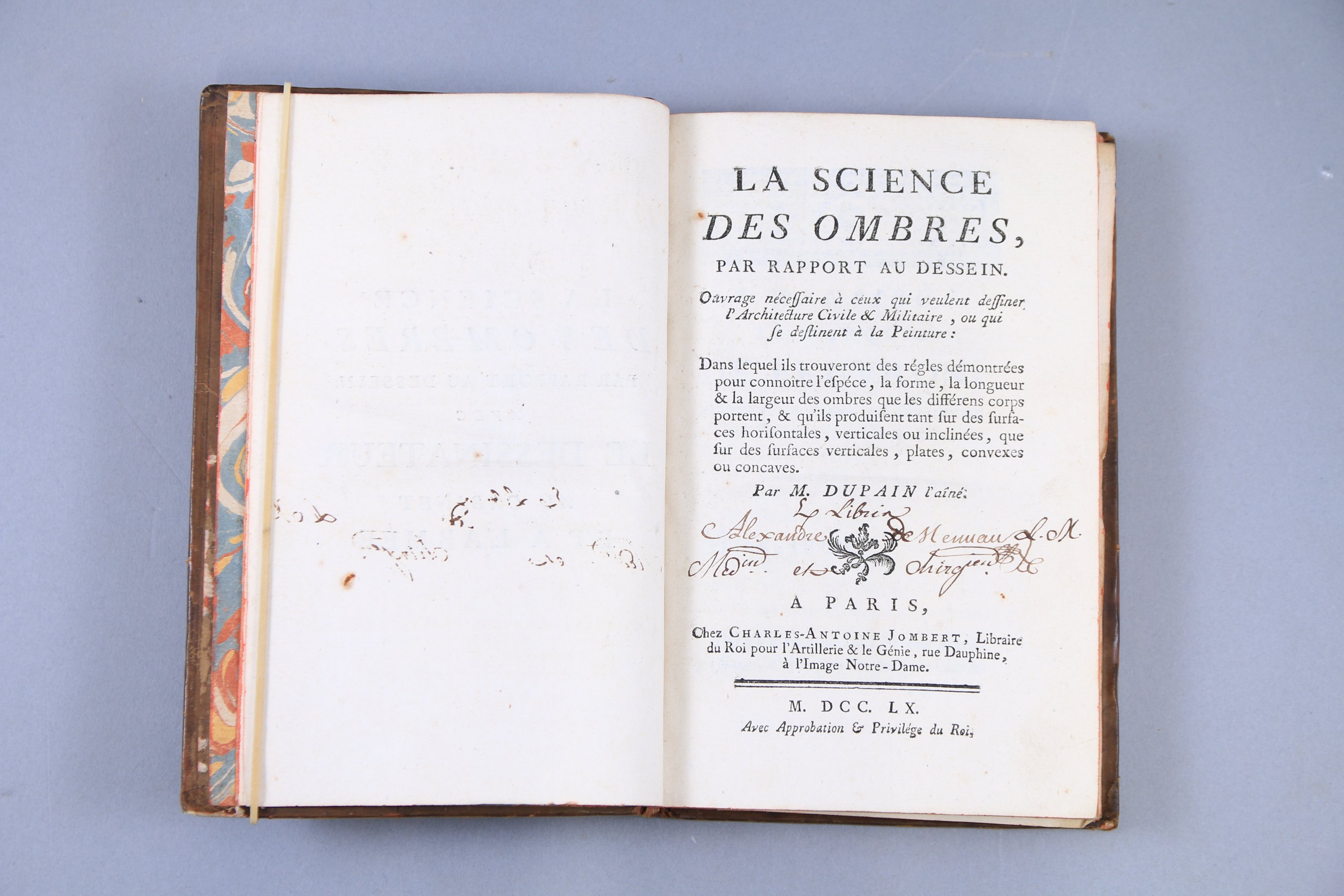 DUPAIN. La Science des ombres, par rapport au dessein. Ouvrage nécessaire à ceux qui veulent dessiner l'architecture civile et militaire, ou qui se destinent à la peinture. Paris, Charles-Antoine Jombert, 1760. In-8, xvi pp. dont faux-titre et titre, 92 pp., 10 pl. dépliantes ; [à la suite] Le Dessinateur au cabinet et à l'armée: faux-titre iii pp., pp. 95-168, 4 pl. dépliantes, (2) ff. privilège ; veaumarvré, dos à nefrs orné (Rel. de l'époque).