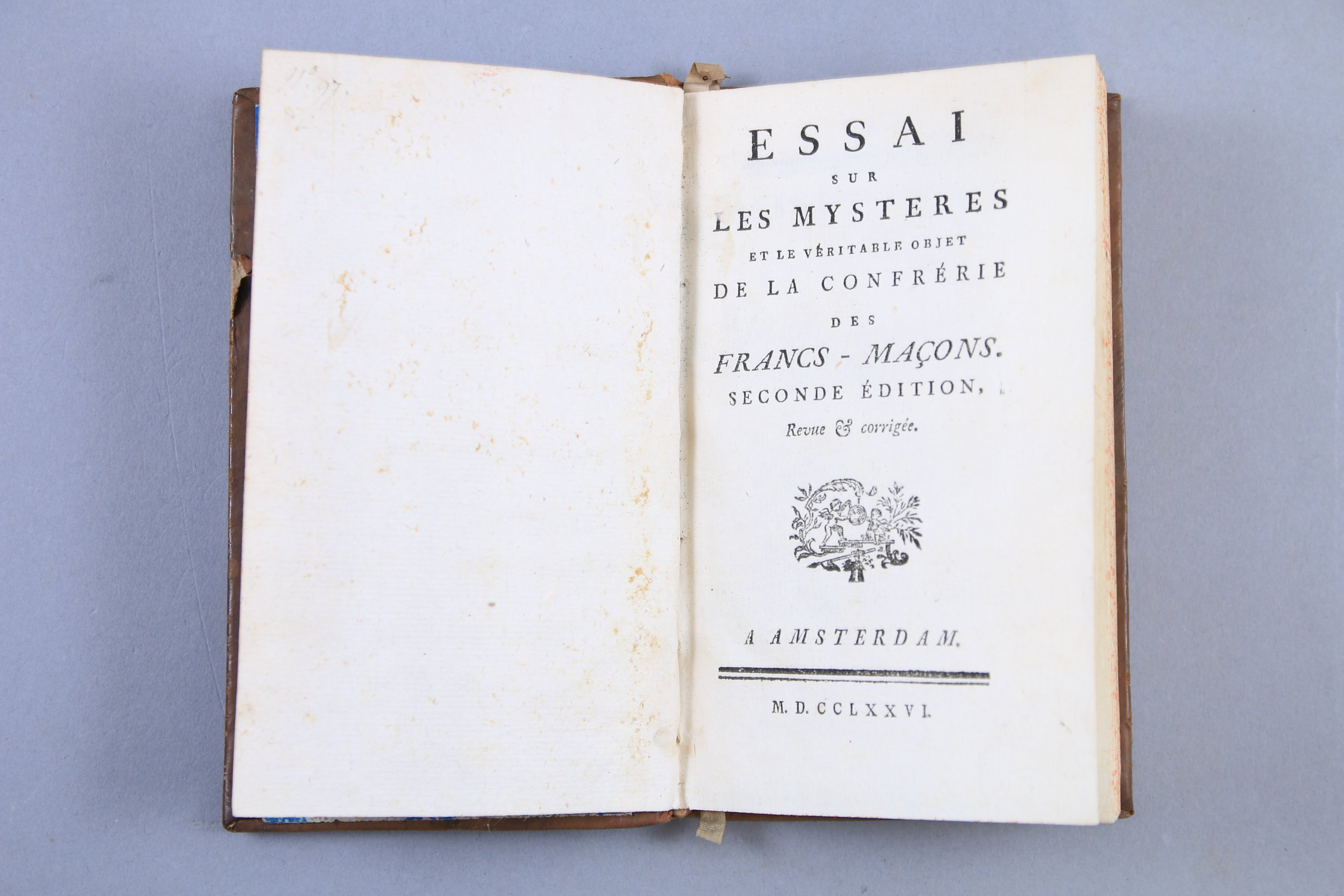FRANC-MAÇONNERIE. — Essai sur les mystères et le véritable objet de la confrérie des francs-maçons. Seconde édition, revue et corrigée. Amsterdam, 1776. 40 pp. — [ANDERSON (James)]. Les devoirs, statuts ou règlemens généraux des francs-maçons ; mis dans un nouvel ordre et approuvé par la Grande loge des Septs Provinces Unies des Pays-Bas. Imprimé dans ce monde, et se trouve chez le vrai sage, 1775. Titre, 64 pp., (2) ff. de table, xii pp. de préface (mal placées). — 2 ouvrages en un vol. in-12, veau marbré, dos lisse orné (Rel. de l'époque).
