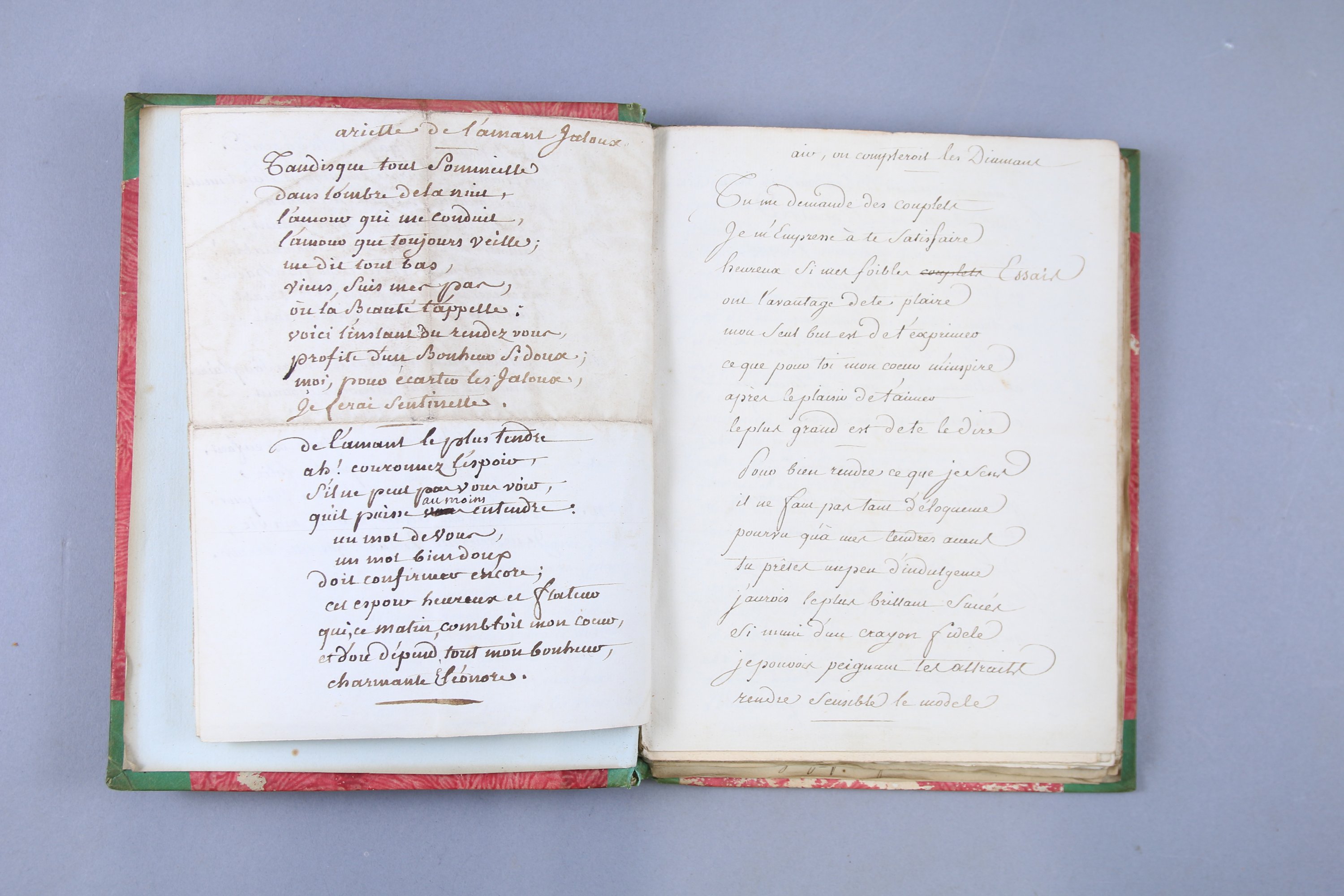 Non signées, certaines avec ratures: "Air du droit du seigneur, Air du secret, La Plaideuse, sur l'air J'aime le mot, j'aime le mot, j'aime le mot pour rire, Chanson bacchique, Chanson sur l'Amérique, Sur l'air de Beaumarchais, Sur l'air du vaudeville de Figaro"…