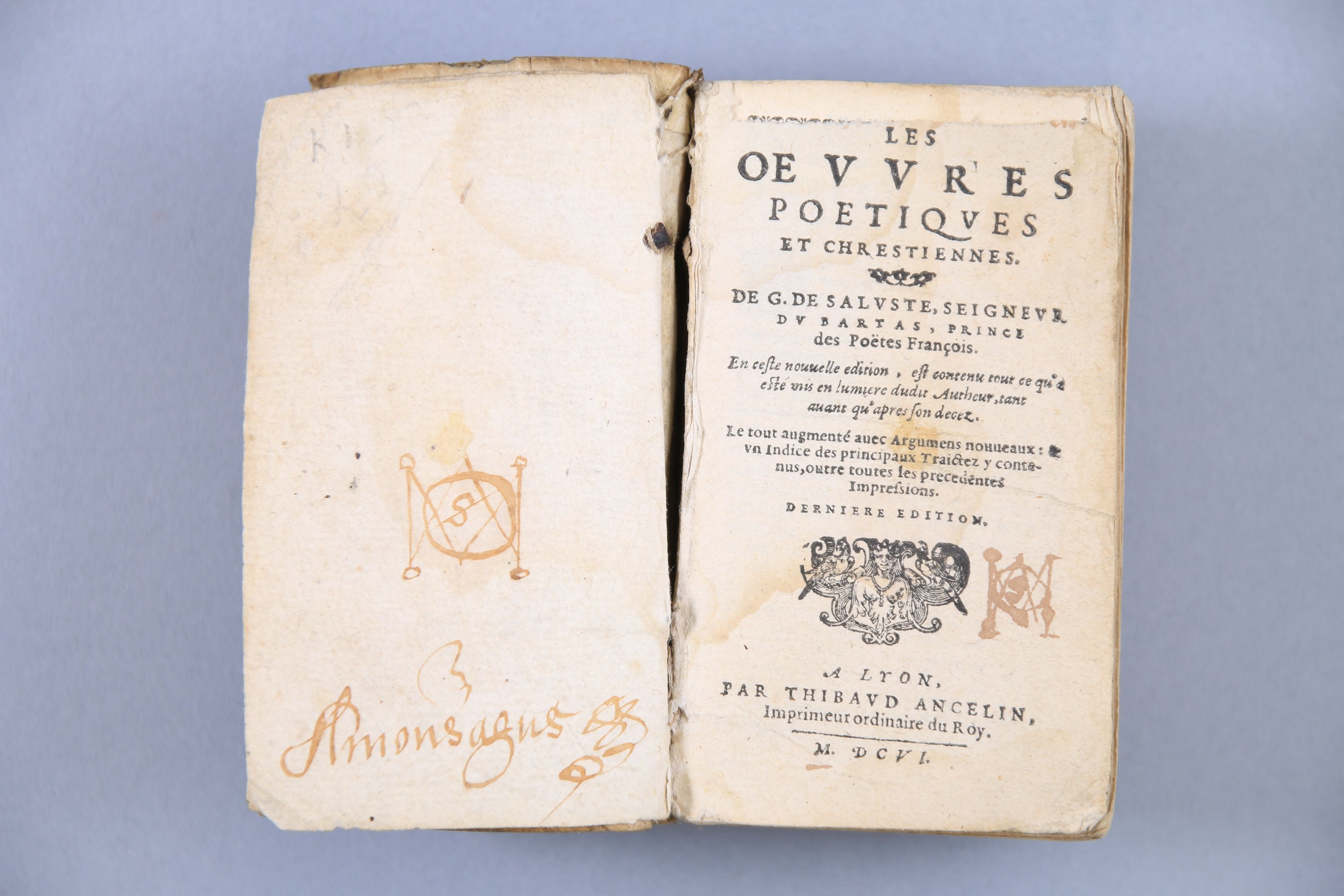 Les Oeuvres poétiques et chrétiennes de G. de Saluste, seigneur du Bartas, Prince des Poètes François. En cette nouvelle édition, est contenu tout qu'a été mis en lumière dudit autheur tans avant qu'après sa mort.. Le tout augmenté avec argumens nouveaux....
