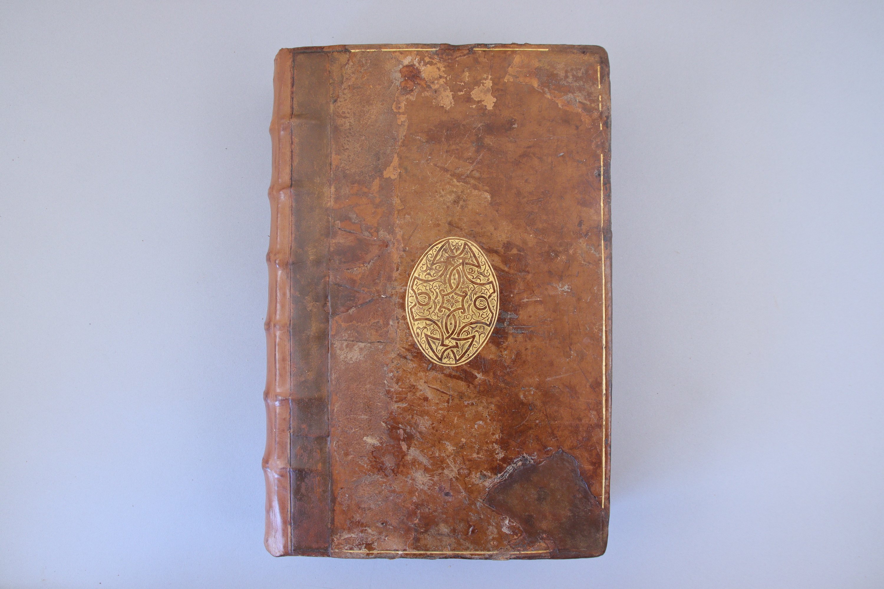 2 parties avec titre et collation séparés en 1 fort volume in-folio. (8 ff), 812 pages, (16 ff) de table: 344 pages, (5 ff) 63 pages, (1 page). Plein veau fauve avec large olive d'arabesques au centre des plats (Epidermures sur les deux plats. Le dos a été très maladroitement refait ; les gardes ont été changées. Galerie de vers dans la marge de queue, touchant un peu le texte sur les derniers feuillets)..