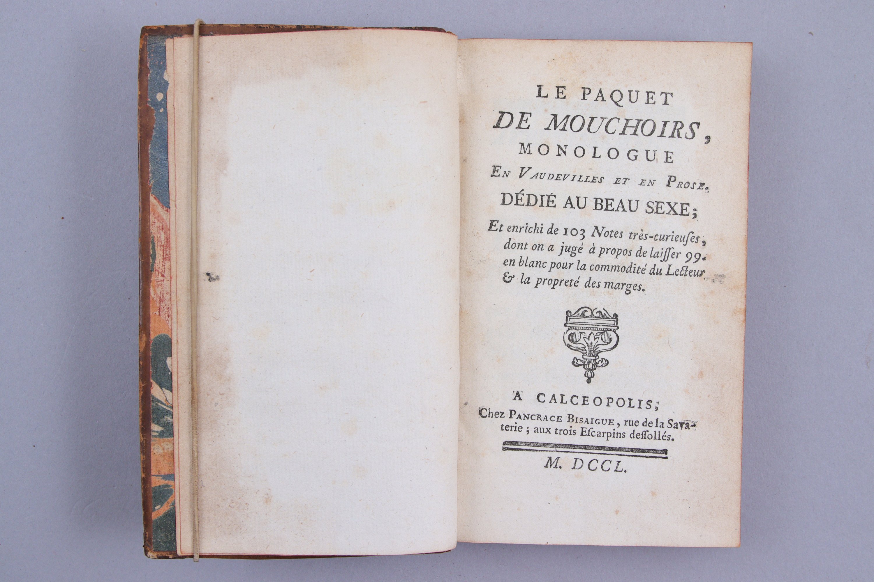 Le paquet de mouchoirs, monologue en vaudeville et en prose dédié au beau sexe, et enrichi de 103 notes très curieuses dont on a jugé à propos de laisser 99 en blanc pour la commodité du lecteur et la propreté des marges.