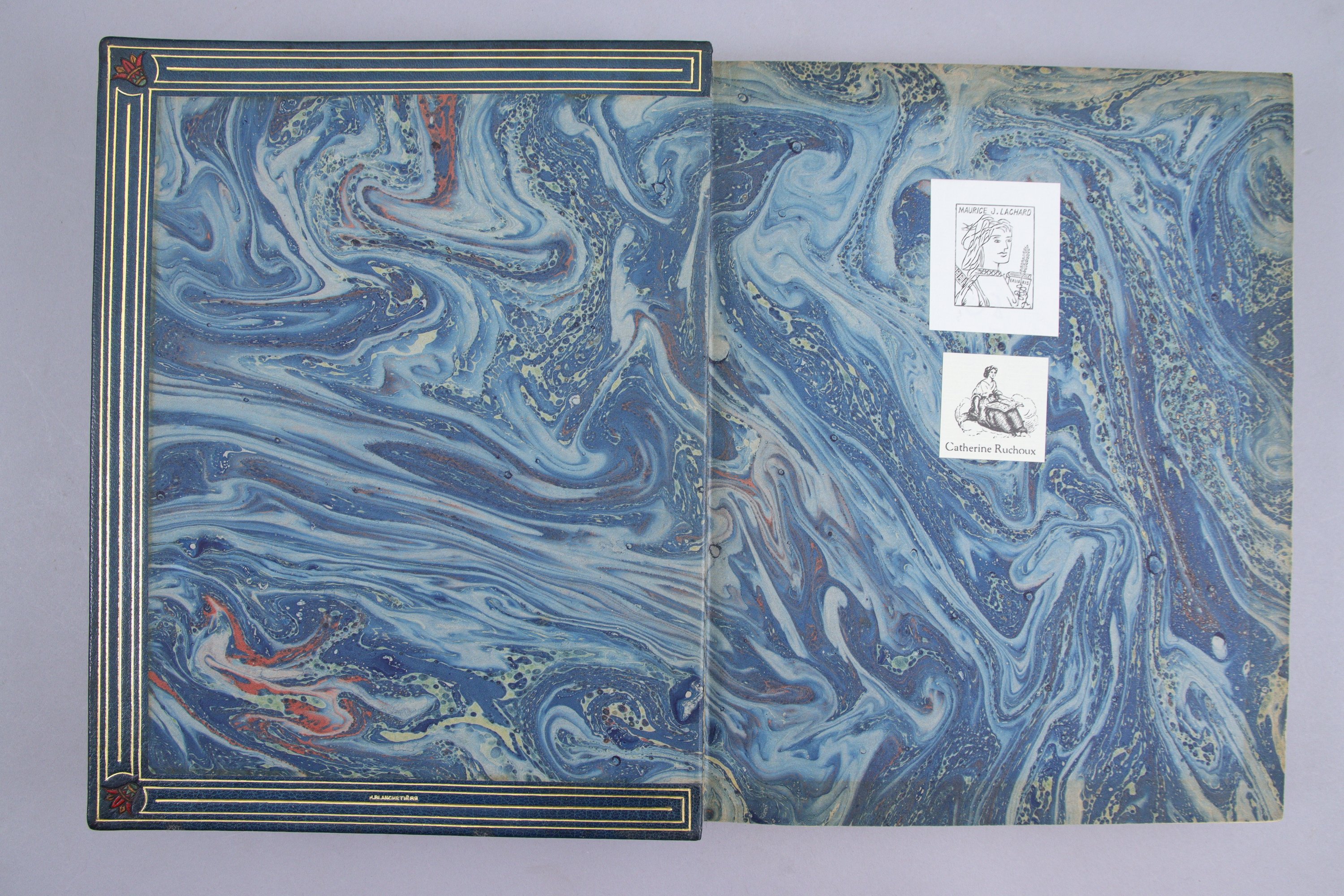 In-4°, plein maroquin vert bouteille à gros grains. Plats jansénistes, dos mosaïqué. Large décor intérieur composé de 5 filets droits avec fleurons mosaïqués dans les angles. Tête dorée. Etui. Reliure signée Blanchetière.