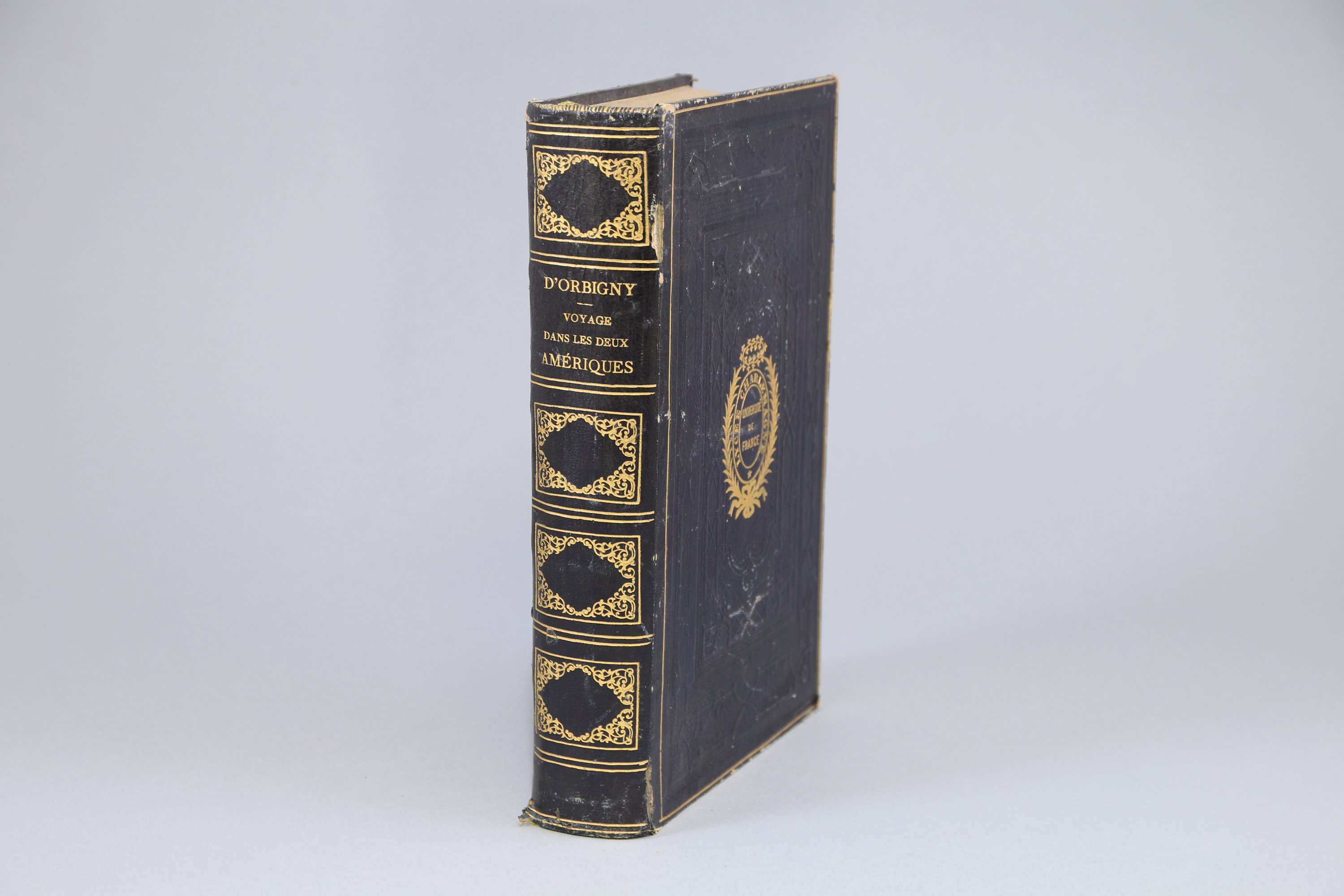Grand in-8 (260 X 170 mm), IV et 615 pages. 1/2 veau, plats de percaline ornés des fers du Lycée Charlemagne. Toutes tranches dorées (Mors fendus sur 5 cm, coins et coiffes très usés)..
