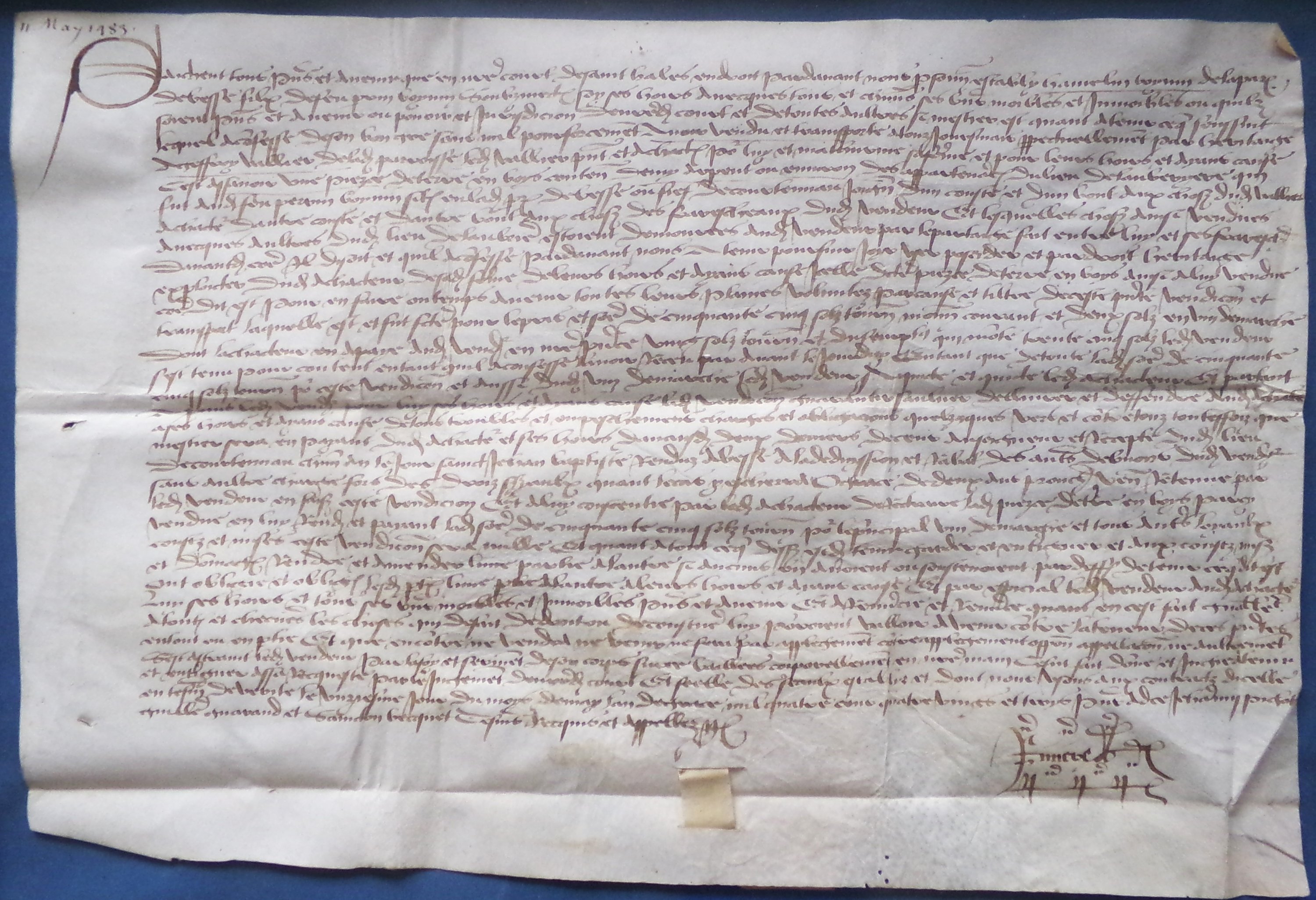 Sentence d’assises, 15 avril 1507, rendu par le bailli de la seigneurie de Bonneval sur Braye (Bonneveau) et de Vancé au sujet des biens meubles ayant appartenu à feu messire Antoine Martin prêtre chevecier de l’église collégiale de Saint Martin de Trôo et devant revenir à messire Jean Berziau, écuyer seigneur de Courtanvaux par droit de moyenne et basse justice, 43 x 26 cm.