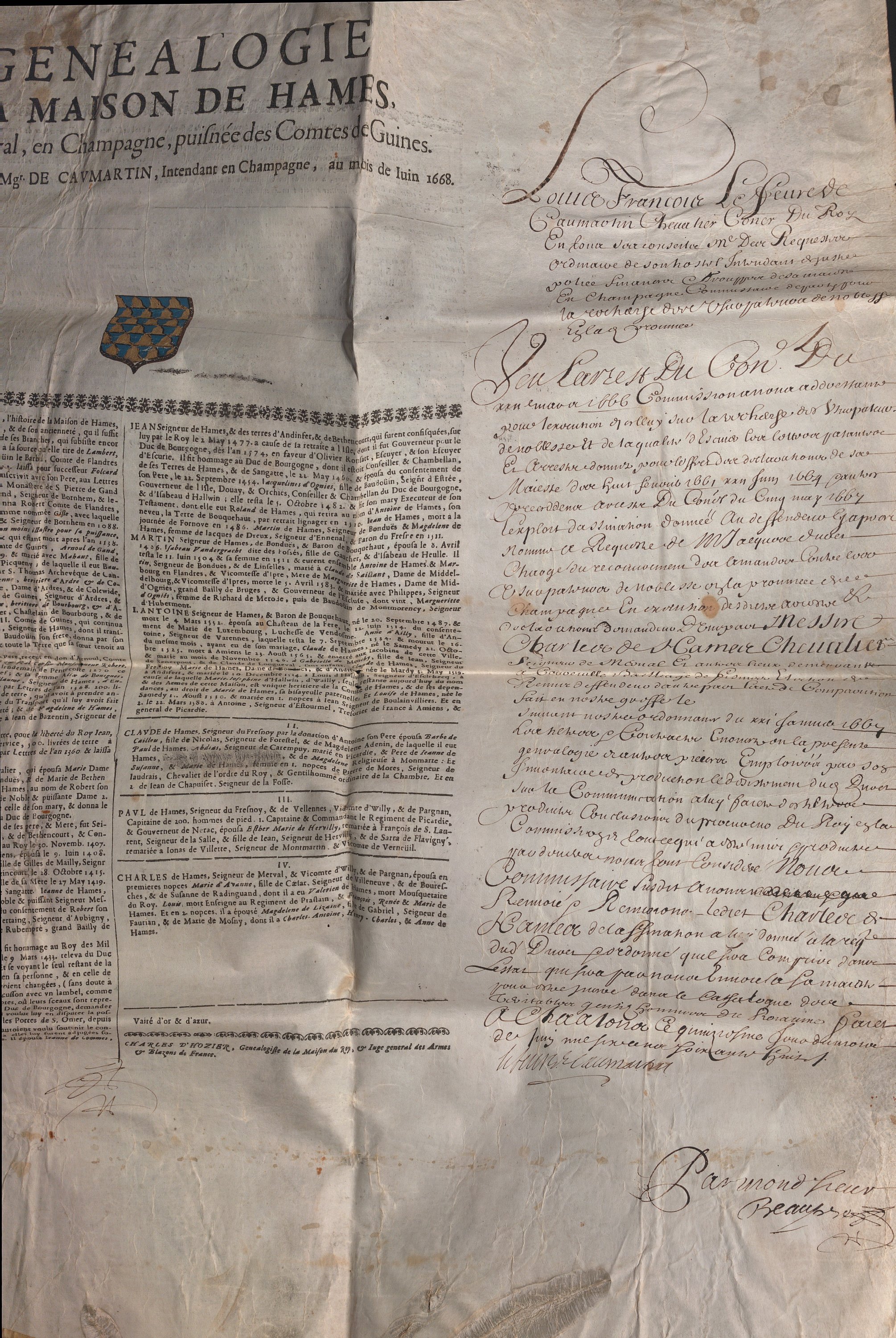 Confirmation de noblesse, grand parchemin, 64,5 x 53 cm, Châlons-en-Champagne, 15 juin 1668, en partie imprimée et manuscrite, titré « Généalogie de la maison de Hames, Seigrs de Merval, en Champagne, puisnée des Comtes de Guines », suivi des armoiries dessinées à la plume et rehaussées à la gouache: Vairé d’or et d’azur, et en impression de la généalogie ascendante de Charles de Hames, seigneur de Merval, demeurant à Coureville, bailliage de Fismes et élection de Reims, validée par Charles d’Hozier juge d’armes du roi.