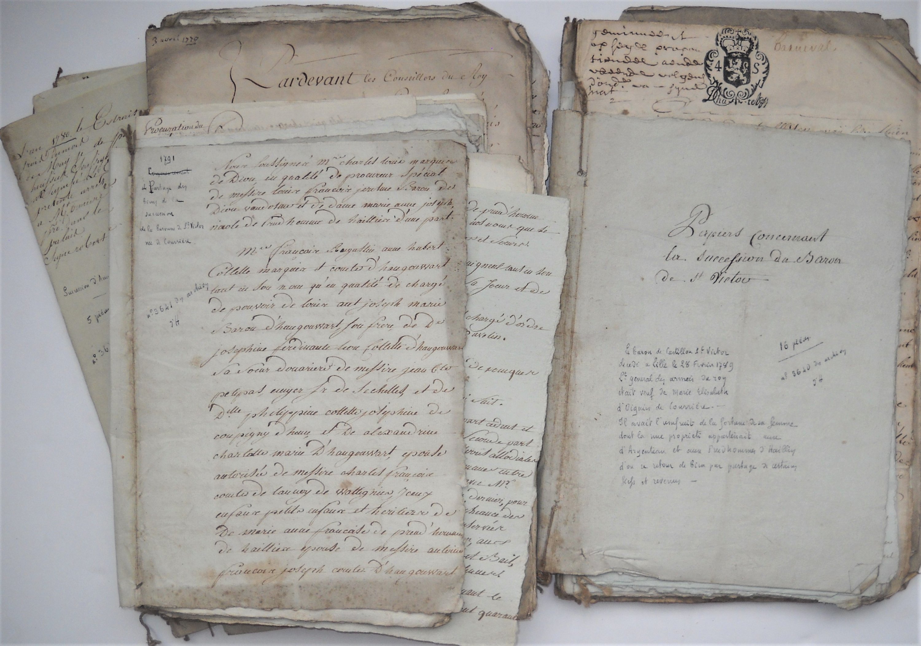 Réunion de + de 50 pièces manuscrites, fin du 18e siècle, papier, formats divers, relatives à la succession de Louis Auguste Félicien de Castillon, chevalier, baron de Saint Victor, lieutenant-général des armées du roi, commandant général des troupes royales à Saint Domingue, décédé à Lille le 28 février 1789, veuf de Marie Elisabeth d’Ongnies de Courrière.