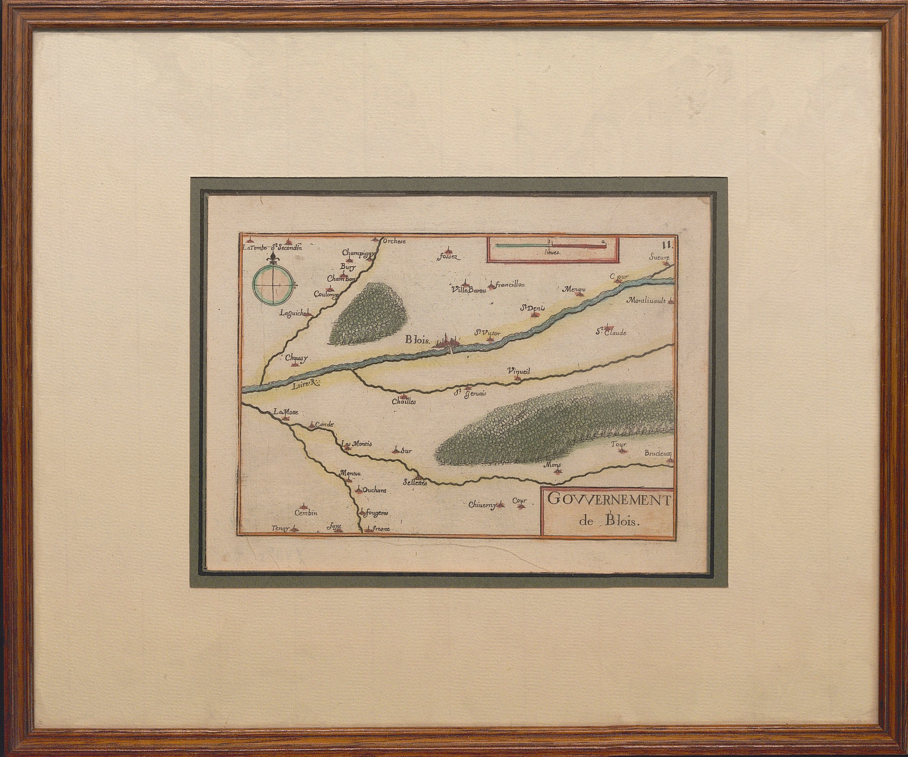 Petite carte gravée avec rehauts de couleurs extraite de l’atlas « les plans et profils de toutes les principales villes et lieux considérables de France » par Tassin, sous cadre 26,5 x 31,5 cm (18 x 13 cm à vue).