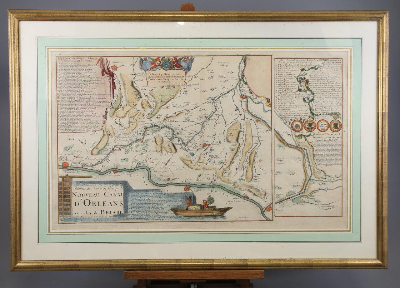 Les deux jonctions des deux grandes rivières de Loire et de Seine par le Nouveau Canal d’Orléans et celuy de Briare. Mis au jour par le Sr de Fer. Paris, dans l’isle du Palais sur le quay de l’Orloge à la Sphère Royale avec privilège du Roy, 1705. Gravure en taille douce à rehauts de couleurs d’époque. 41 x 68 cm à vue (sous cadre).