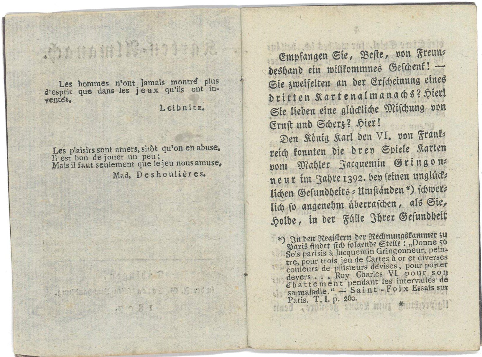Johann Friedrich Cotta, est à la tête vers 1804 de la maison d'édition J.G. Cotta (son grand-père) de Tobingen en Allemagne. J. F. Cotta a continué de produire une série de six almanachs de cartes à jouer dans les années successives de 1805-1811, avec un nouveau jeu apparaissant dans toutes ces années sauf en 1808.