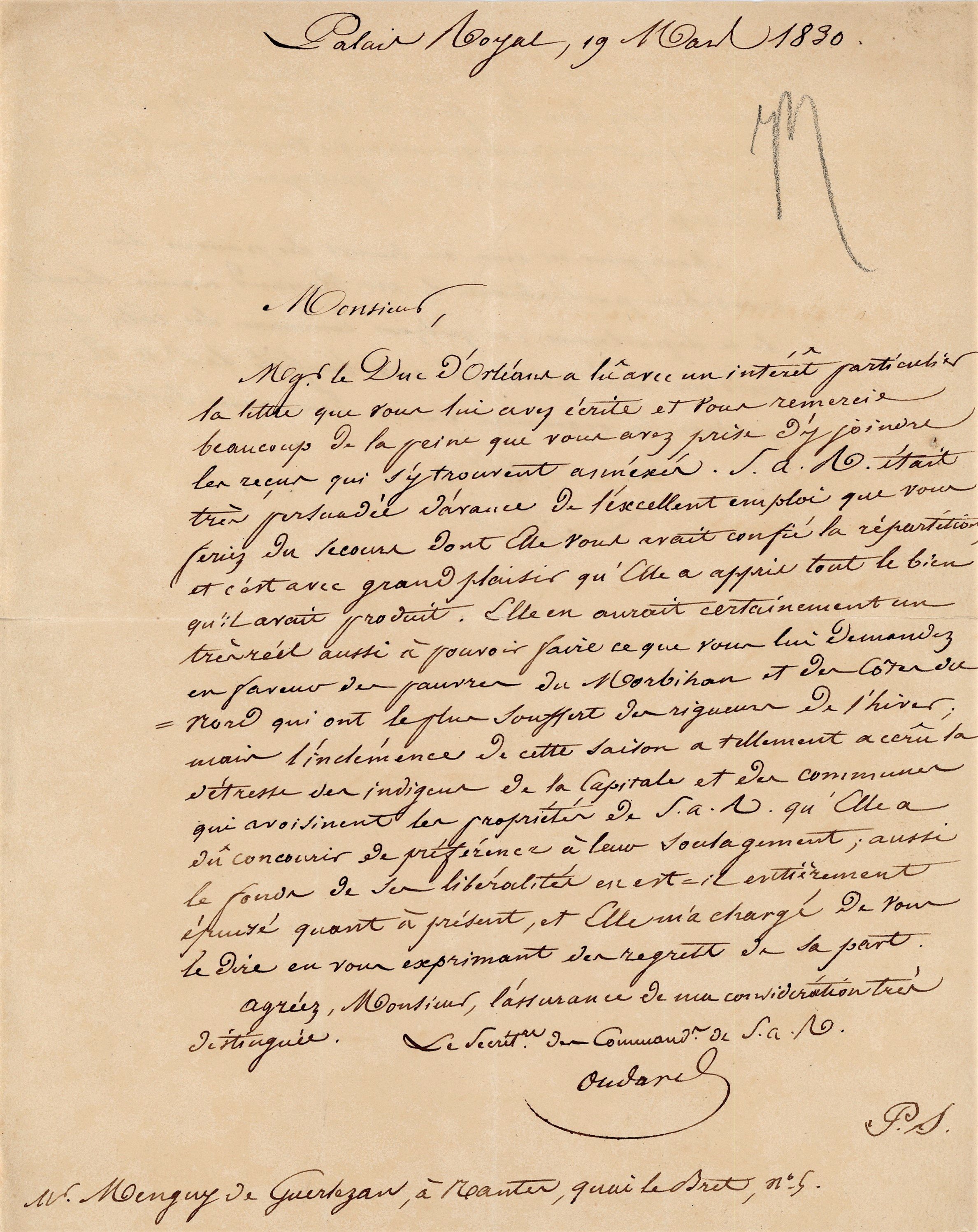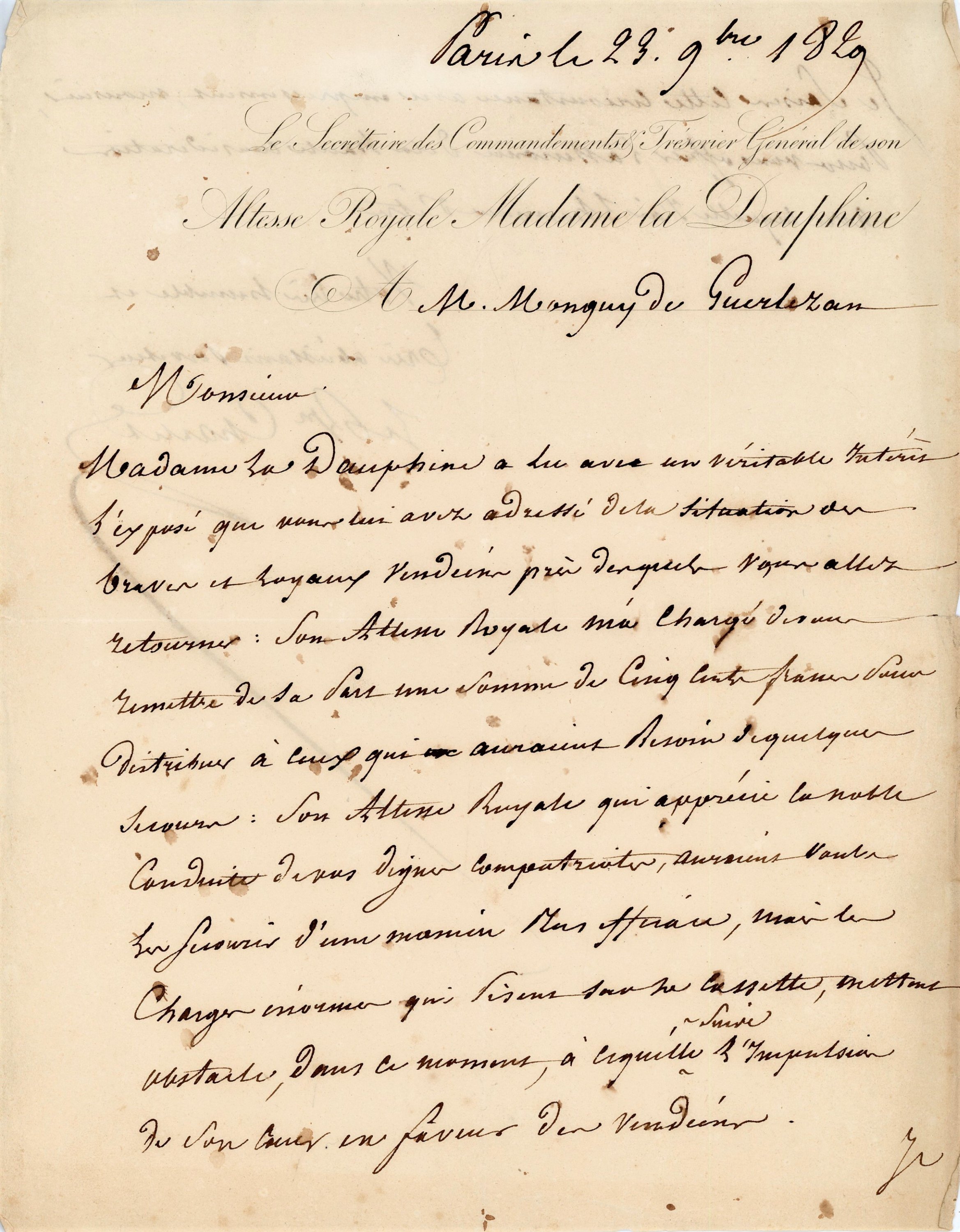 Réunion de + de 95 L.A.S. et L.S., 1820-1838, adressées à Joseph-Marie Menguy de Guerlezan, formats divers, en provenance des nombreux cabinets ministériels et des maisons princières (Dauphin et Dauphine, duc de Bordeaux, d’Orléans et de Bourbon), répondant aux demandes de secours et de sollicitations de placement, dont: