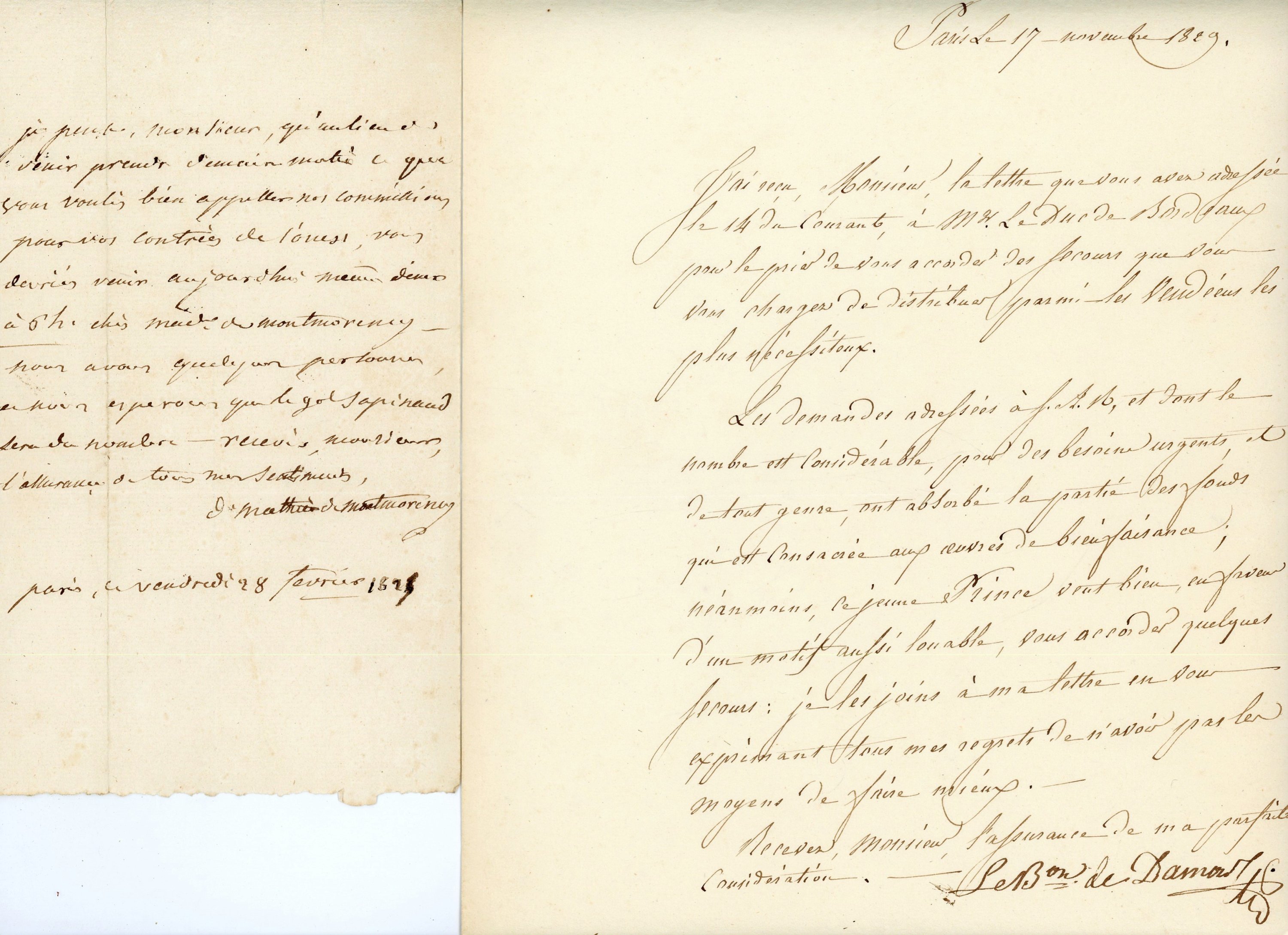 • Nombreuses lettres signées de ministres en réponse à des demandes de secours, 1829-1830, dont L.S., 28 novembre 1829, Jules prince de Polignac (1780-1847), président du Conseil des ministres et ministre des Affaires étrangères