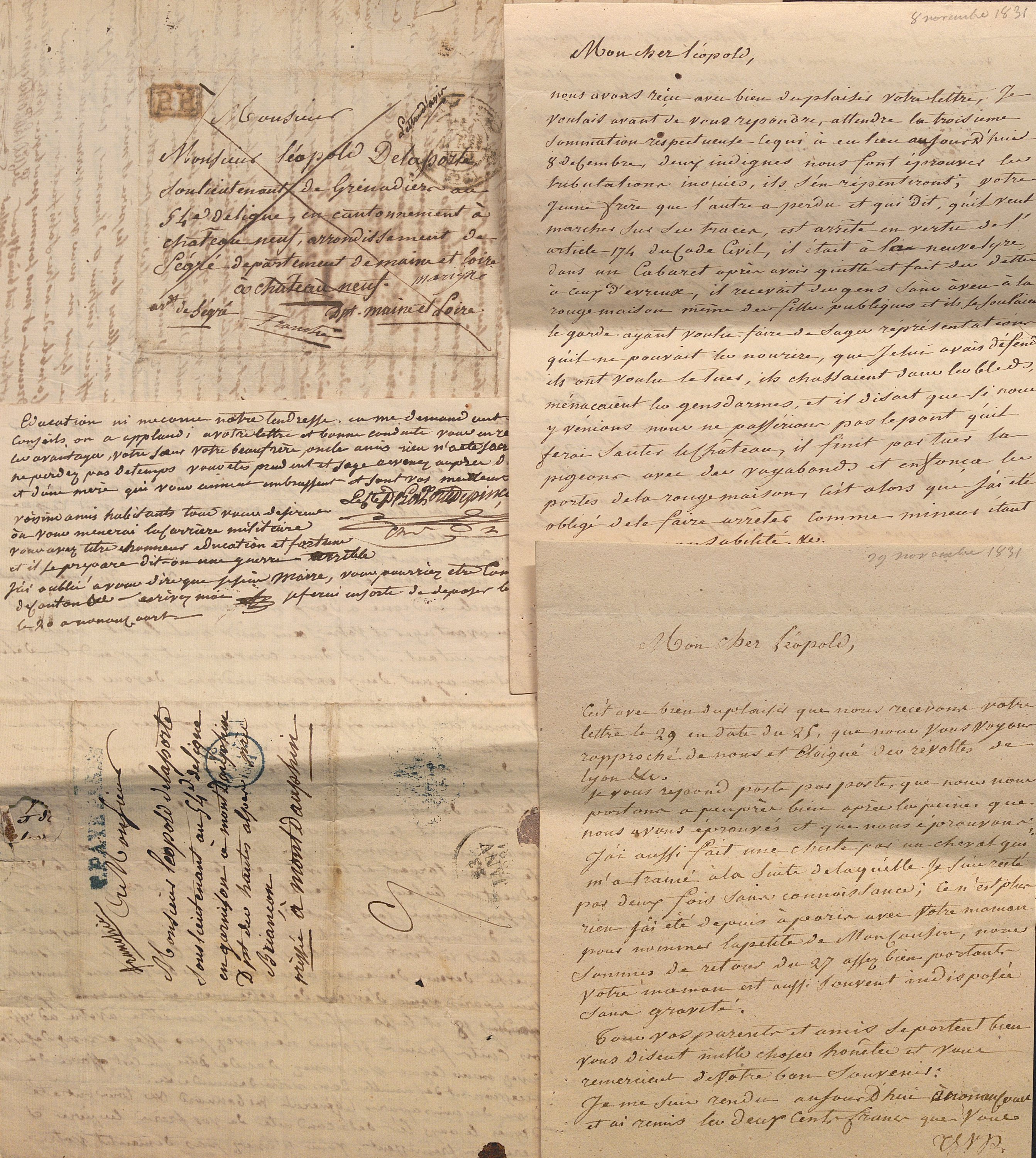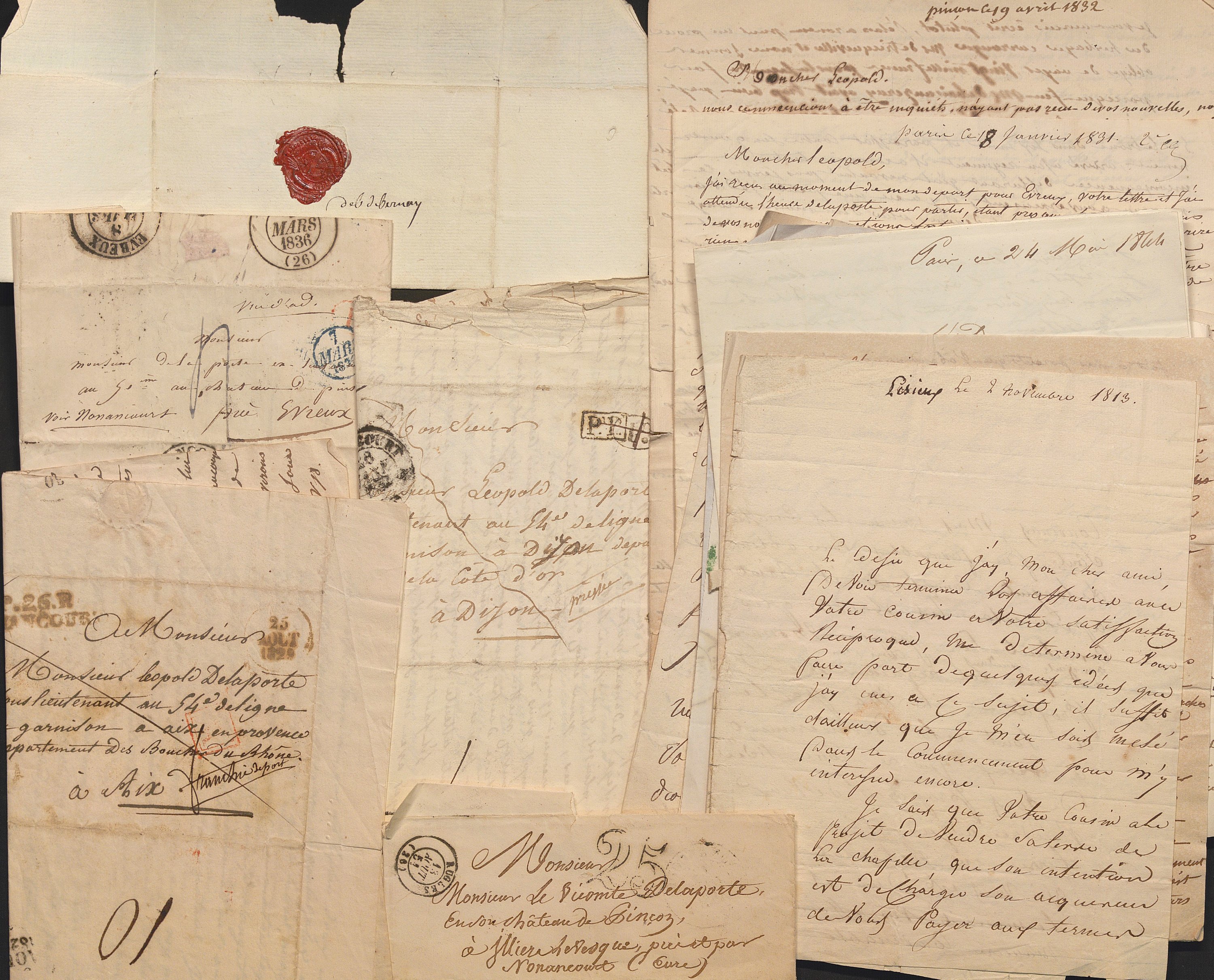 Correspondance passive, env. 55 L.A.S., 1813-1883, adressées à Gaspard comte de la Porte chevalier de Saint Louis, seigneur de Pinson, maire d’Illiers-L’Evêque et conseiller général (1778-1848) et à son fils Léopold de la Porte (1803-1886) officier démissionnaire au lendemain des troubles de la Vendée de 1832, propriétaires du château de Pinson à Illiers-L’Evêque (Eure). Conservées dans une boite en bois de palissandre.