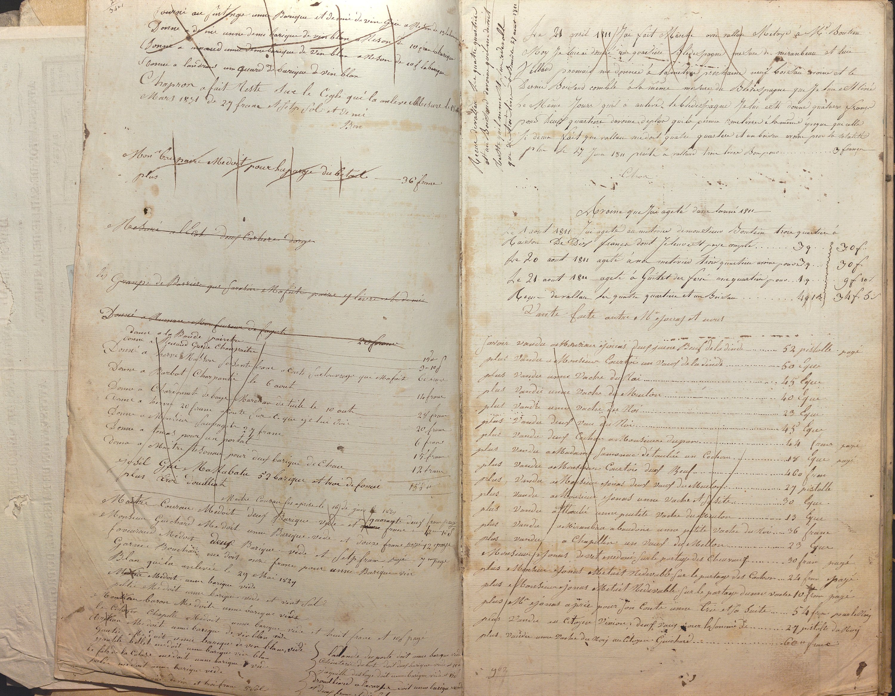 Registre manuscrit, 1811-1863, rel. couv. velin + de 80 pp. in-fol contenant les notes de dépenses et recettes faites par la famille Fourcade pour la gestion de leur domaine agricole et viticole à Braud (Gironde) : entretien des vignes, achat et vente de bétail, salaires des métayers et domestiques, vente de barriques de vin, etc.