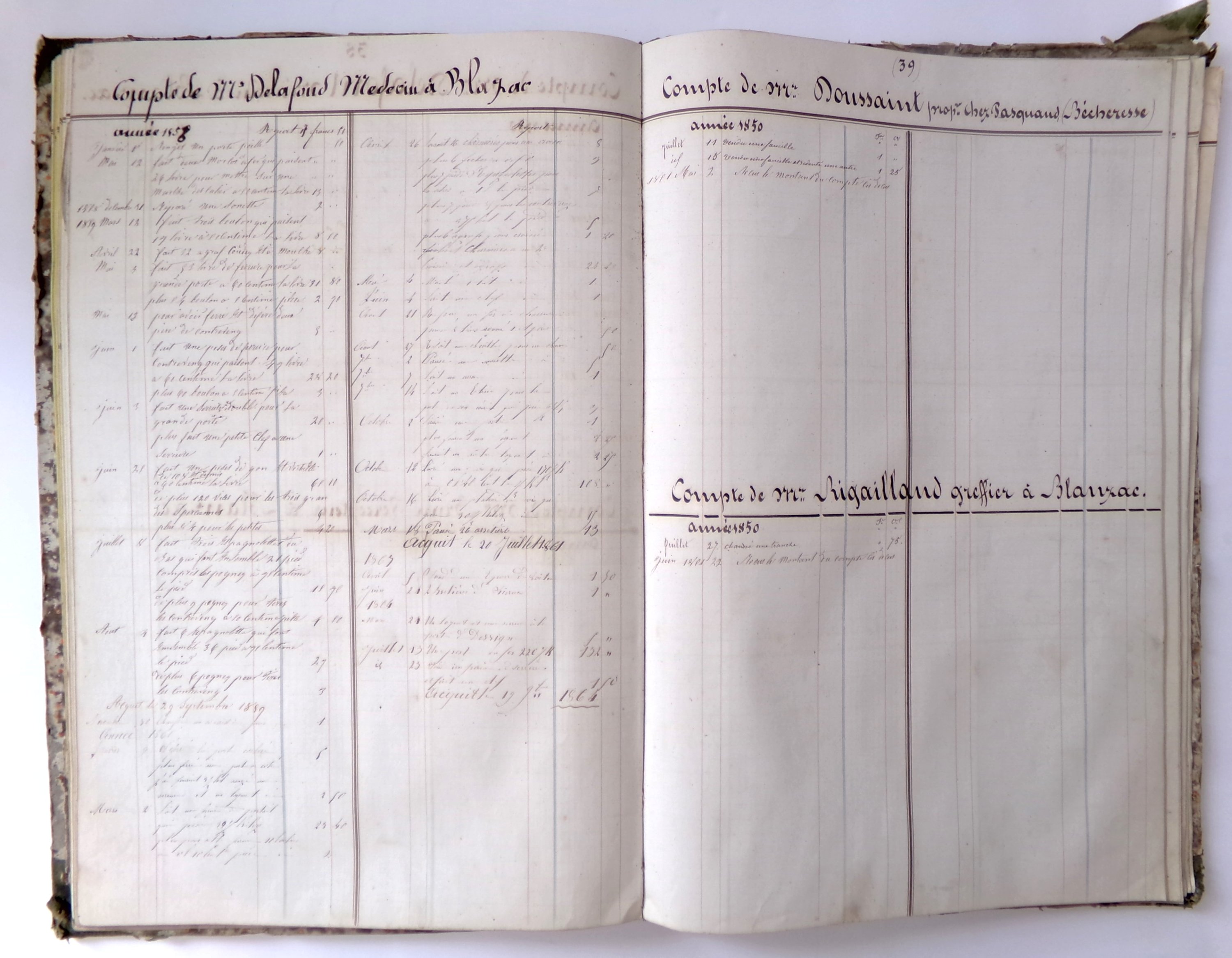 Grand livre de compte, 1844-1870, 114 p. rel. grand in-fol., ayant appartenu à Jean Bourdier (1818-1879), serrurier-mécanicien-armurier demeurant Grand’rue à Blanzac-Porcheresse, époux et de Anne Sazerac.
