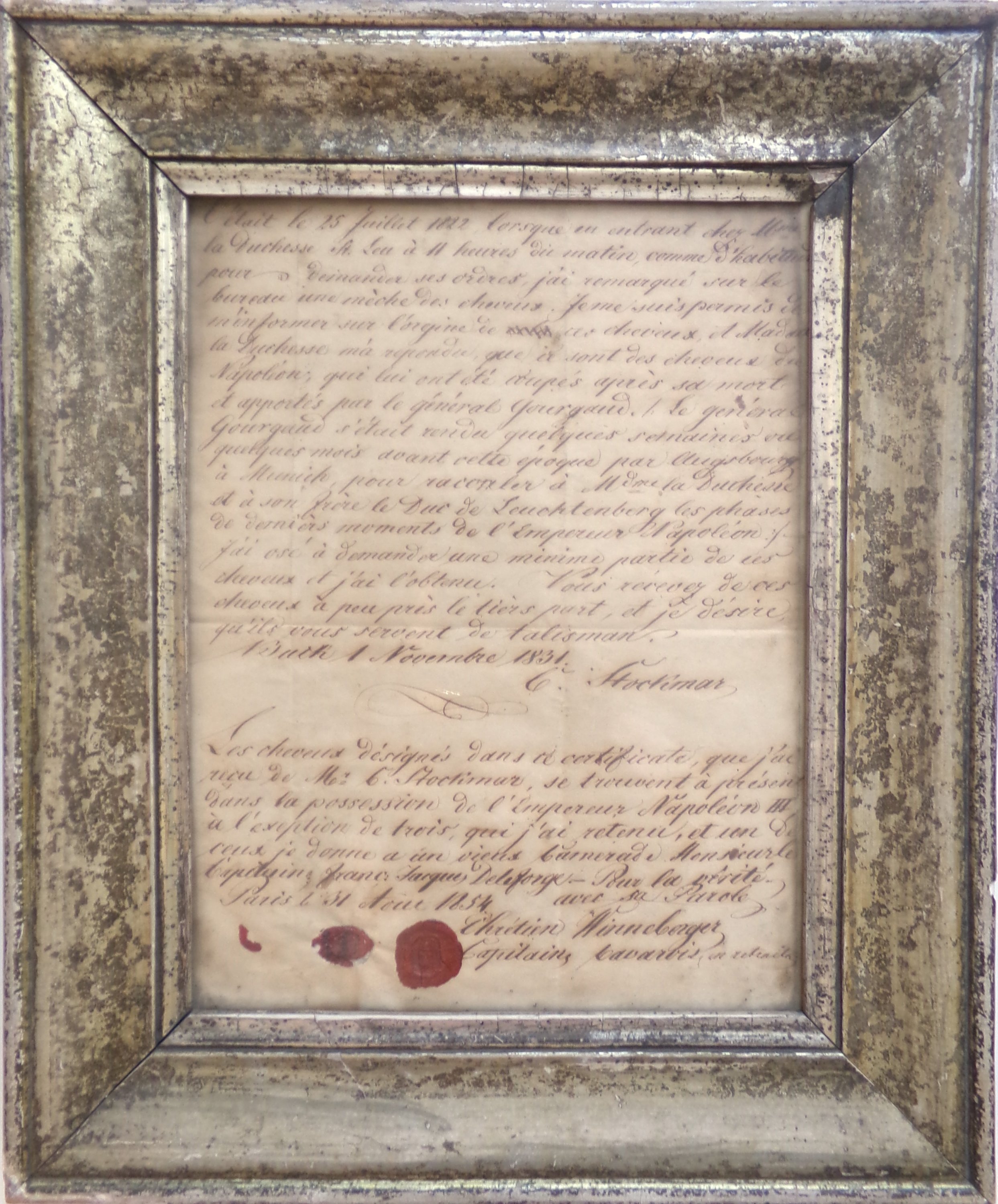Les cheveux désignés dans ce certificate que j’ai reçu de M. C. Stockmar, se trouvent à présent dans la possession de l’empereur Napoléon III à l’exception de trois, que j’ai retenu et un de ceux je donne à un vieux camarade monsieur le capitaine Franc. Jacques Delaforge. Pour la vérité avec sa parole. Paris, 31 août 1854, Chrétien Winneberger » avec cachets de cire rouge.