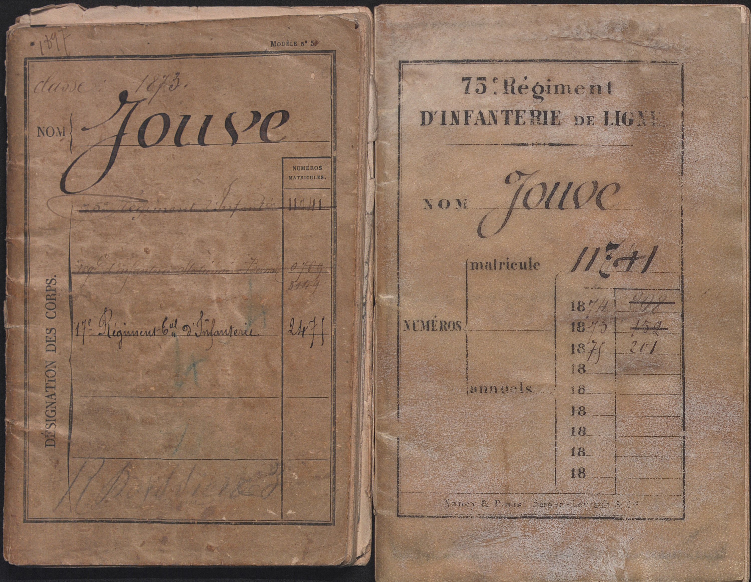 Livret militaire et livret d’homme de troupe du 75e régiment d’infanterie de ligne ayant appartenu à Victor Amable Alexandre Jouve, né le 19 mars 1854 à Saint Flour (Cantal).