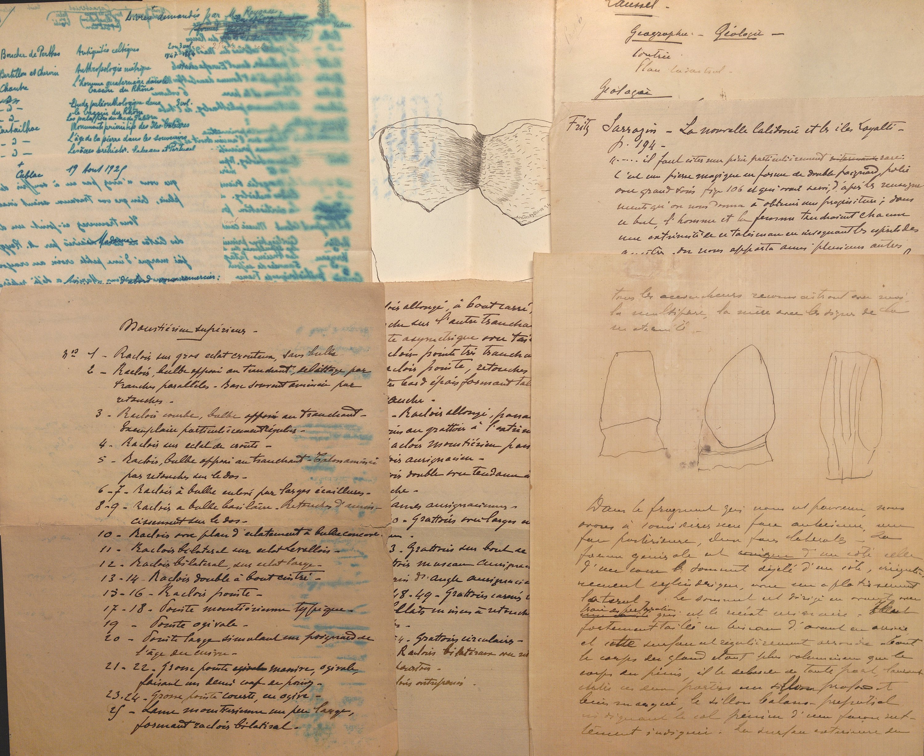 Partie de notes manuscrites avec croquis concernant les fouilles à l’abri de Laussel (Dordogne) ;