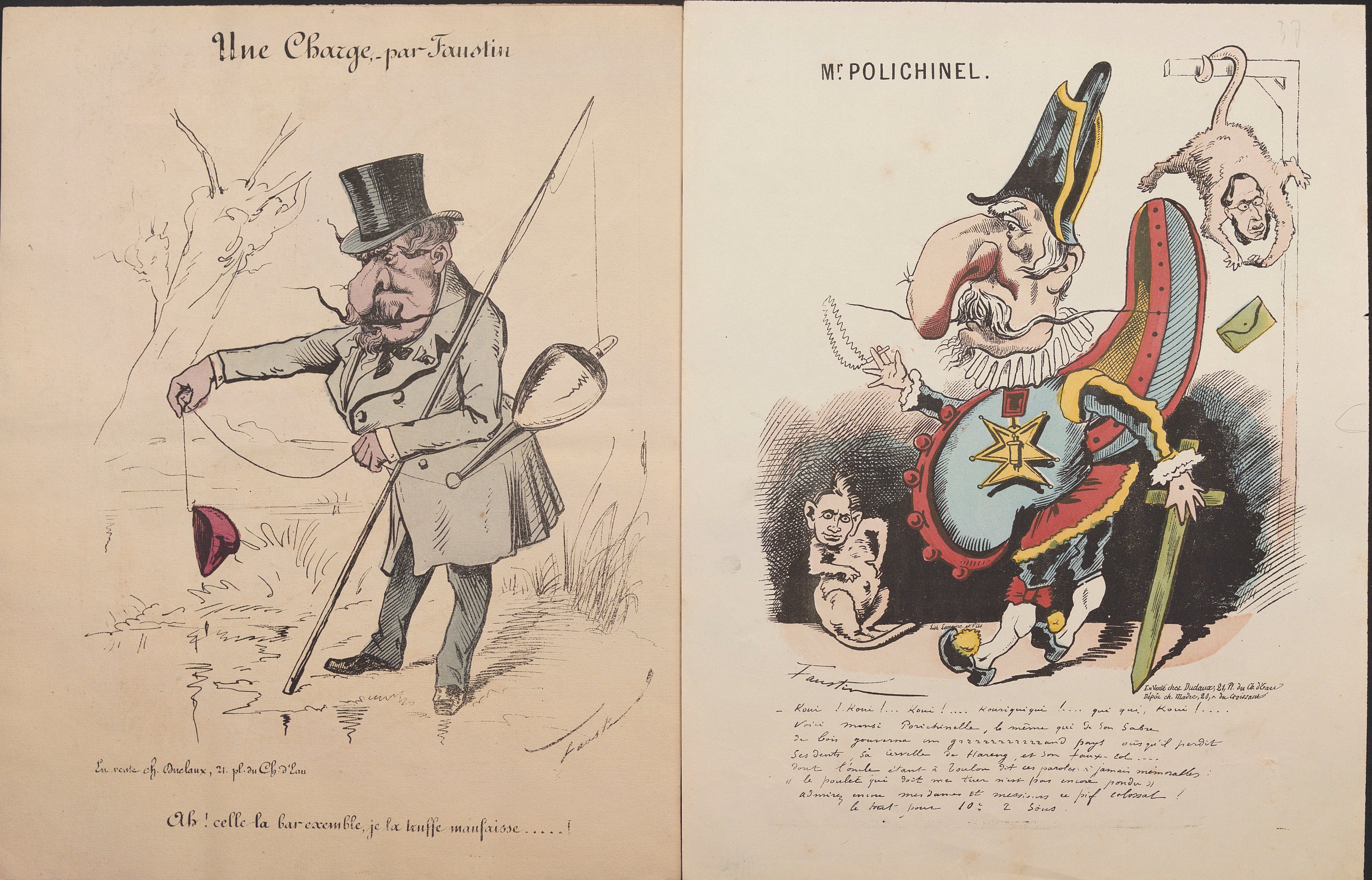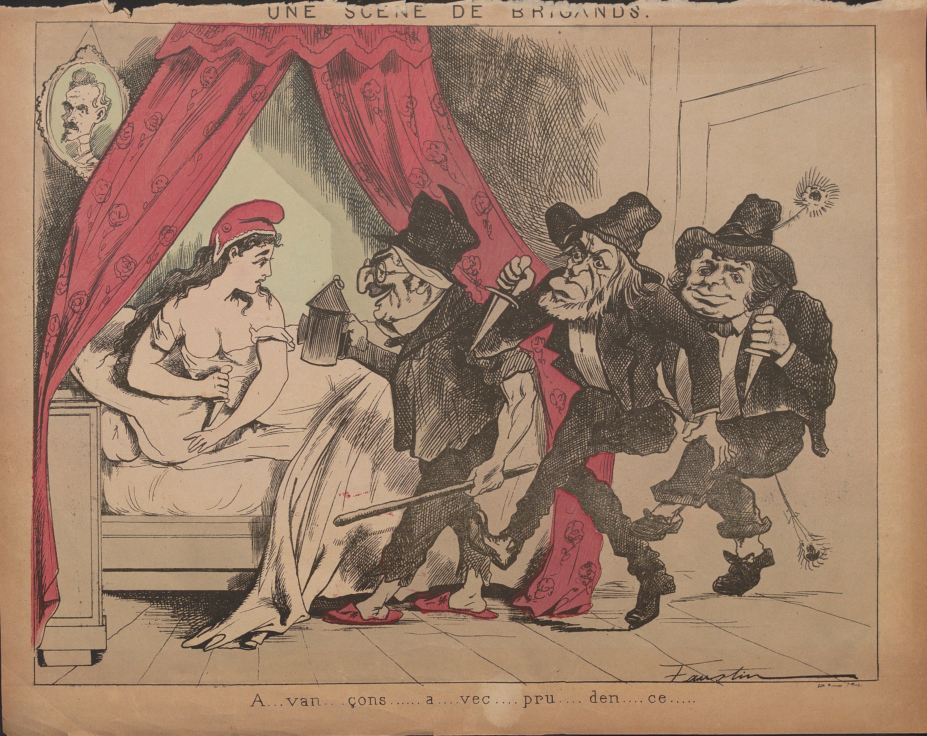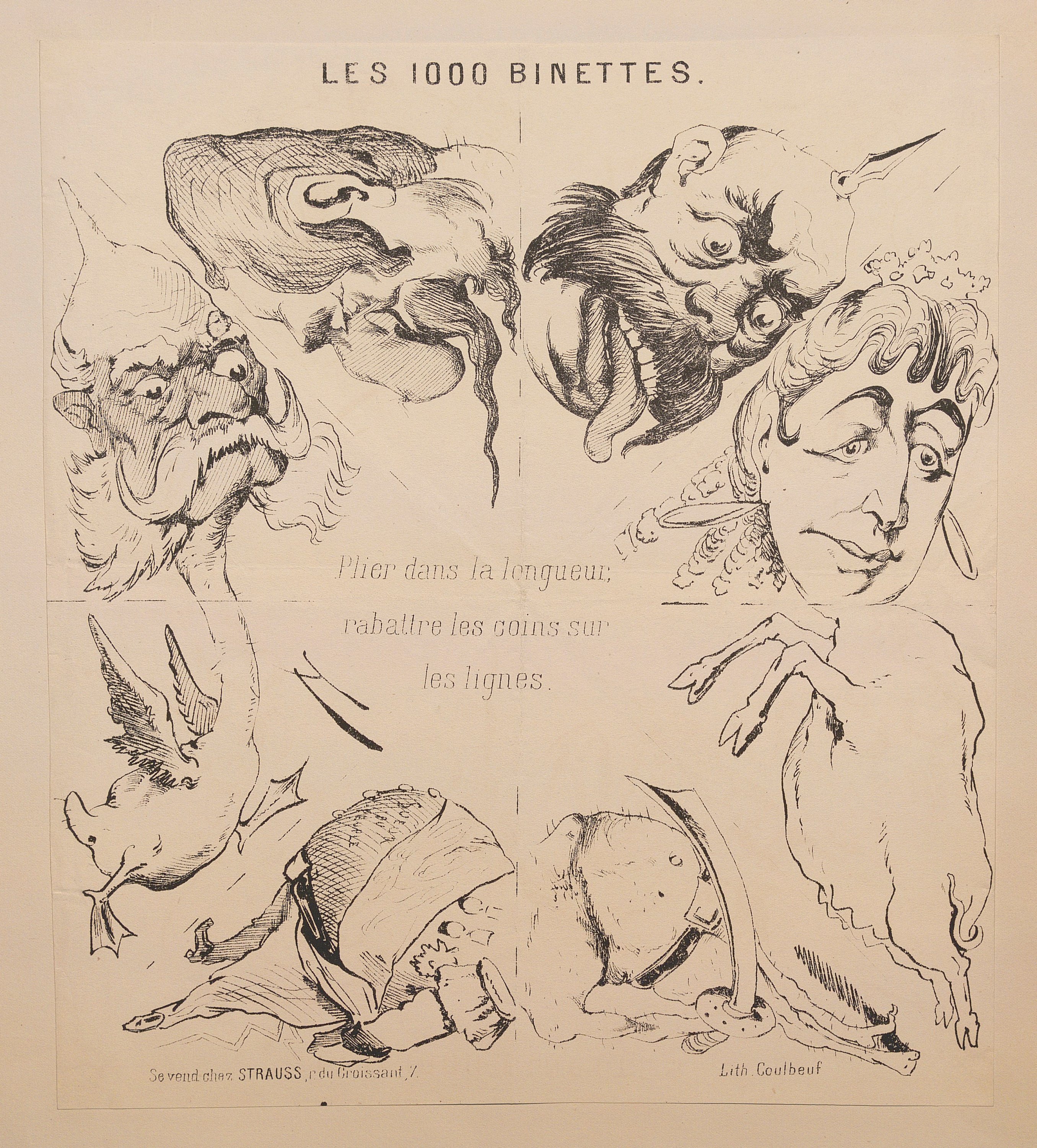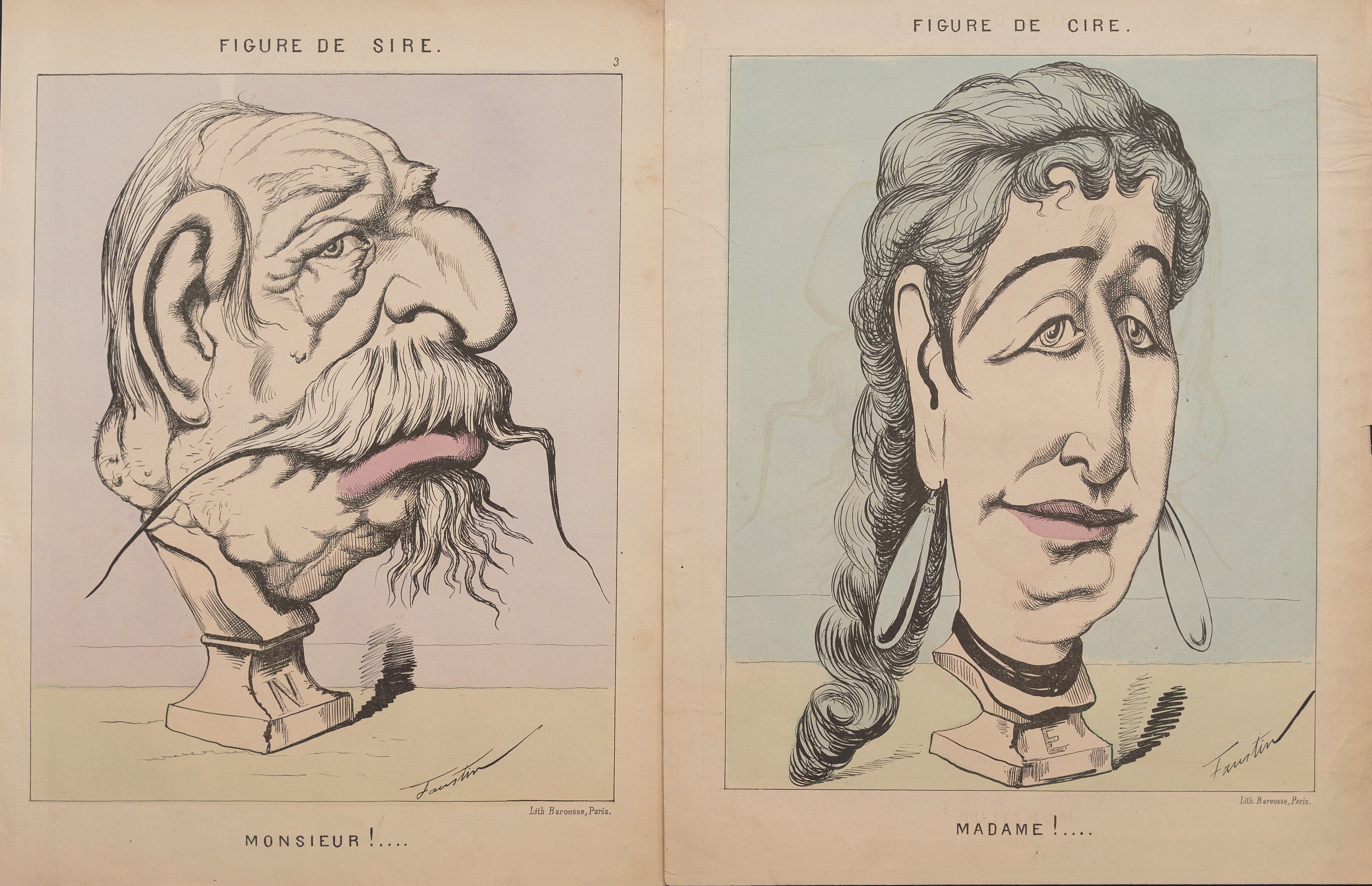 Imprimées par la Maison Barousse impr.-lithogr. cour du commerce Saint André à Paris et divers dont: Le châtiment, la seule colonne ; La Princesse Mathilde ; Les femmes d’église, Isabelle de Bourbon ; L’abbesse de Longchamps, Eugénie d’Espagne ; Les hommes d’église: Louis Veuillot ; Le révérend père Jules Favre ; Le jésuite Pinard ; Le vieux singe savant ; Une scène de brigands (en l’état) ; Les Trois Grâces ; Actualité, si l’on écoutait cas S atanées Républiques ; Actualité, pauvre Colombe! (rouss.) ; Actualité, la république saura bien leur échapper ; Le carnaval de cette année ; Clément Thomas ; Aux gardes nationaux de Paris, le commandant qu’il faut Garibaldi ; 1871 (petits déf.) ; Figure de Sire, Monsieur! ; Figure de cire, Madame! ; 14 ex. de la série Le Musée-Homme, tous différents ; Les nouveaux impôts ; série Paris Bloqué, n°11 à 23 ; etc ;