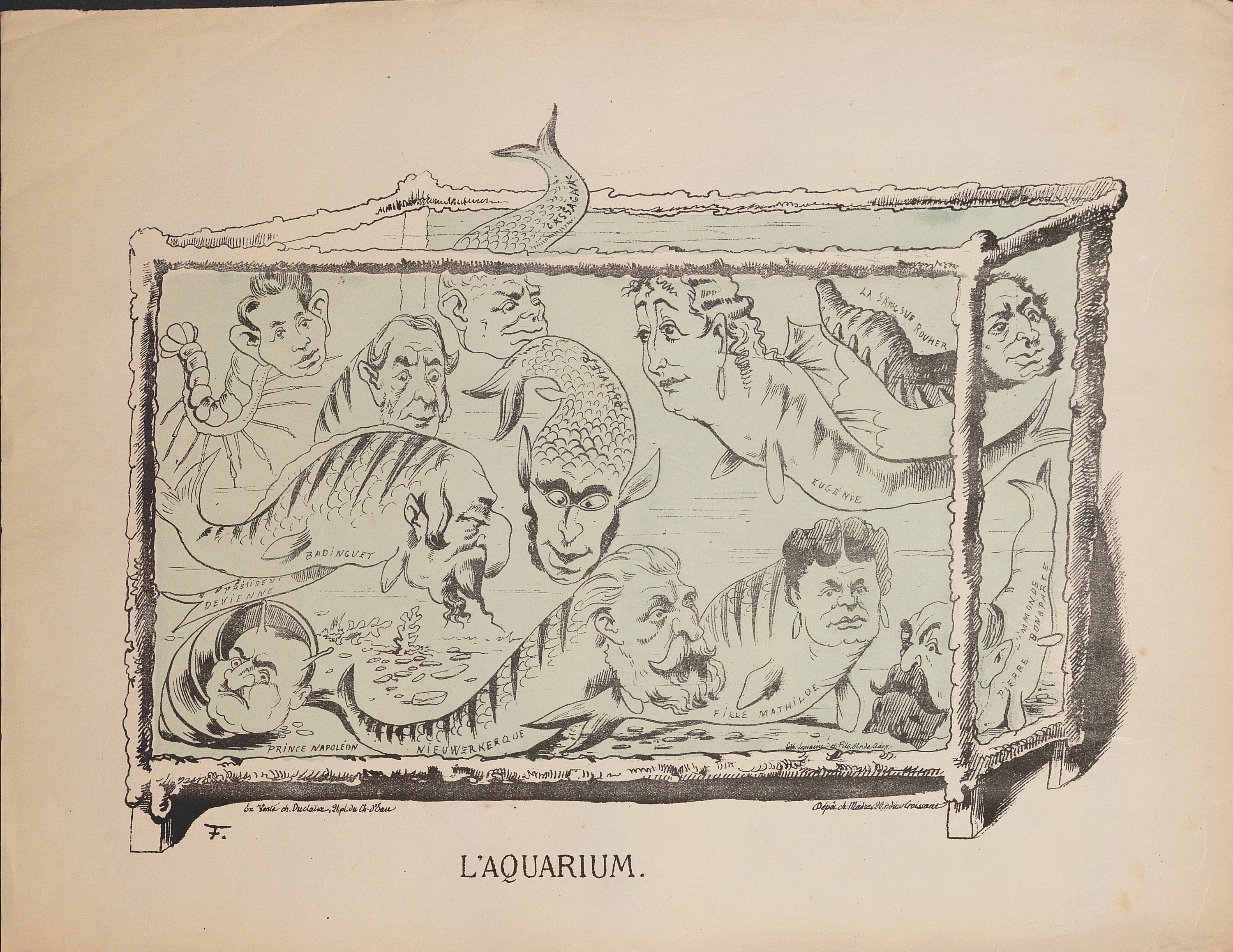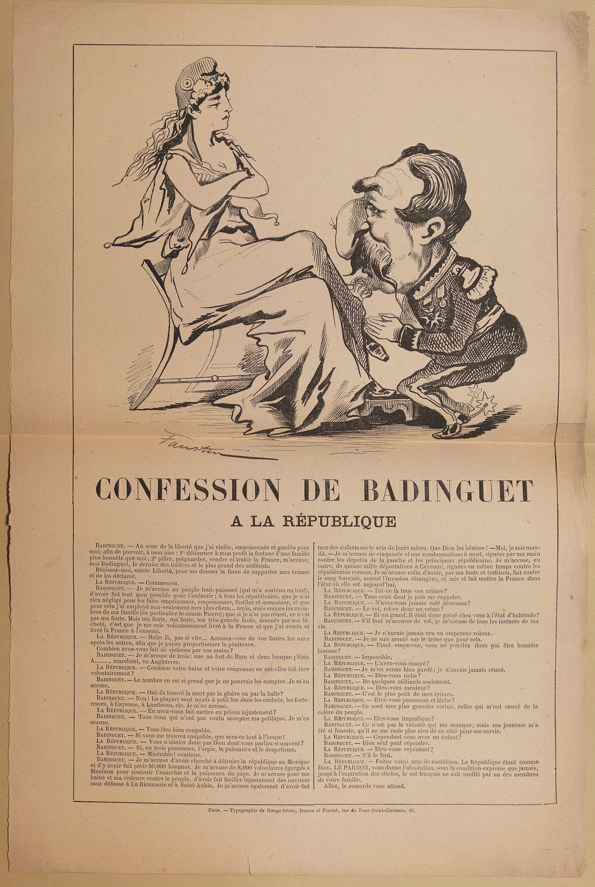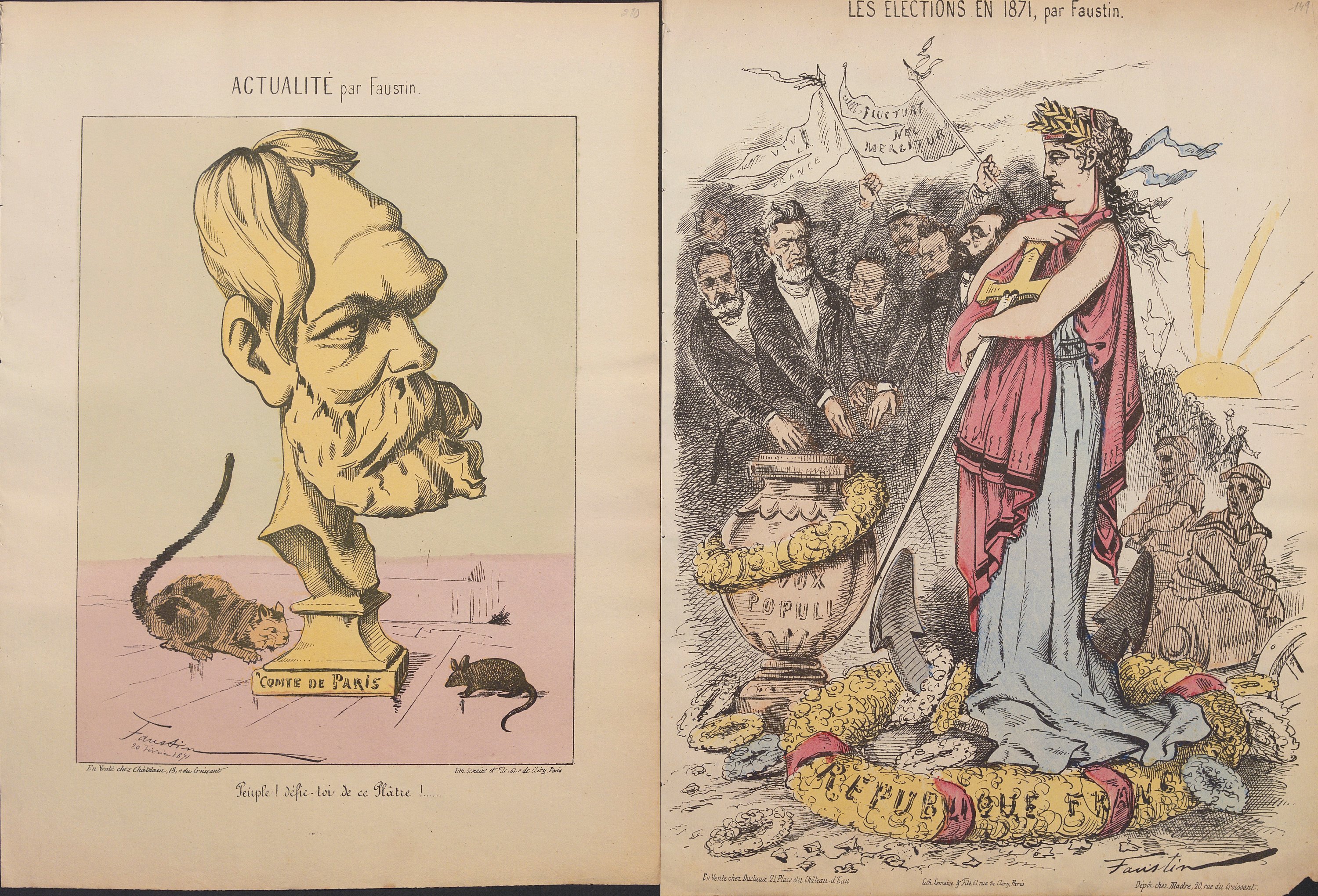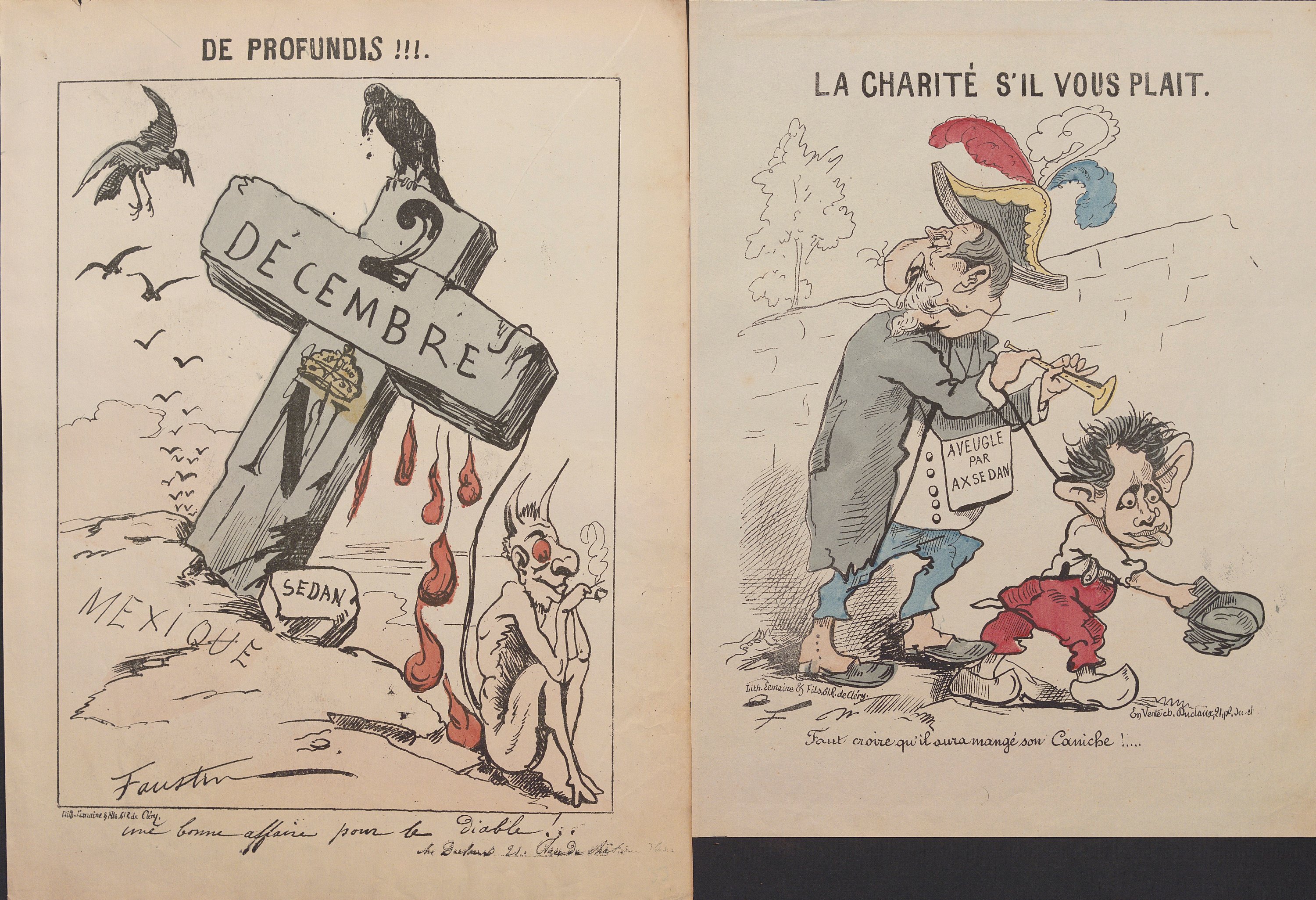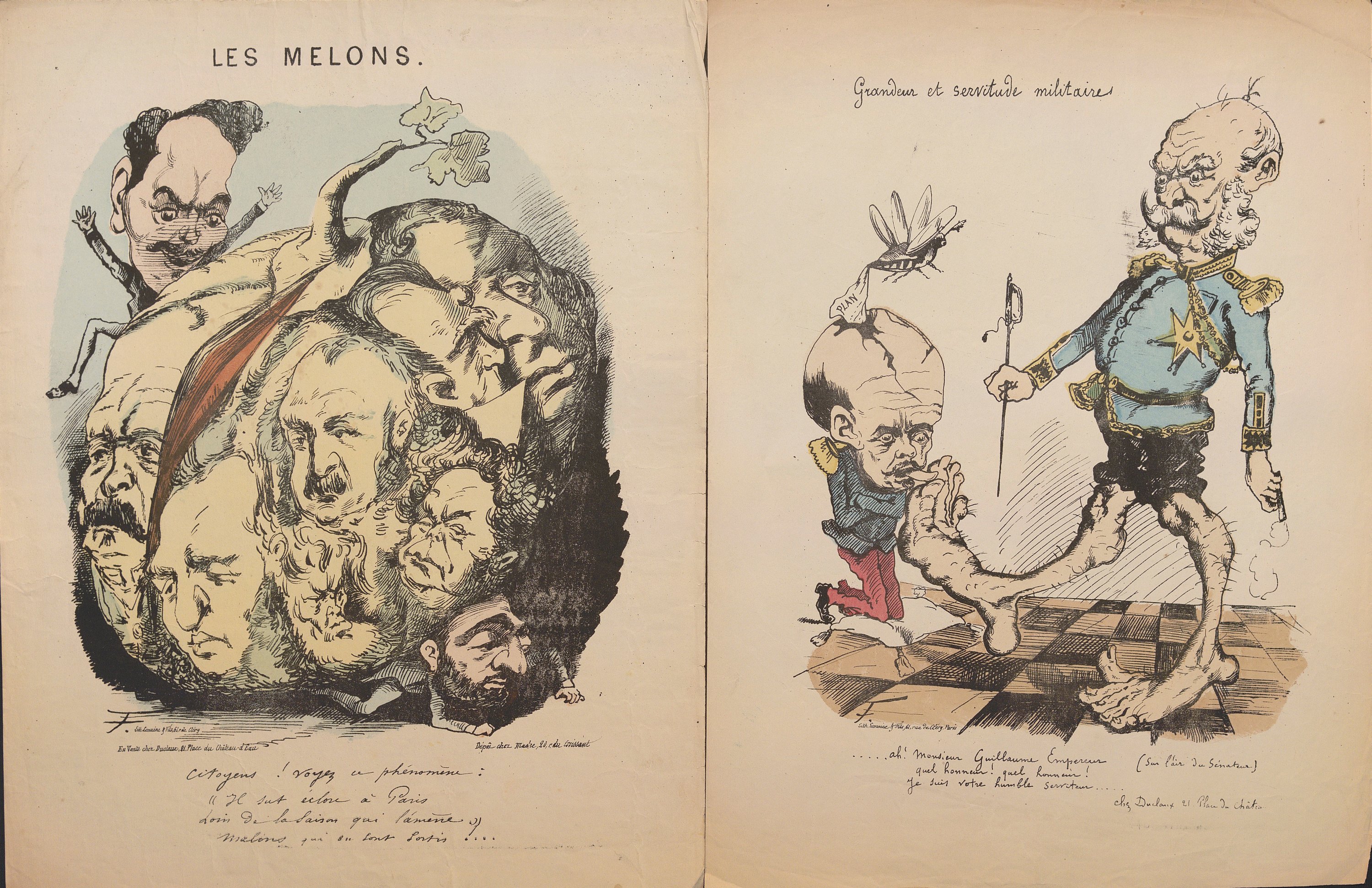 Imprimées par la Maison Lemaine et fils impr.-lithogr., 61 rue de Cléry à Paris et divers dont: St Pierre et St Badingue (2 ex. dont 1 à marges courtes) ; Le Sire de Fisch-Ton-Kan ; La charité s’il vous plait ; De Profundis ; Un animal à l’engrais ; Eugénie ou la nouvelle Susanne au bain ; L’Aquarium ; Le lièvre ; Grandeur et décadence ; Un sombre polichinel! ; Actualités, se demandant encore s’il va faire une dernière trouée ; Actualité, comment sortira-t-il de là!; Jadis et aujourd’hui (2 ex.) ; Grandeur et servitude militaire (2 ex. dont 1 à marges courtes) ; La clef de la situation ; Un cabinet ; Les melons (2 ex.) ; Entre diplomates ; La mère Thiers ; Les lapins d’Orléans ; Actualité, Peuple! Défie-toi de ce plâtre! ; Actualité, Thiers et la République ; Actualité, le frère à Arthur! ; A Augusta impératrice de toutes les Prusses ; Etrennes utiles ; Victor Hugo ; Les élections en 1871 ; Badingue chez le bon dieu ; Figures contemporaines, Le Généralllll Changarnier! ; Figures contemporaines, Thiers ; 5 ex. de la série Nos grands généraux: Ducrot, Garibaldi, Chanzy, Vinoy ; 2 ex. de la série Le Musée comique ; série Paris bloqué, n°1 au n°10 ; série Tableau de Paris , n°1 à 3 ;