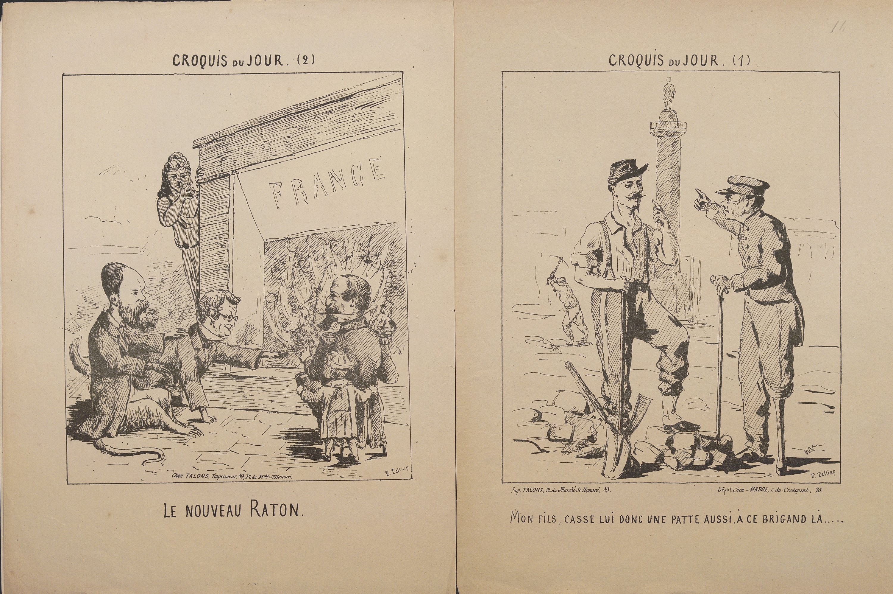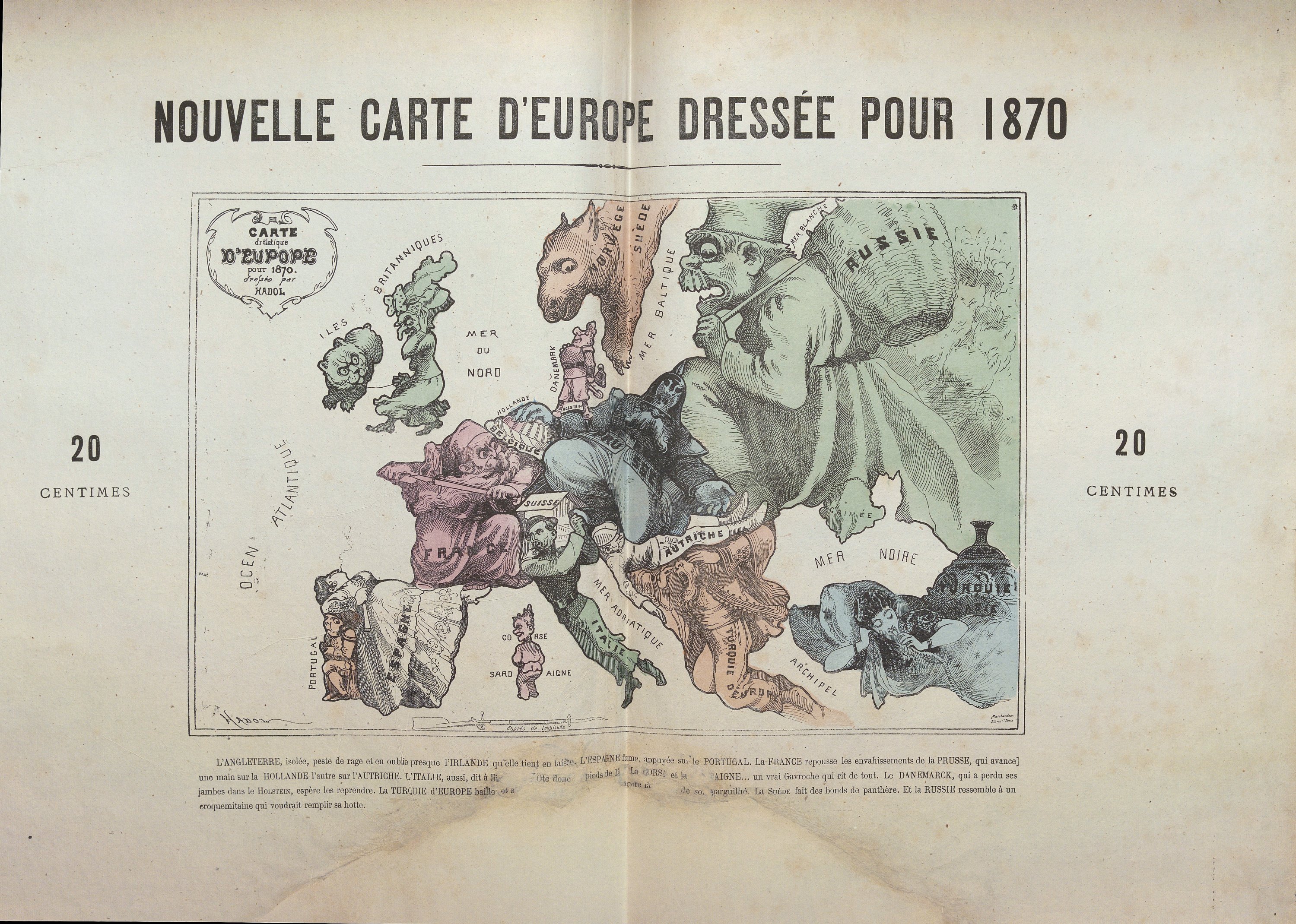 Paul Hadol (1835-1875): Nouvelle Carte d'Europe dressée pour 1870. Célèbre carte d'Europe satirique et anthropomorphe pour l'année 1870 Lithographie sur papier vélin à rehauts de couleurs d’époque, impr. par Vallée, 16 rue du Croissant à Paris, toutes marges, 43,5 x 61,5 cm (rest. avec perte de quelques mots dans la légende) ; La complainte de Badinguet [chanson], 34 x 48 cm (petits défauts) ; Série La Ménagerie impériale, incomplet, 23 n°/31, formats et états divers.
