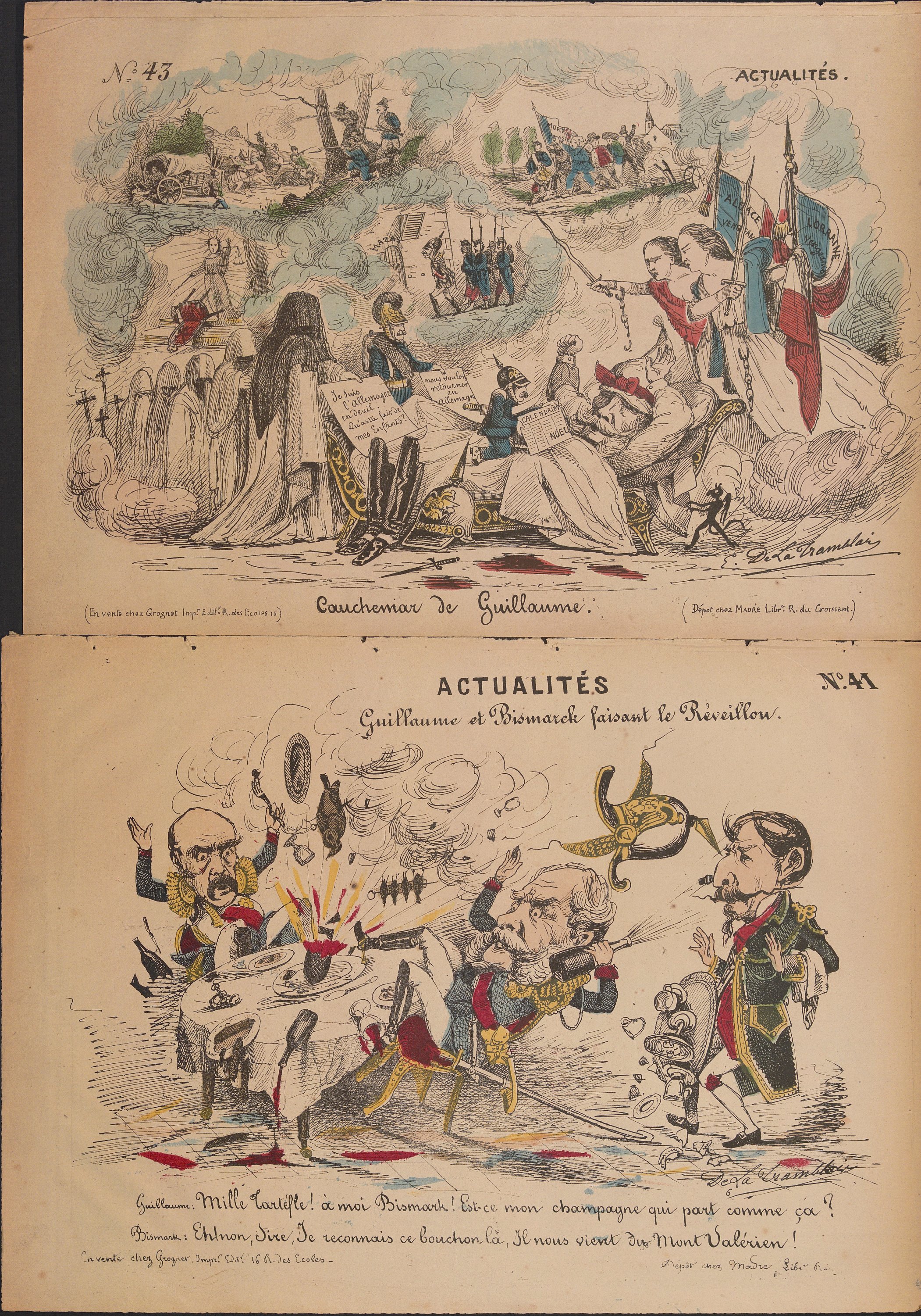 « Actualités », série quasi-complète n°1 au n°87 (mque 79, 80, 82, 83 et 87), formats divers ; feuilles volantes illustrées par différents dessinateurs/illustrateurs publiées et vendues dès le début de la guerre de 1870 jusqu’à la fin de la Commune de Paris ;